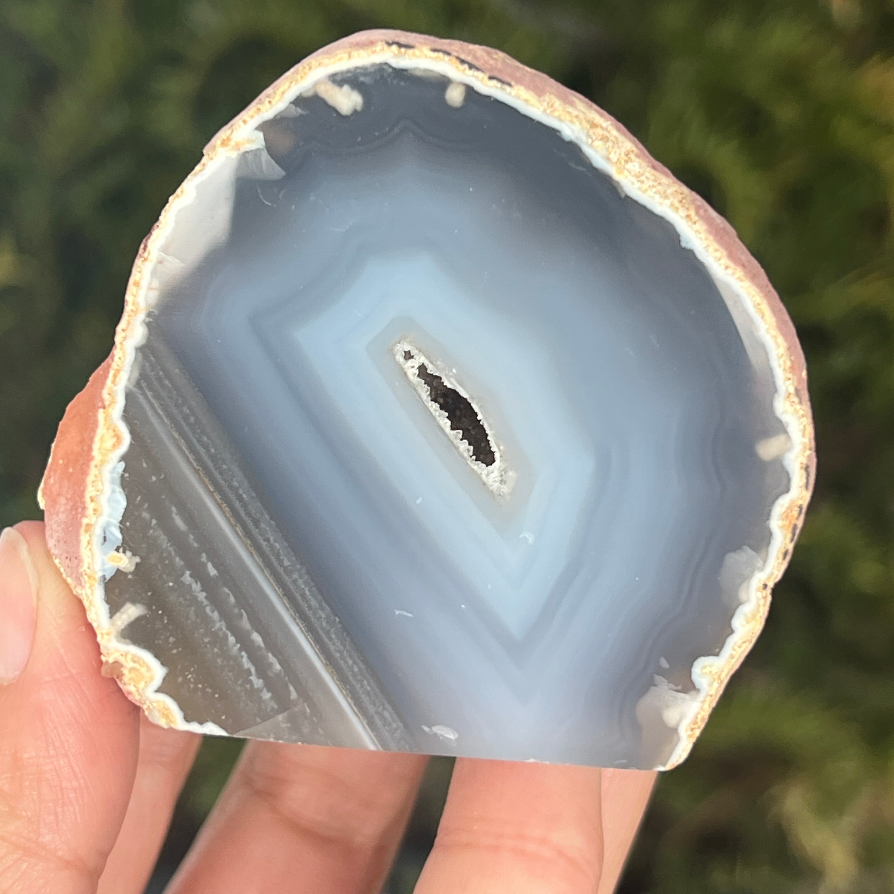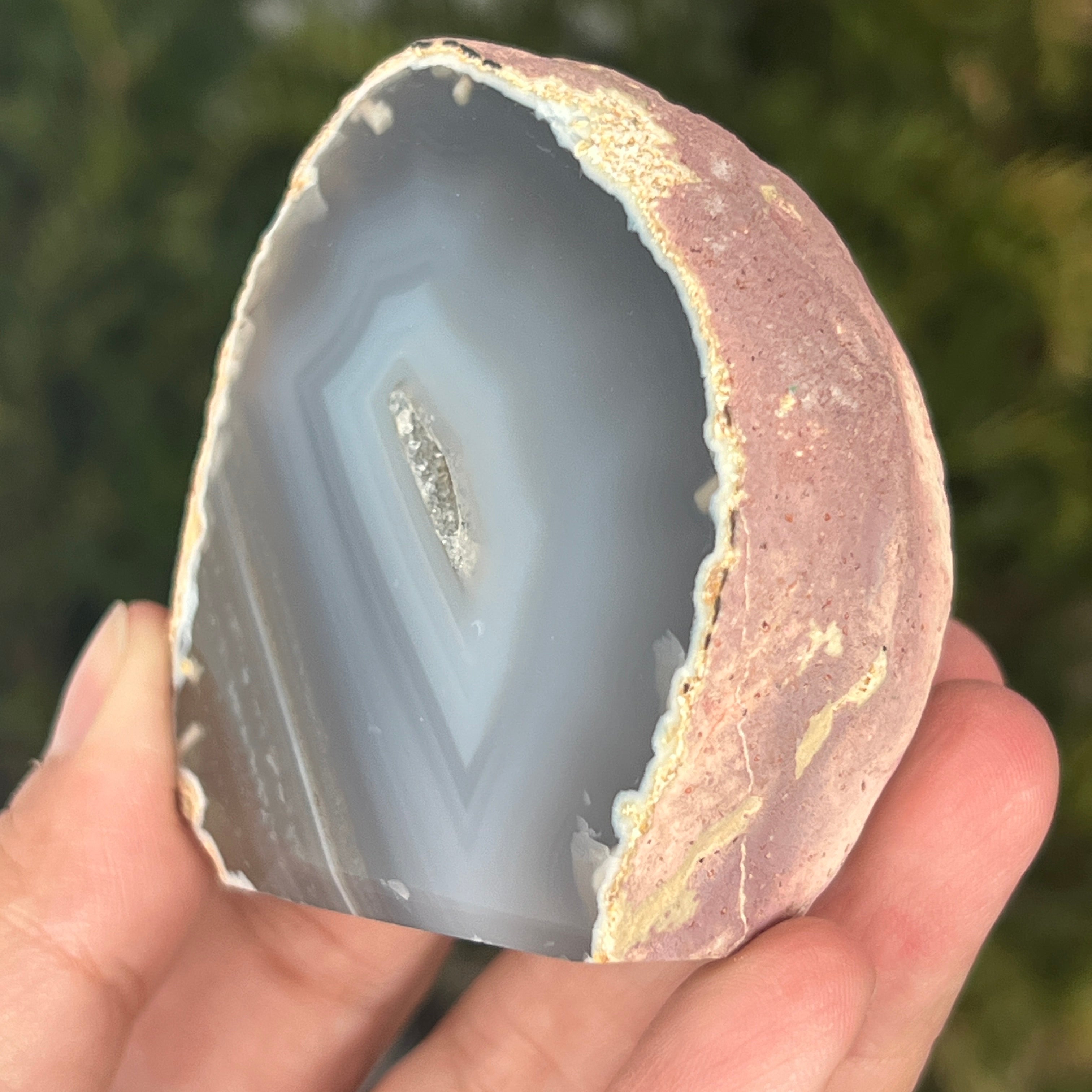 Naturalny szary agat to odmiana chalcedonu, mikrokryształowej formy kwarcu charakteryzującej się delikatnymi pasmami powstającymi naturalnie w próżniach wulkanicznych. Jego neutralne odcienie podkreślają autentyczną strukturę mineralną i dyskretną elegancję kamienia. Jest ceniony zarówno za naturalny wygląd, jak i symbolikę związaną ze stabilnością i równowagą.