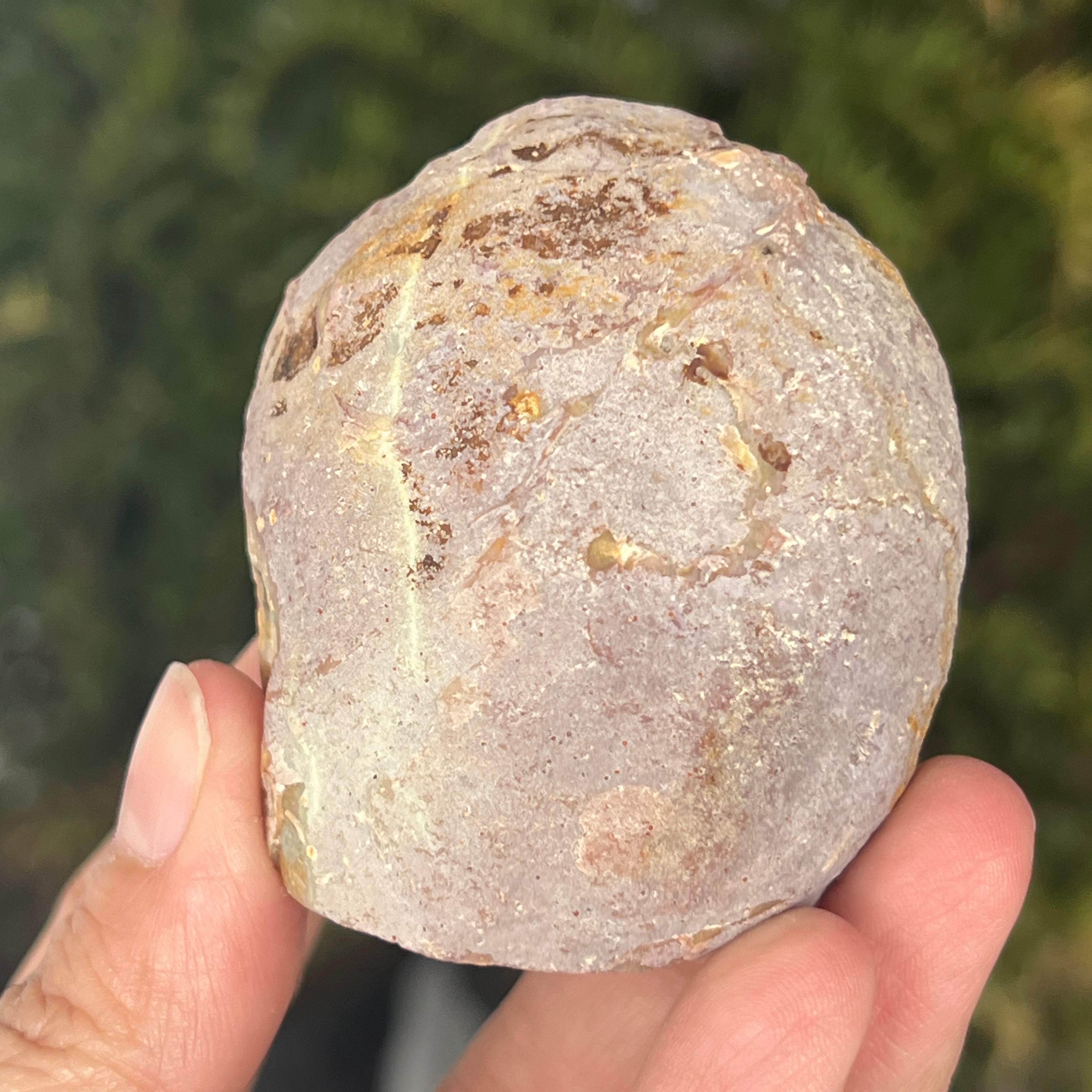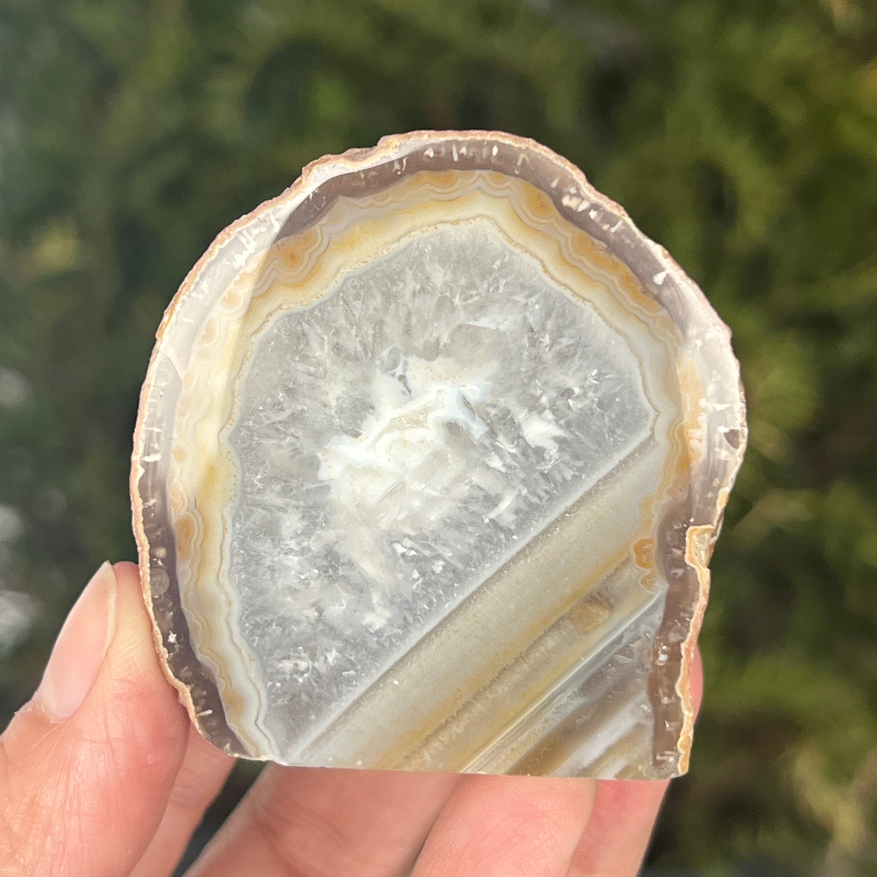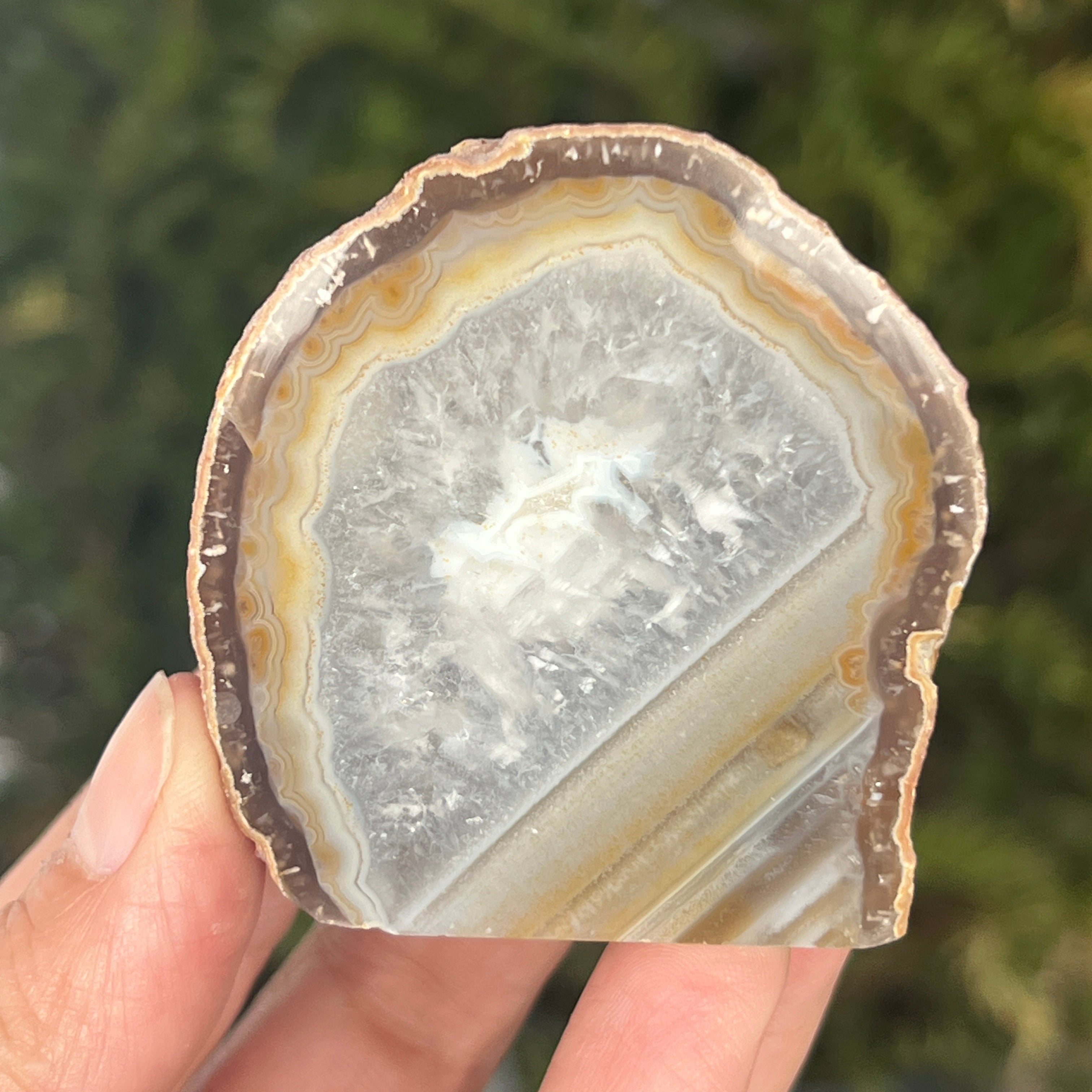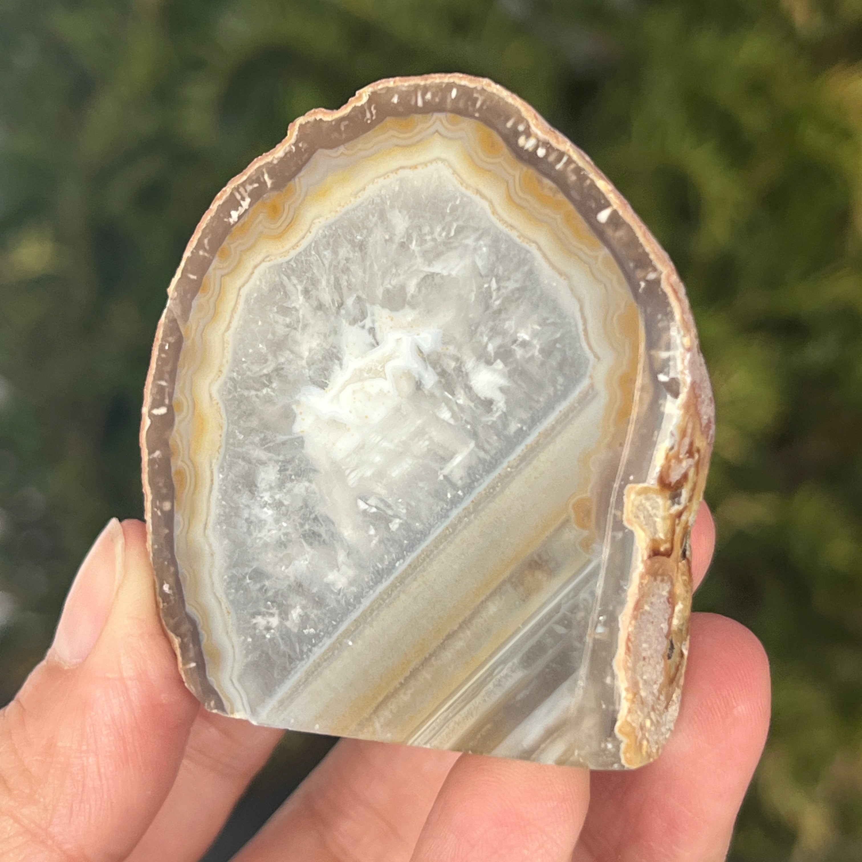 Naturalny szary agat to odmiana chalcedonu, mikrokryształowej formy kwarcu charakteryzującej się delikatnymi pasmami powstającymi naturalnie w kawernach wulkanicznych. Jego neutralne odcienie podkreślają autentyczną strukturę minerału i subtelną elegancję kamienia. Jest ceniony zarówno za naturalny wygląd, jak i symbolikę związaną ze stabilnością i równowagą.