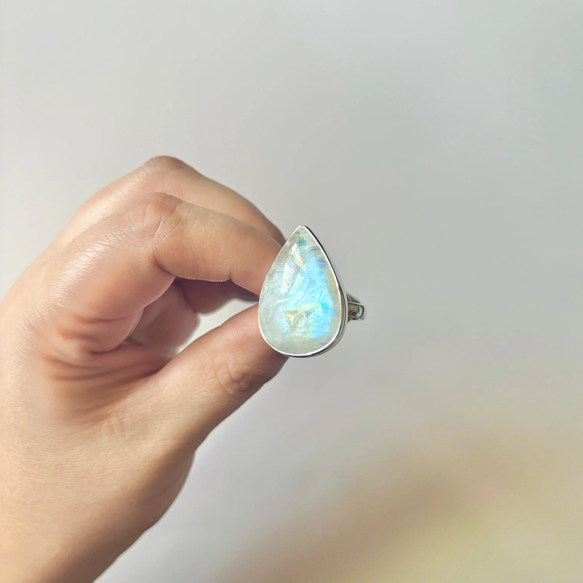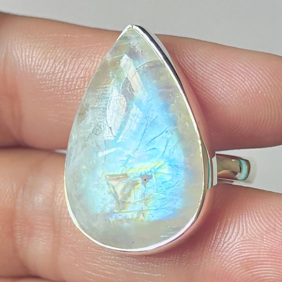 Ten pierścień 925 srebra z naturalnym miesiącem w postaci kropli To wyjątkowy klejnot, który łączy elegancję obsługiwanej ręcznie ze spektakularną lekką grą kryształu. Niebieskie refleksy i boczne przekształcają każdy kąt światła w fascynujące wrażenia wizualne.