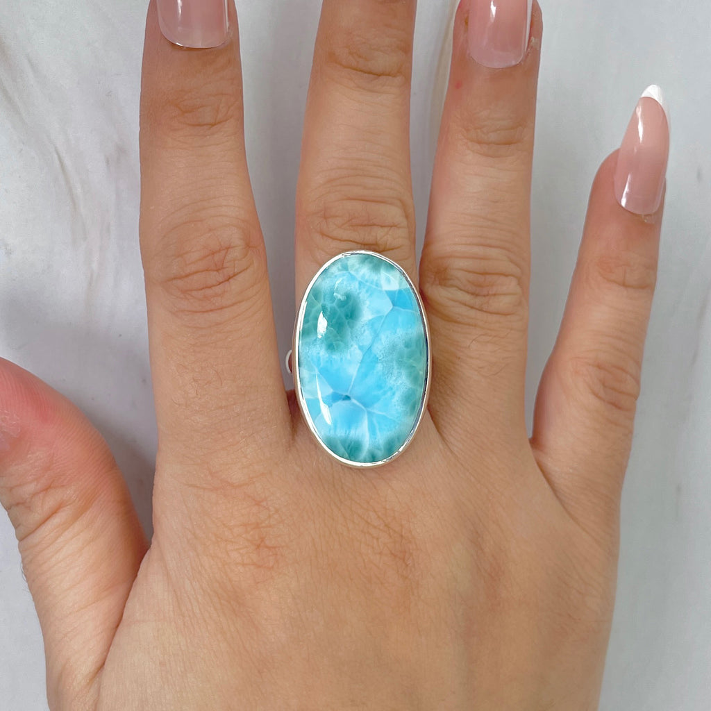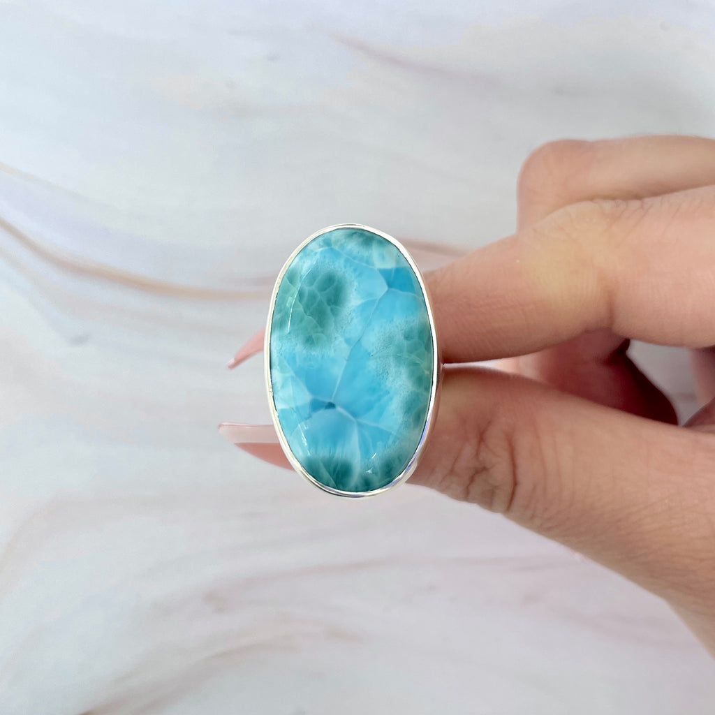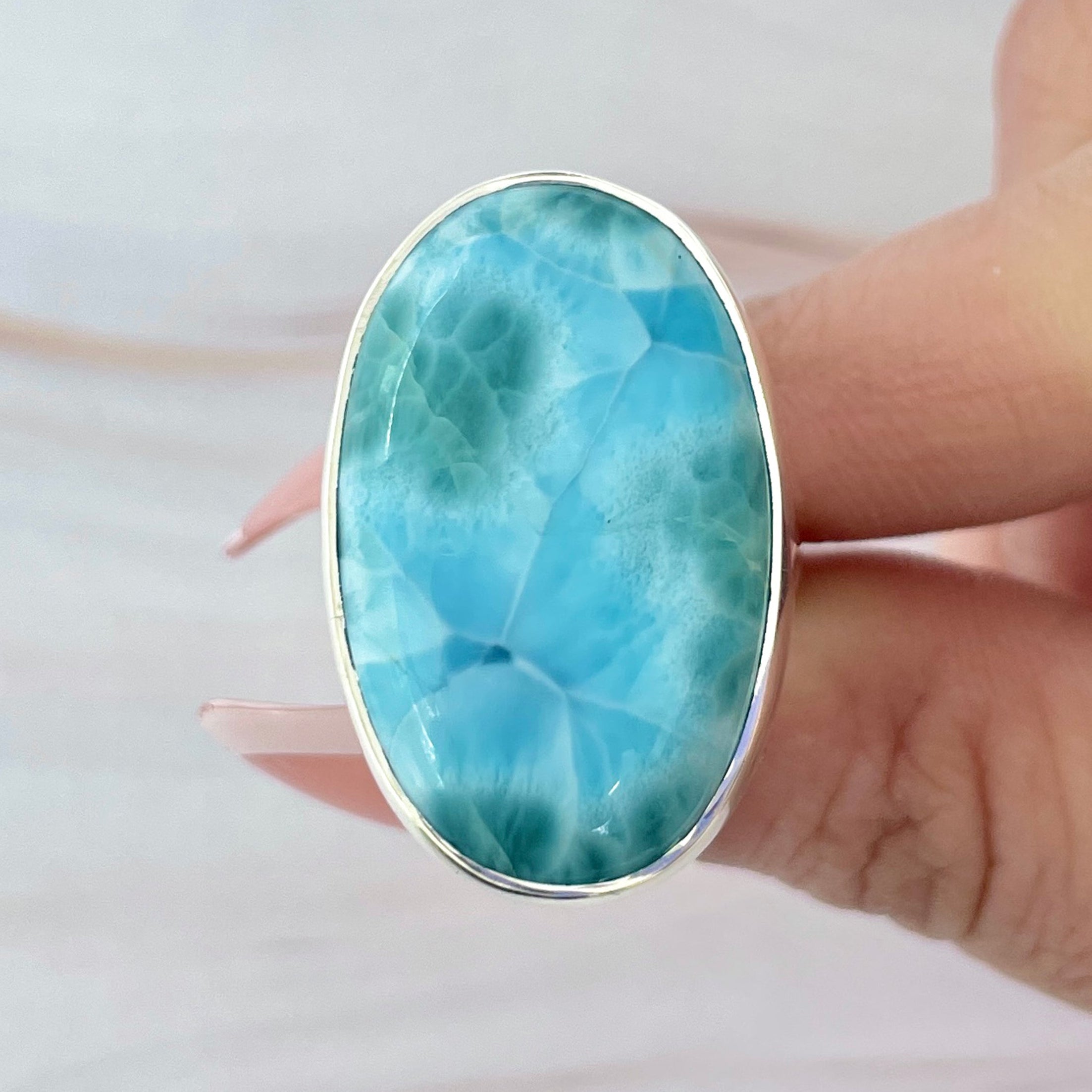 Wybierz ten pierścionek z naturalnym Larimarem, aby zabrać ze sobą spokój oceanu i wyjątkową energię rzadkiego kamienia - eleganckiego klejnotu, zrodzonego z natury i przemienionego w sztukę.