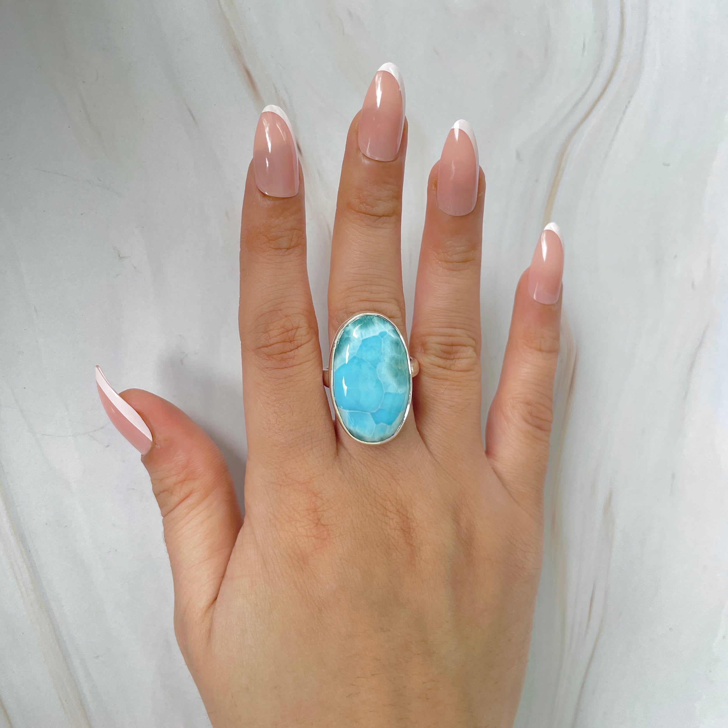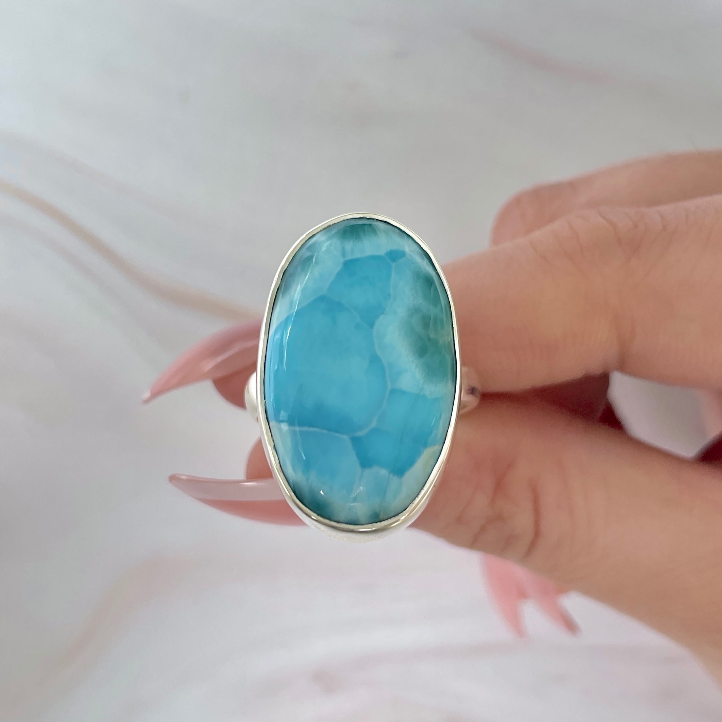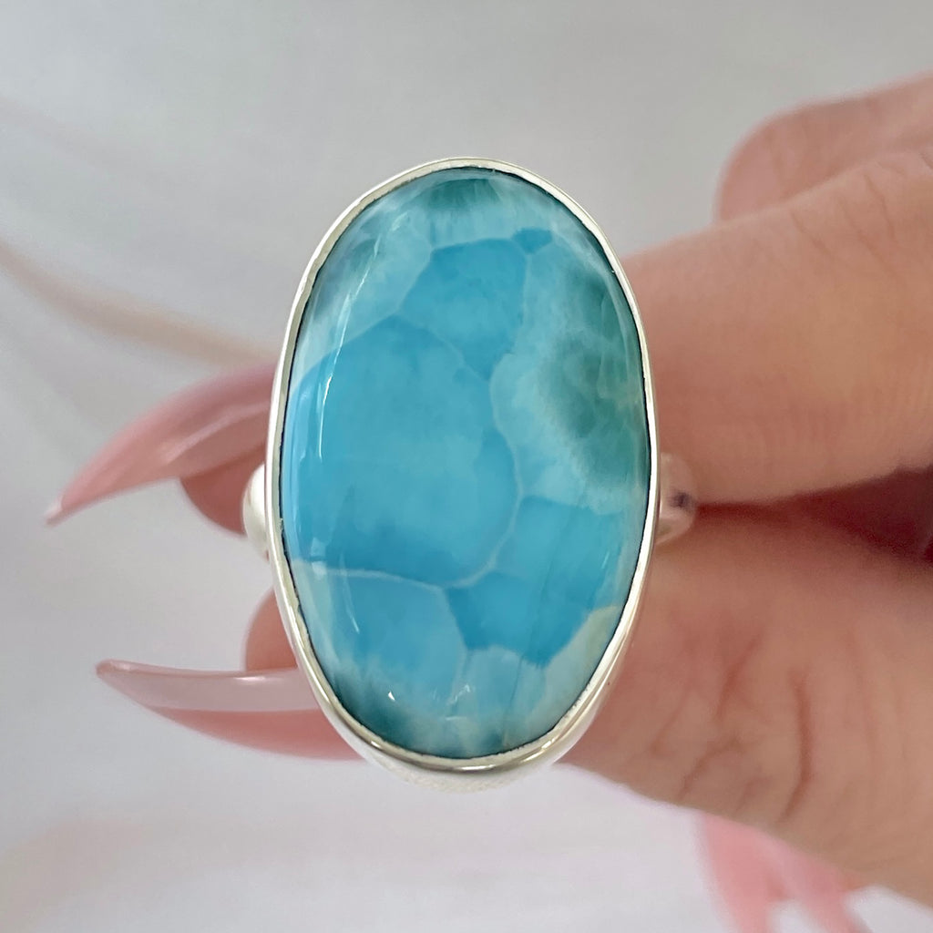 Wyjątkowy pierścionek wykonany z naturalnego larimaru, zwany prostym kamień nieba i oceanu. Jego odcienie błękitu morskiego z białymi refleksami niczym fale morskie przynoszą wewnętrzny spokój i poczucie nieskończonej wolności.