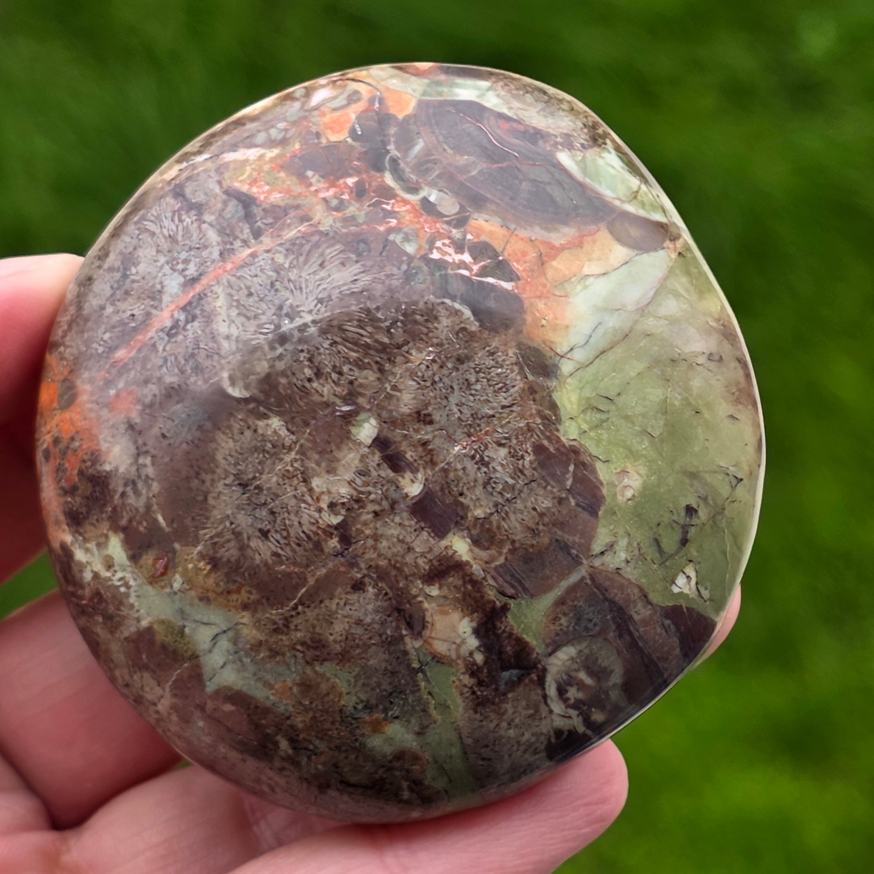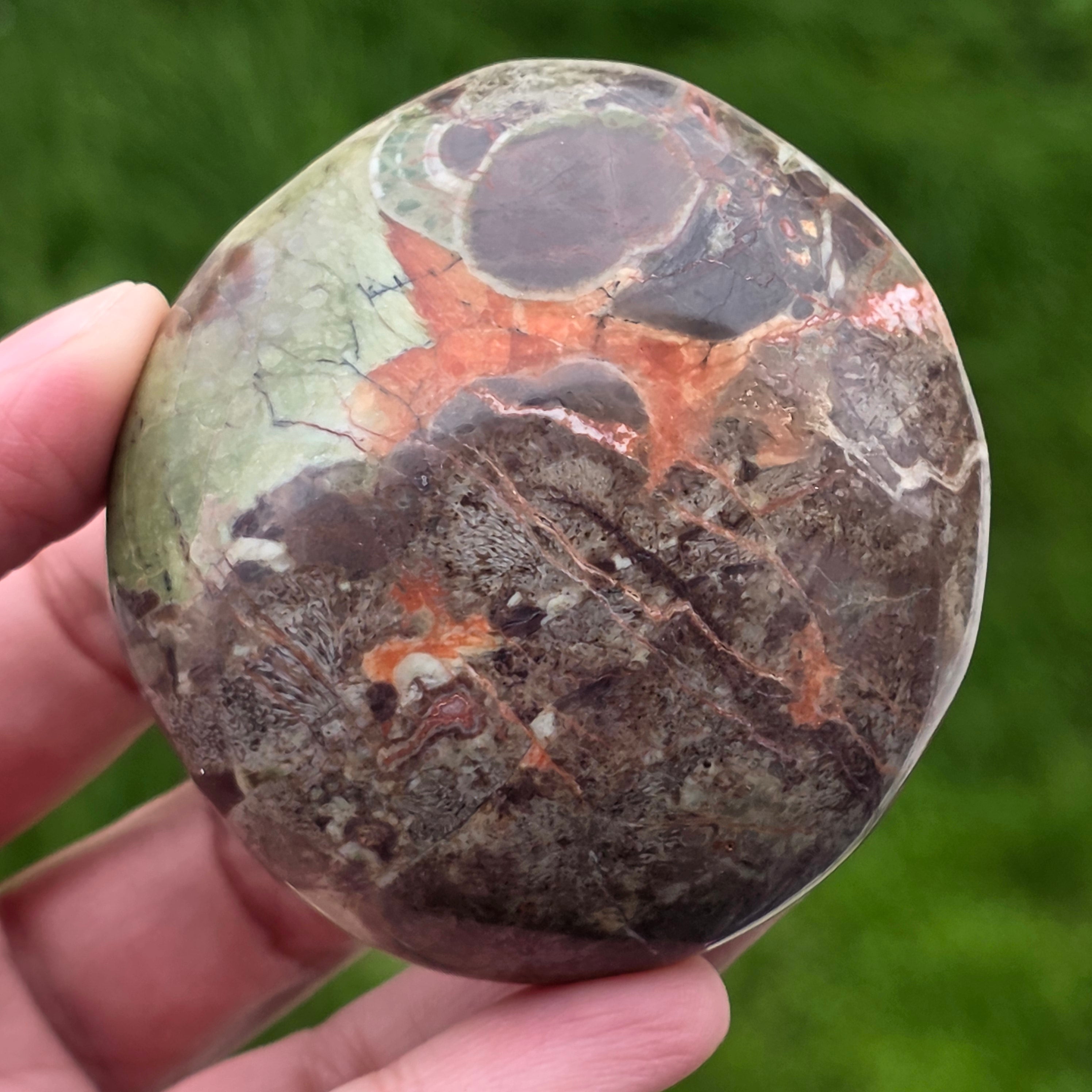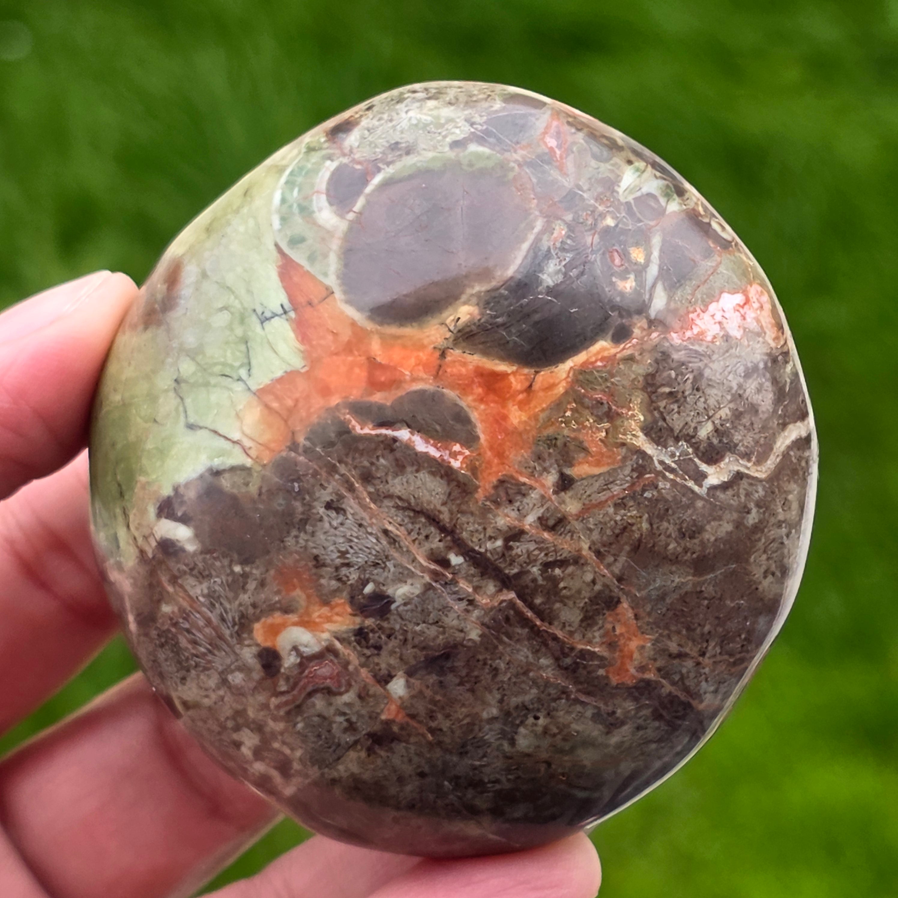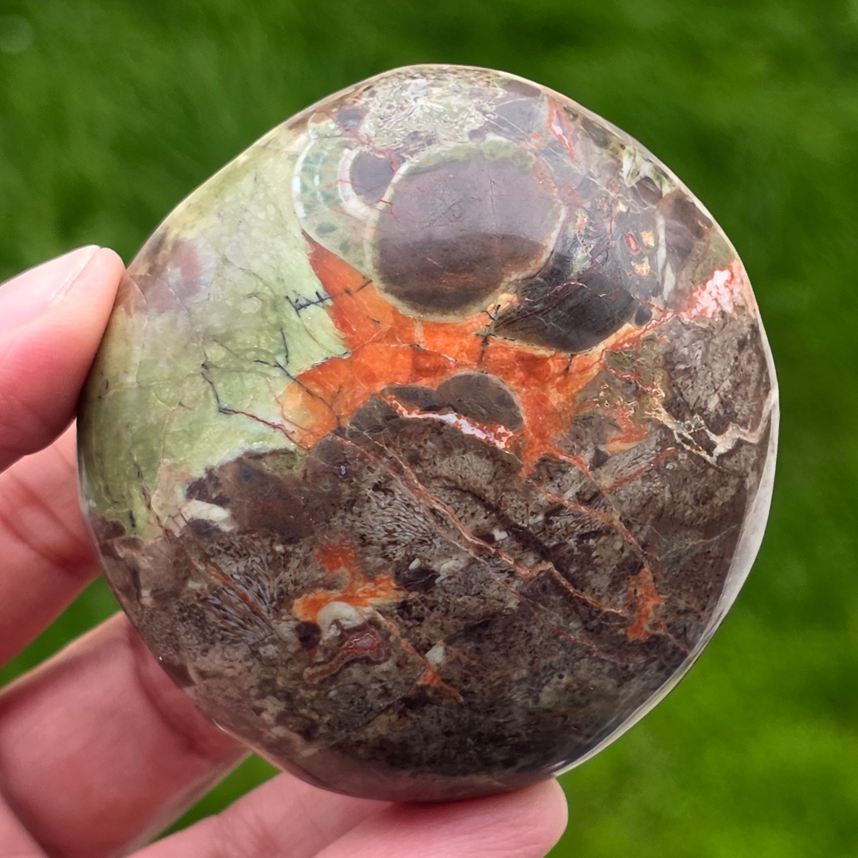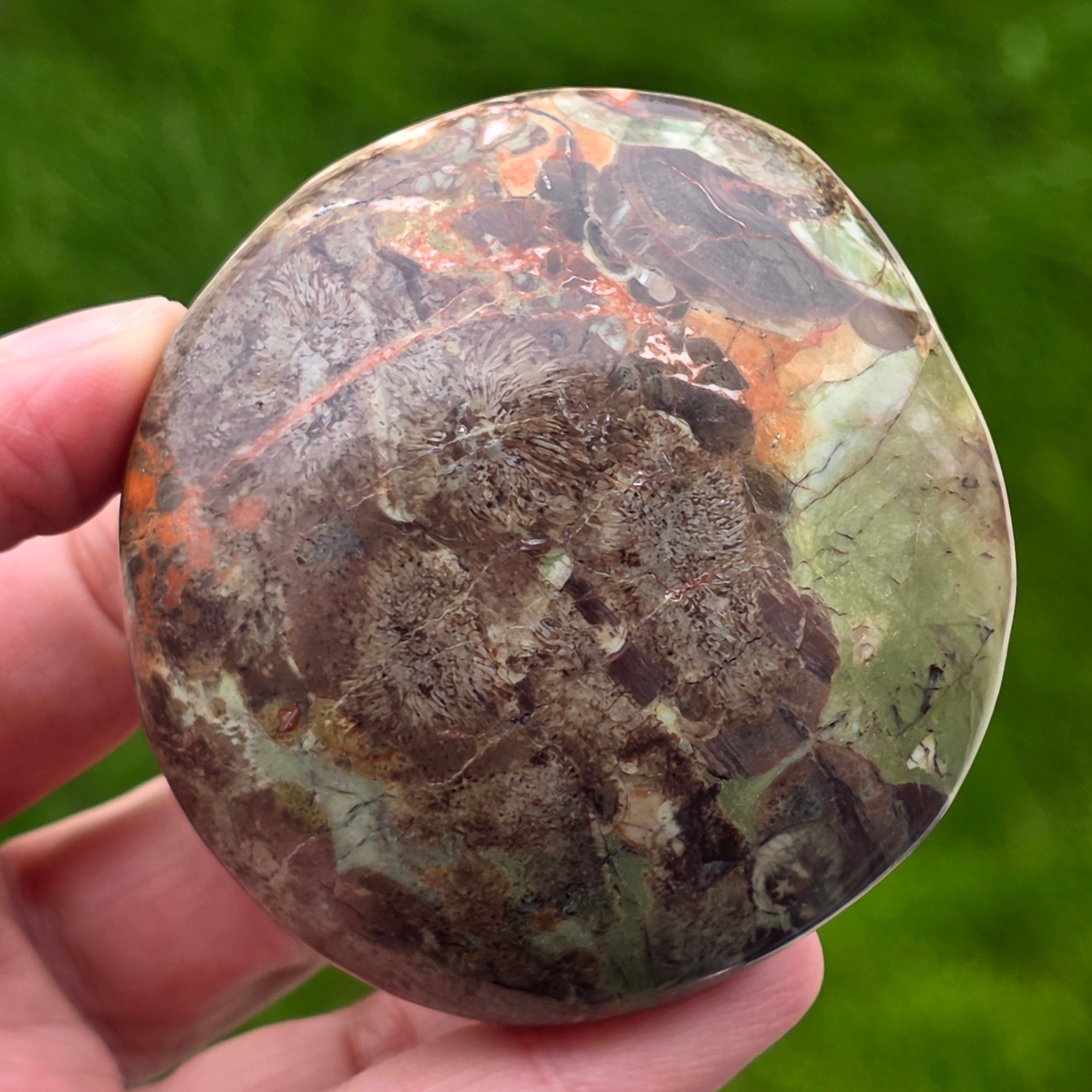 Ten starannie wypolerowany kamień idealnie leży w dłoni, niosąc w sobie cichą energię gór i siłę świata ukształtowanego przez ogień. Górski ryolit z ciepłymi odcieniami brązu, akcentami mineralnej zieleni i opalizacją wulkanicznego pomarańczu kojarzy się z gęstymi lasami, wilgotną ziemią i płonącym niebem o zachodzie słońca.
