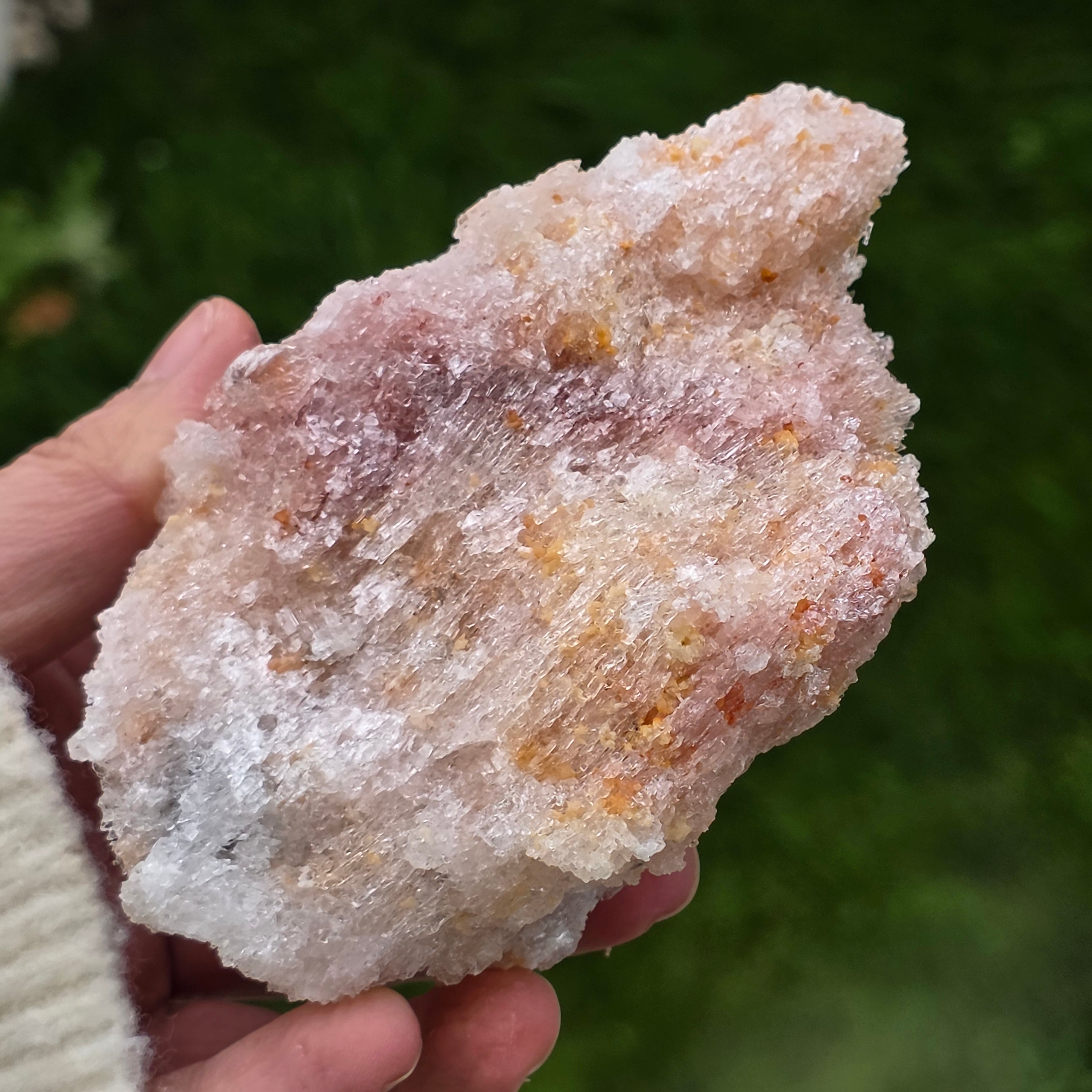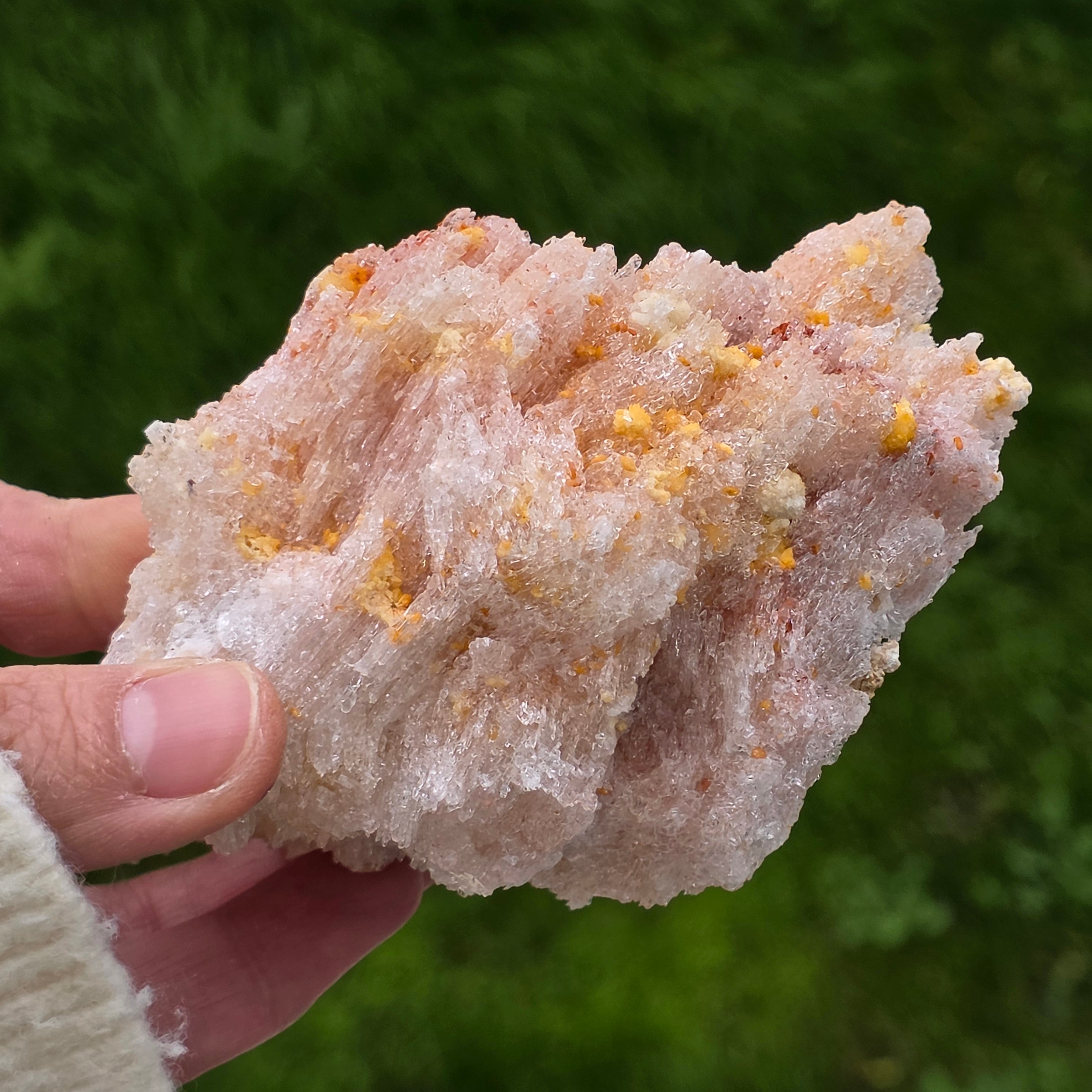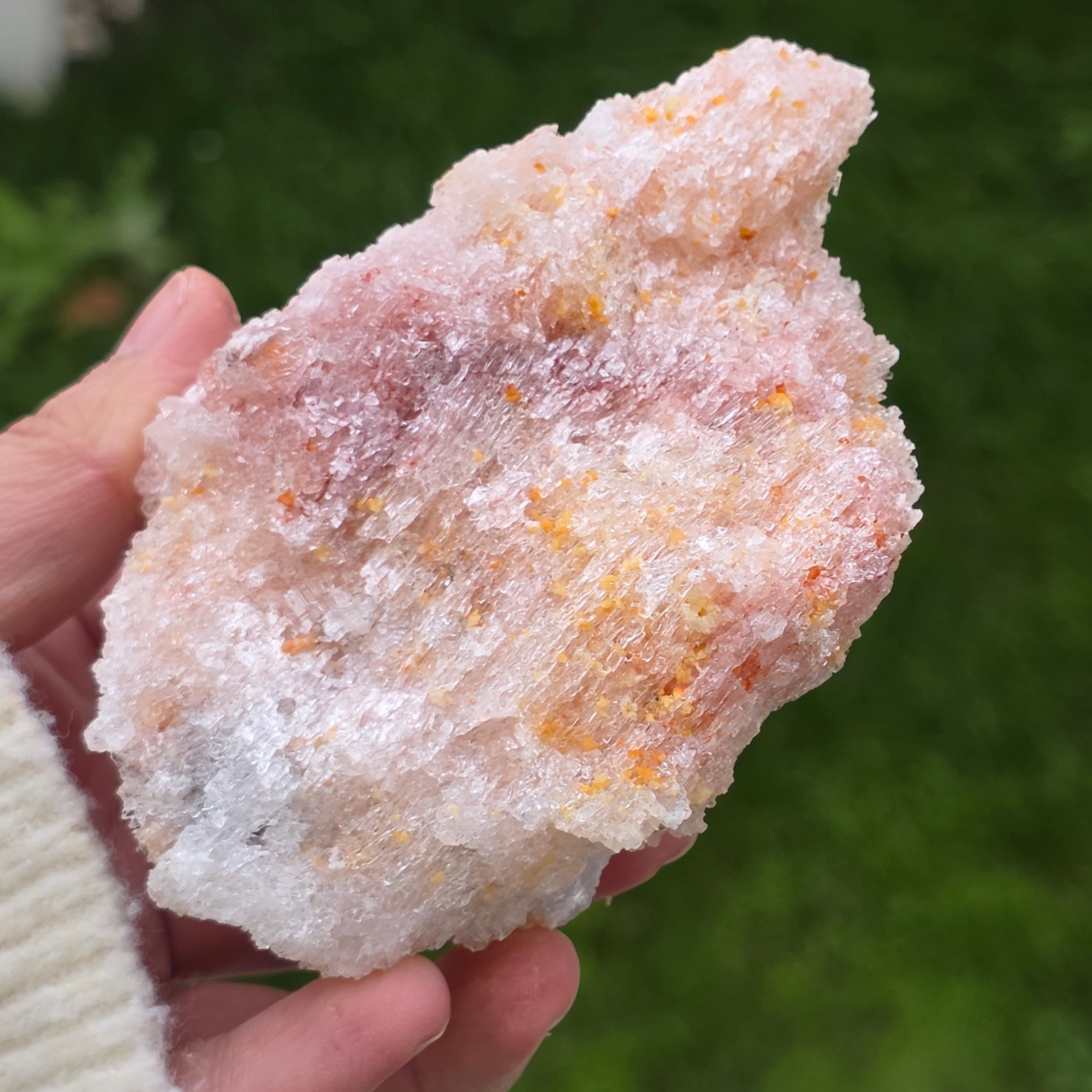 Rezultatul este o asociere mineralogică coerentă, în care matricea alb-translucidă de selenit este traversată sau punctată de incluziuni roșii de cinabar, fără delimitări artificiale. Cele două minerale sunt intim legate structural și vizual, cinabarul accentuând forma și transparența selenitului, iar selenitul punând în evidență culoarea intensă a cinabarului.