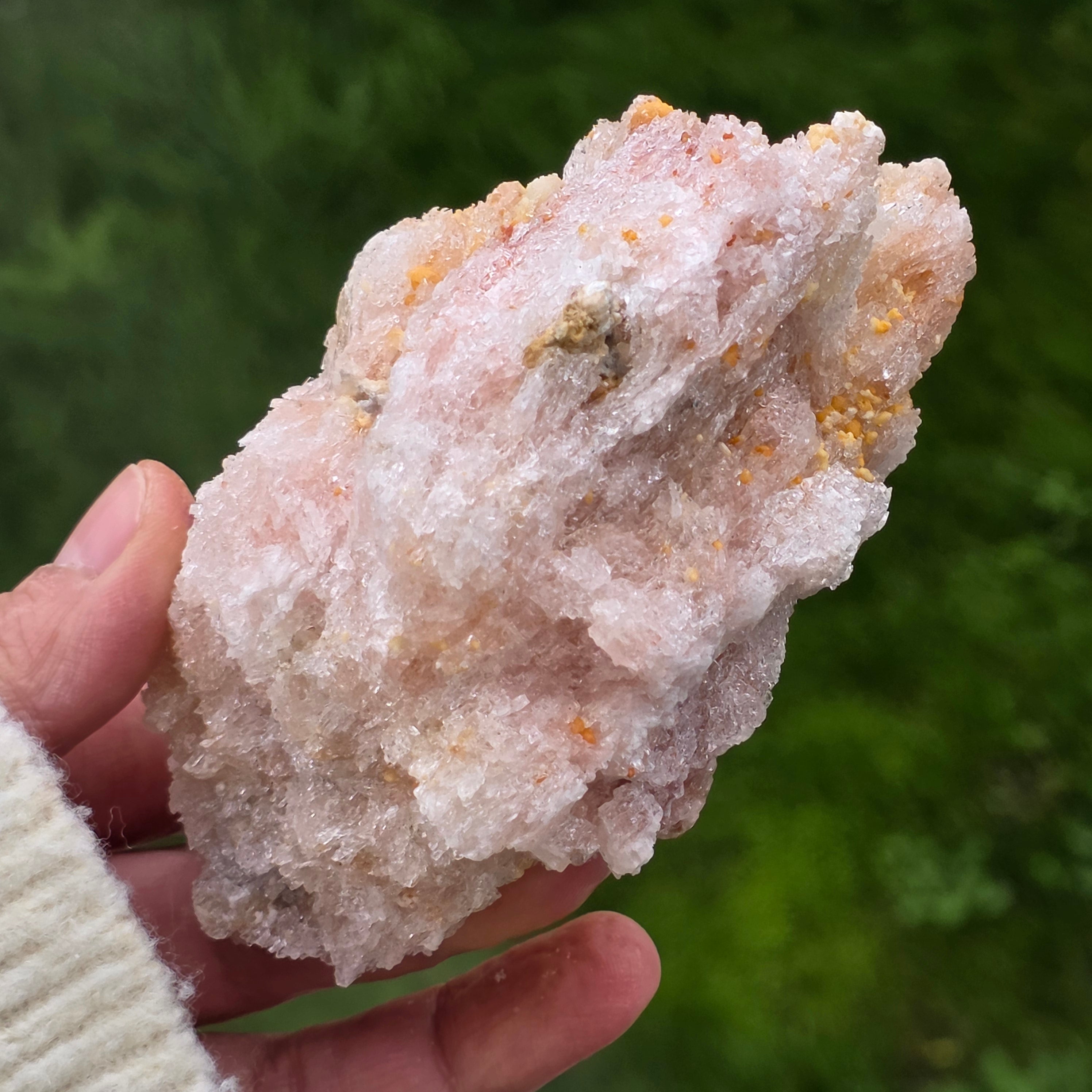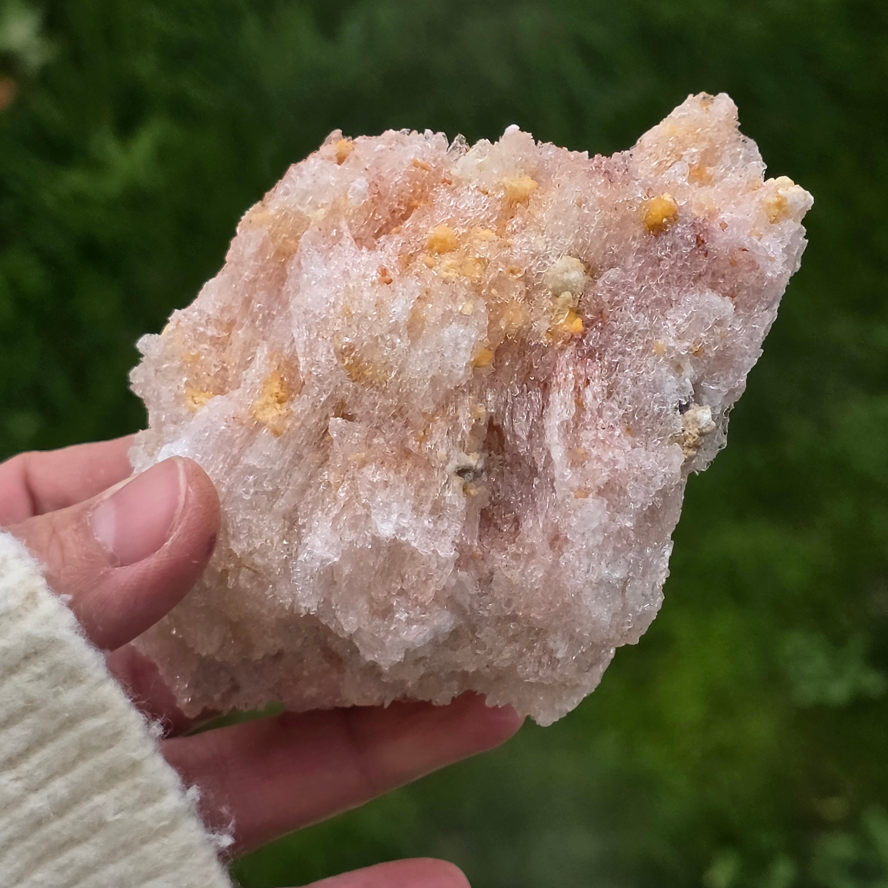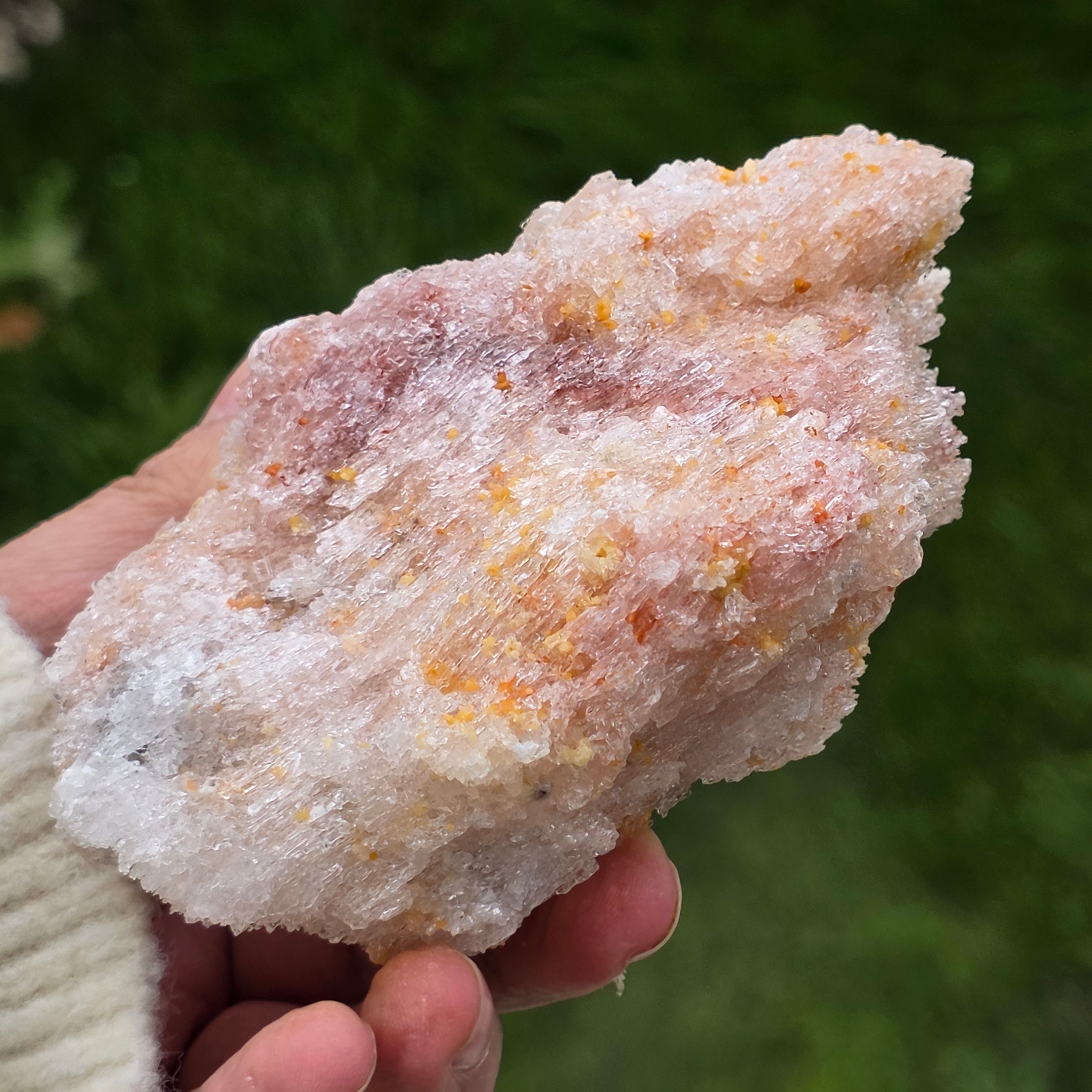 Rezultatul este o asociere mineralogică coerentă, în care matricea alb-translucidă de selenit este traversată sau punctată de incluziuni roșii de cinabar, fără delimitări artificiale. Cele două minerale sunt intim legate structural și vizual, cinabarul accentuând forma și transparența selenitului, iar selenitul punând în evidență culoarea intensă a cinabarului.