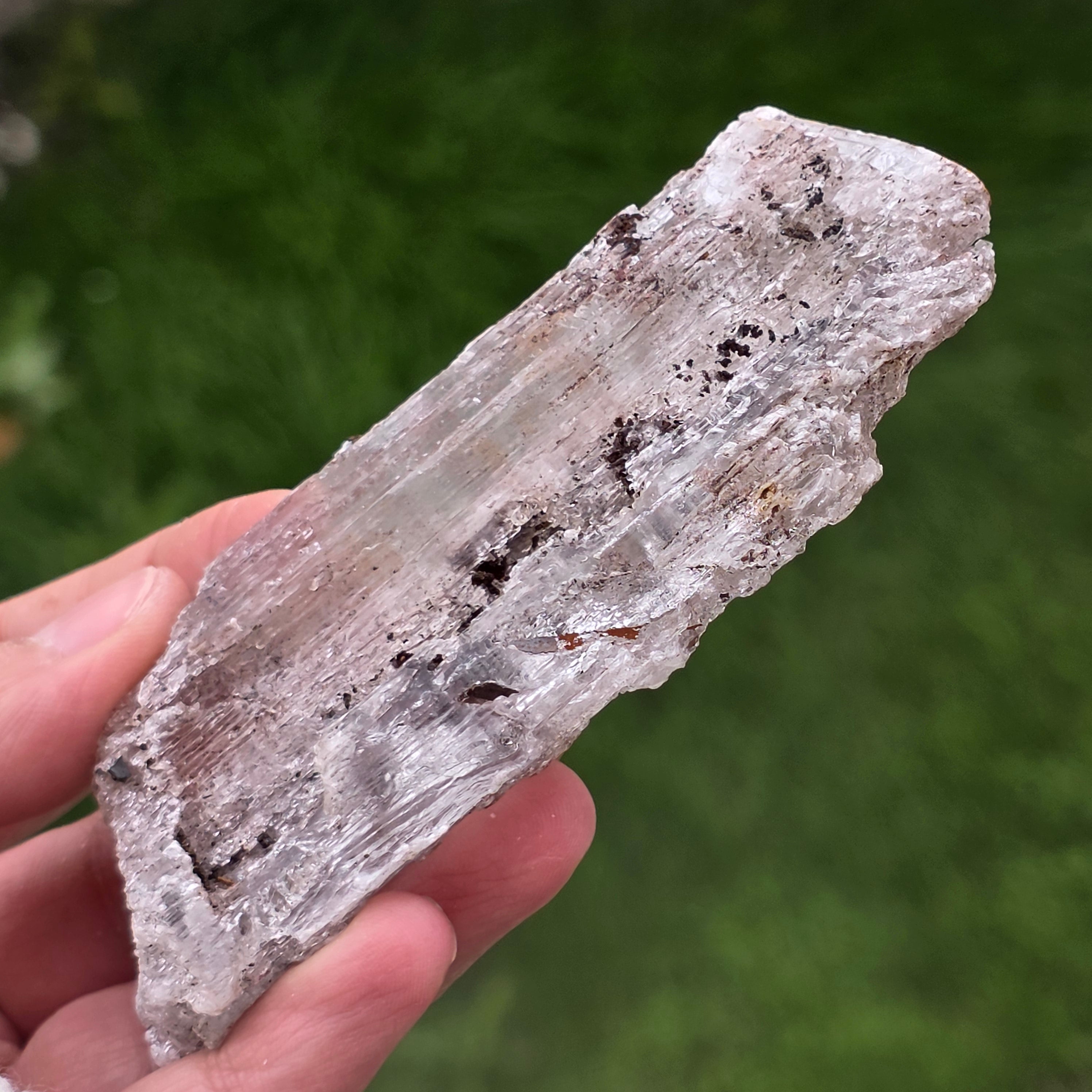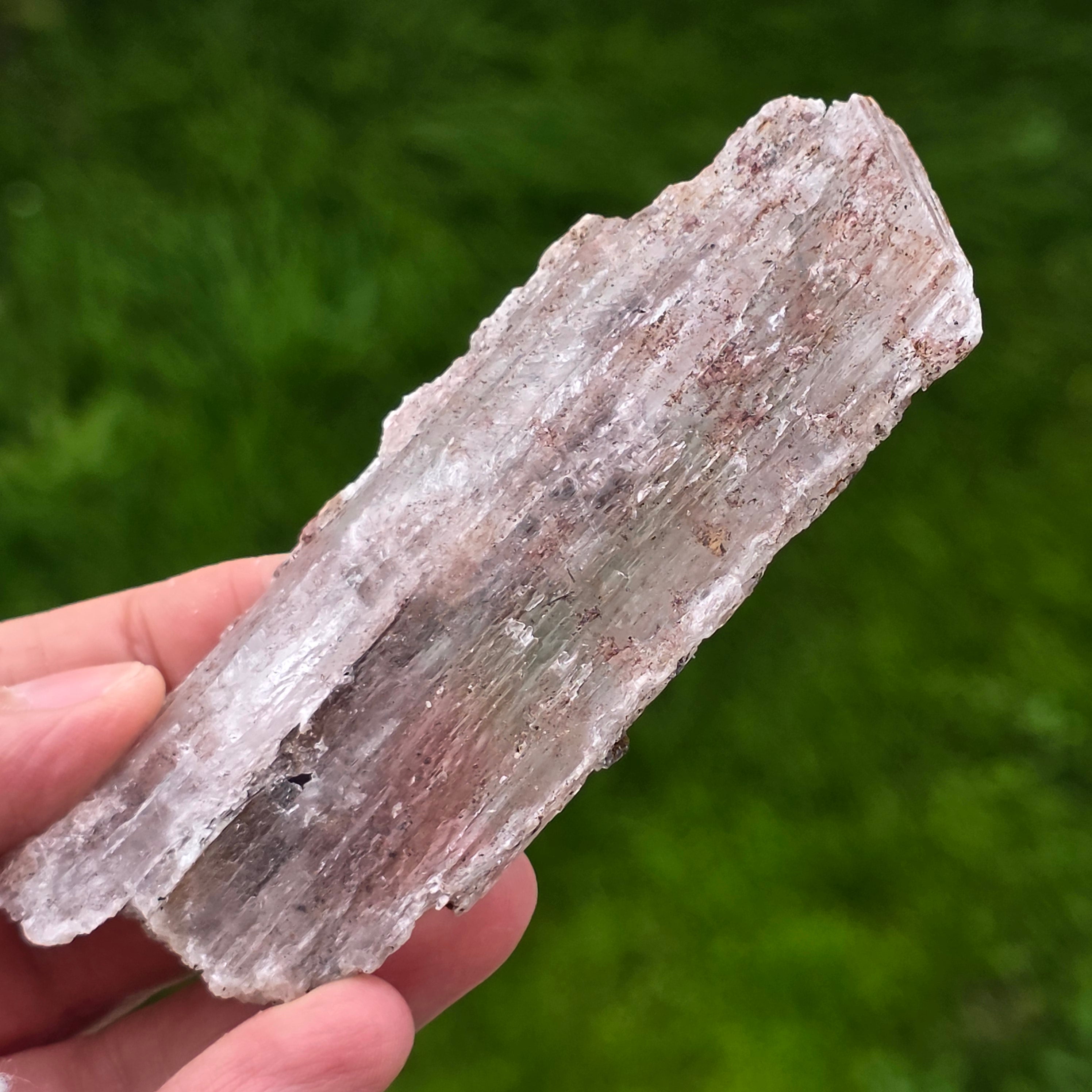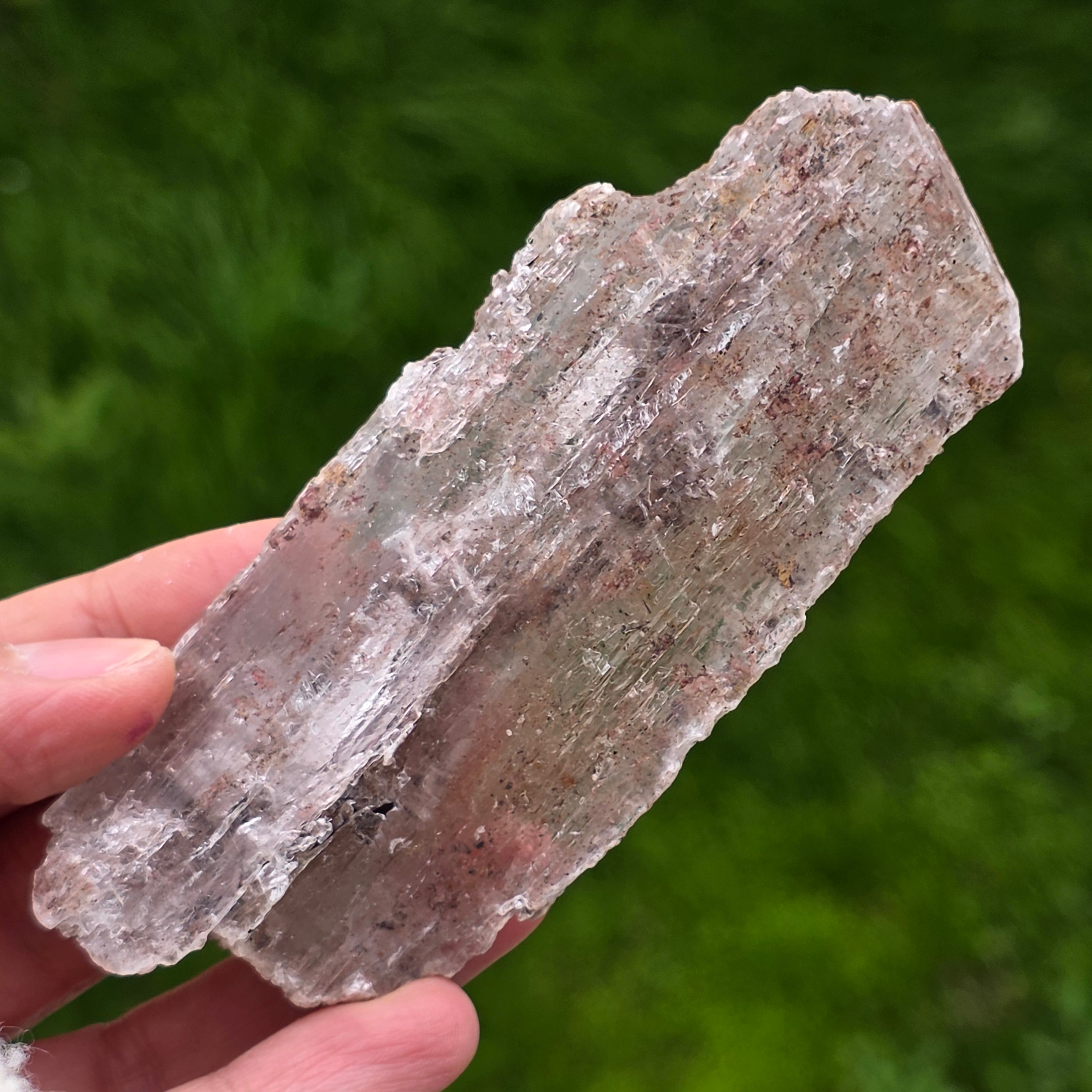 Selenitul apare sub formă de cristale alungite sau plăci translucide, cu luciu mătăsos și textură fină, în timp ce hematitul este prezent sub formă de incluziuni, pelicule sau depuneri naturale, care accentuează structura cristalului și îi conferă profunzime vizuală.