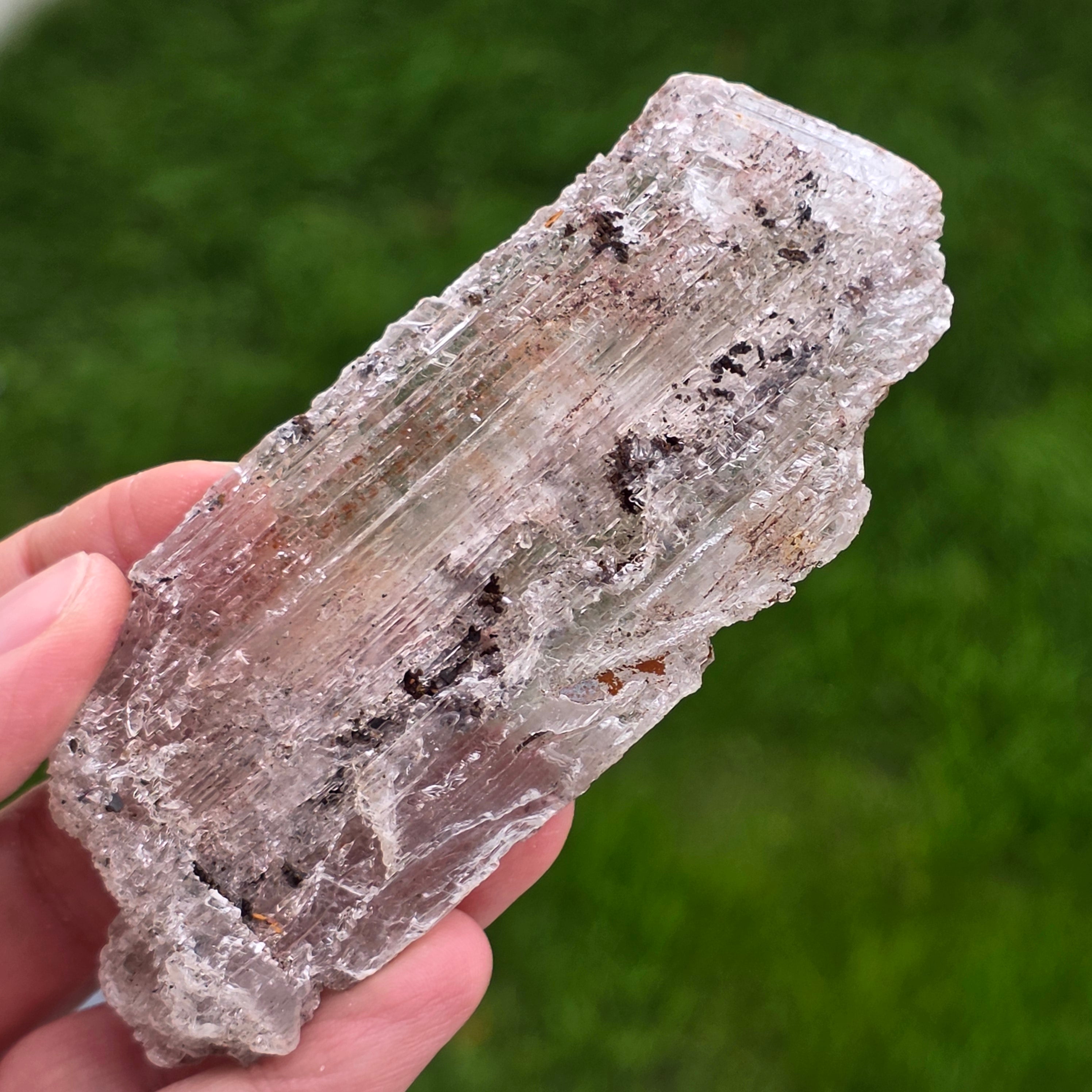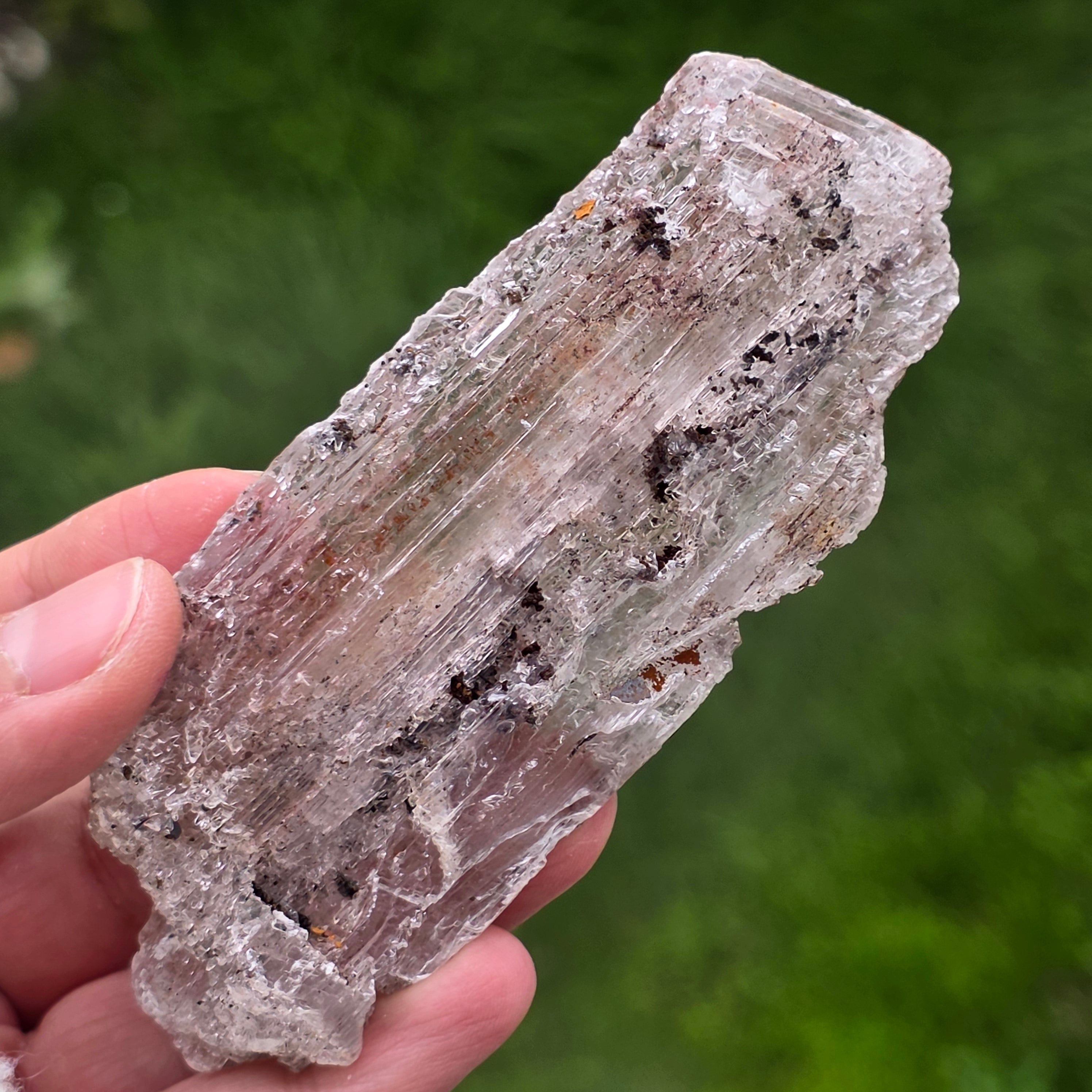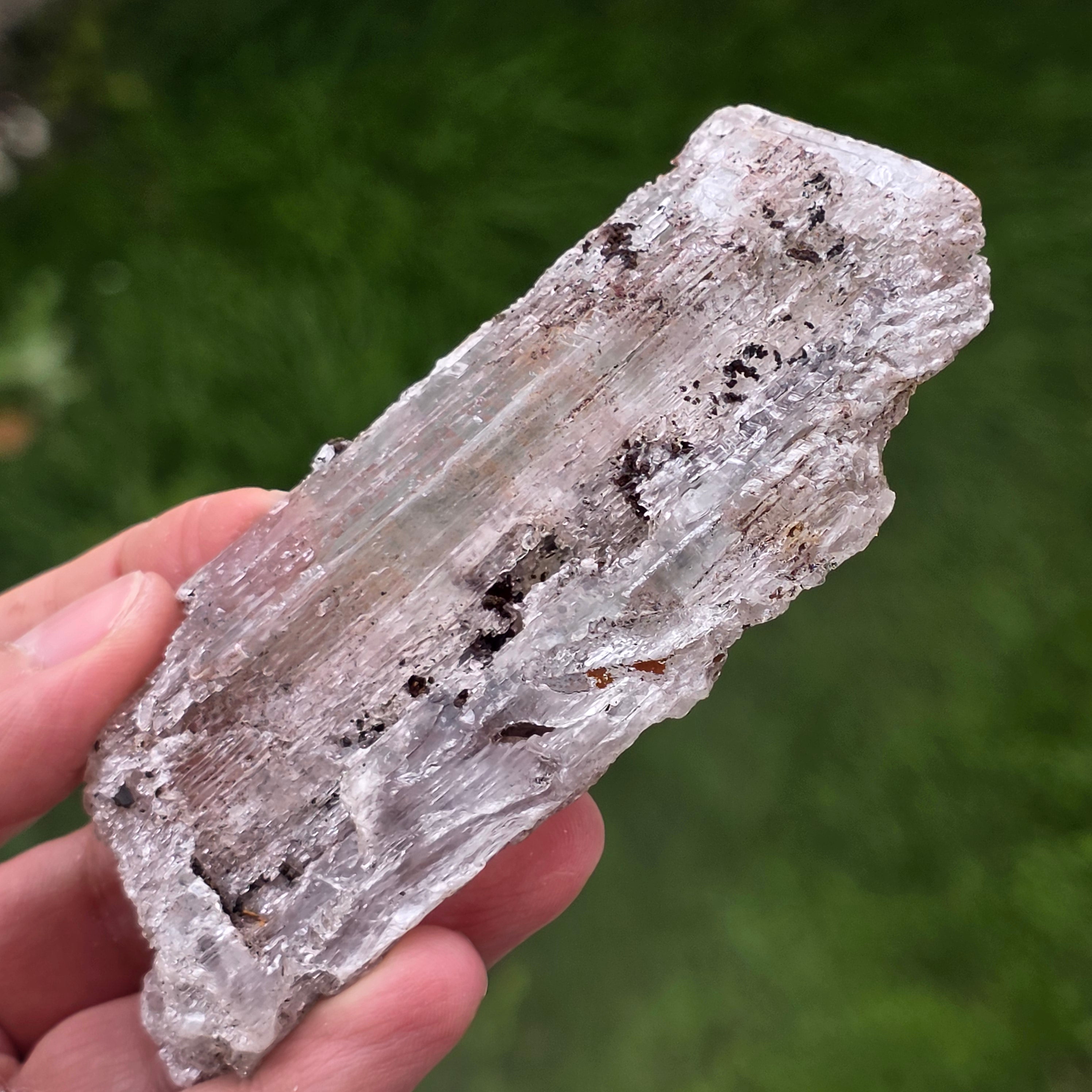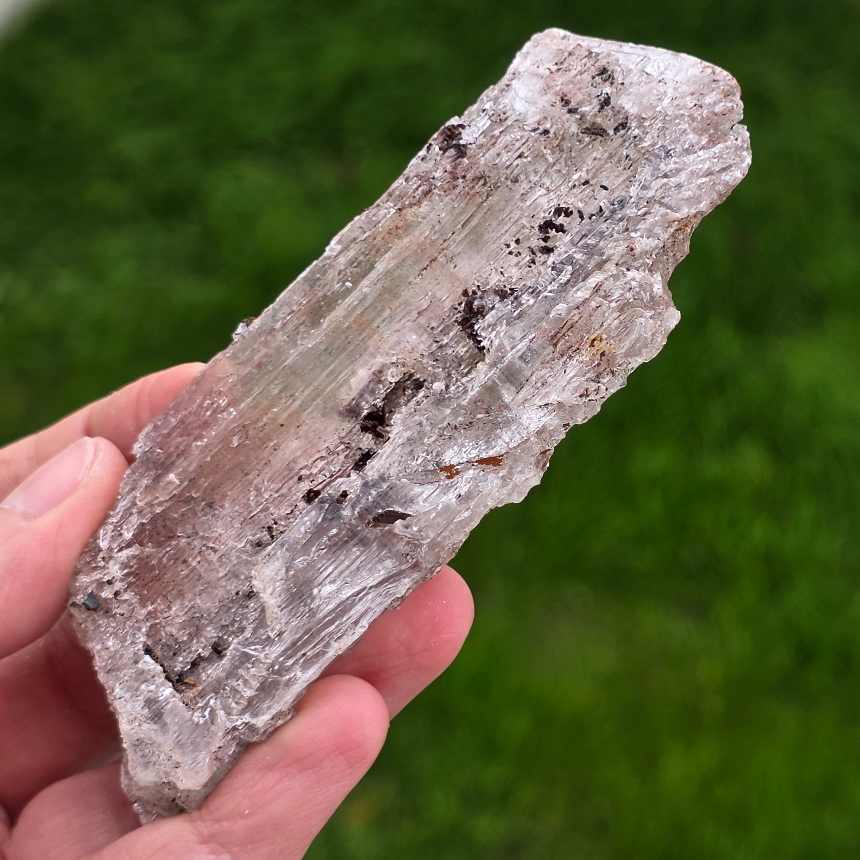 Selenitul apare sub formă de cristale alungite sau plăci translucide, cu luciu mătăsos și textură fină, în timp ce hematitul este prezent sub formă de incluziuni, pelicule sau depuneri naturale, care accentuează structura cristalului și îi conferă profunzime vizuală.