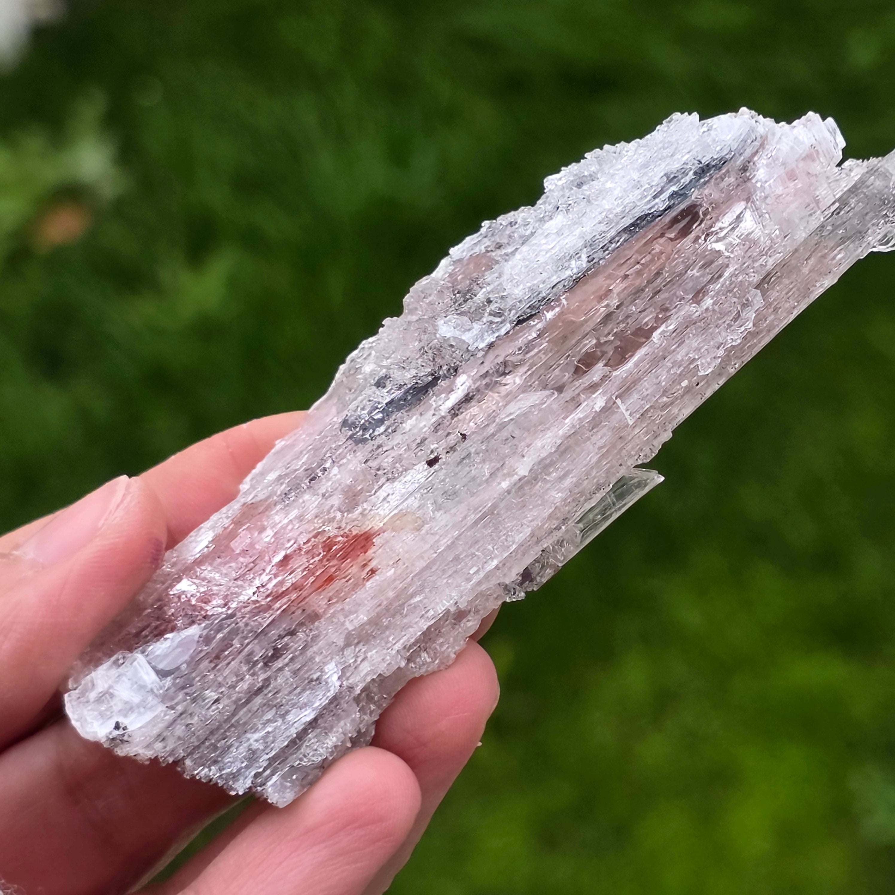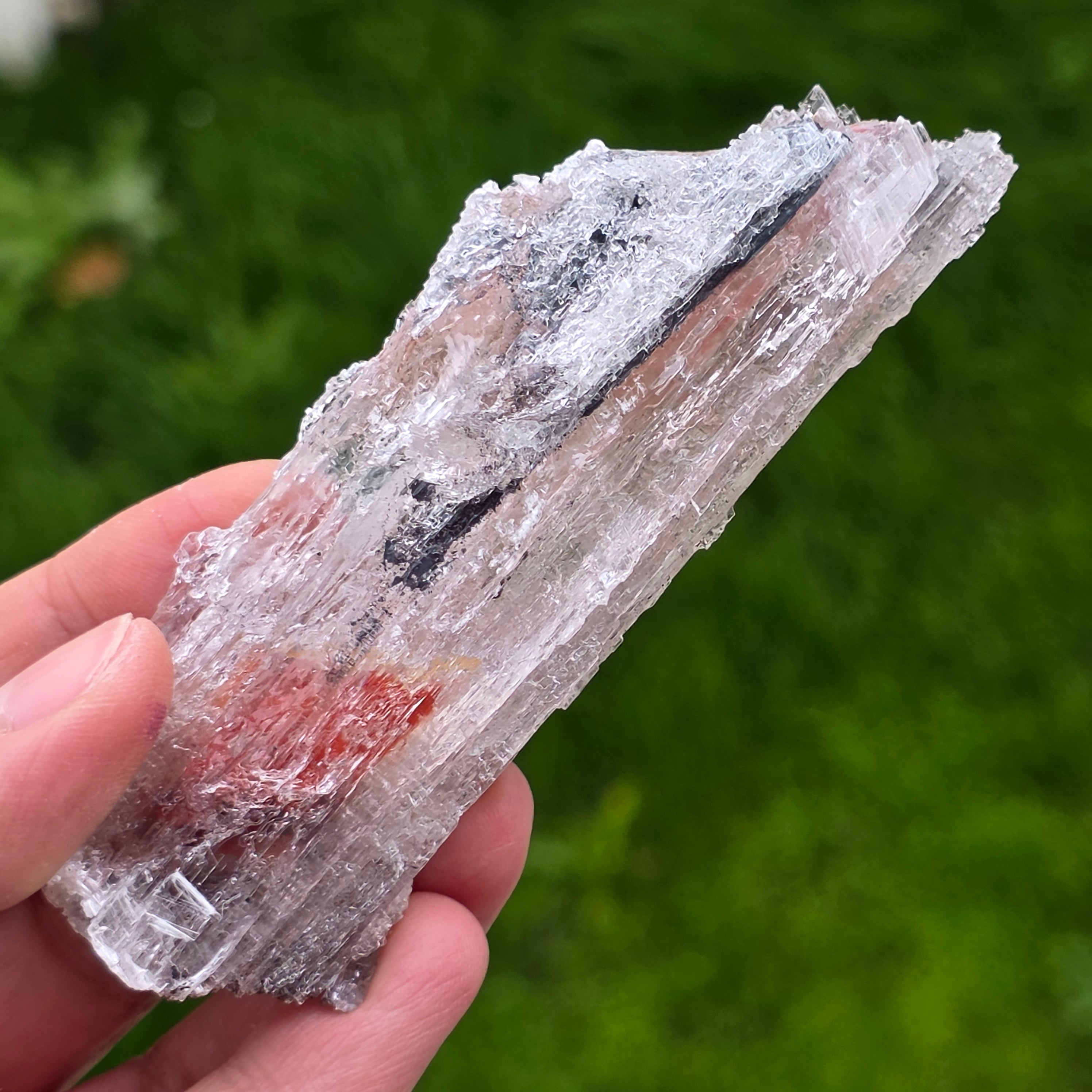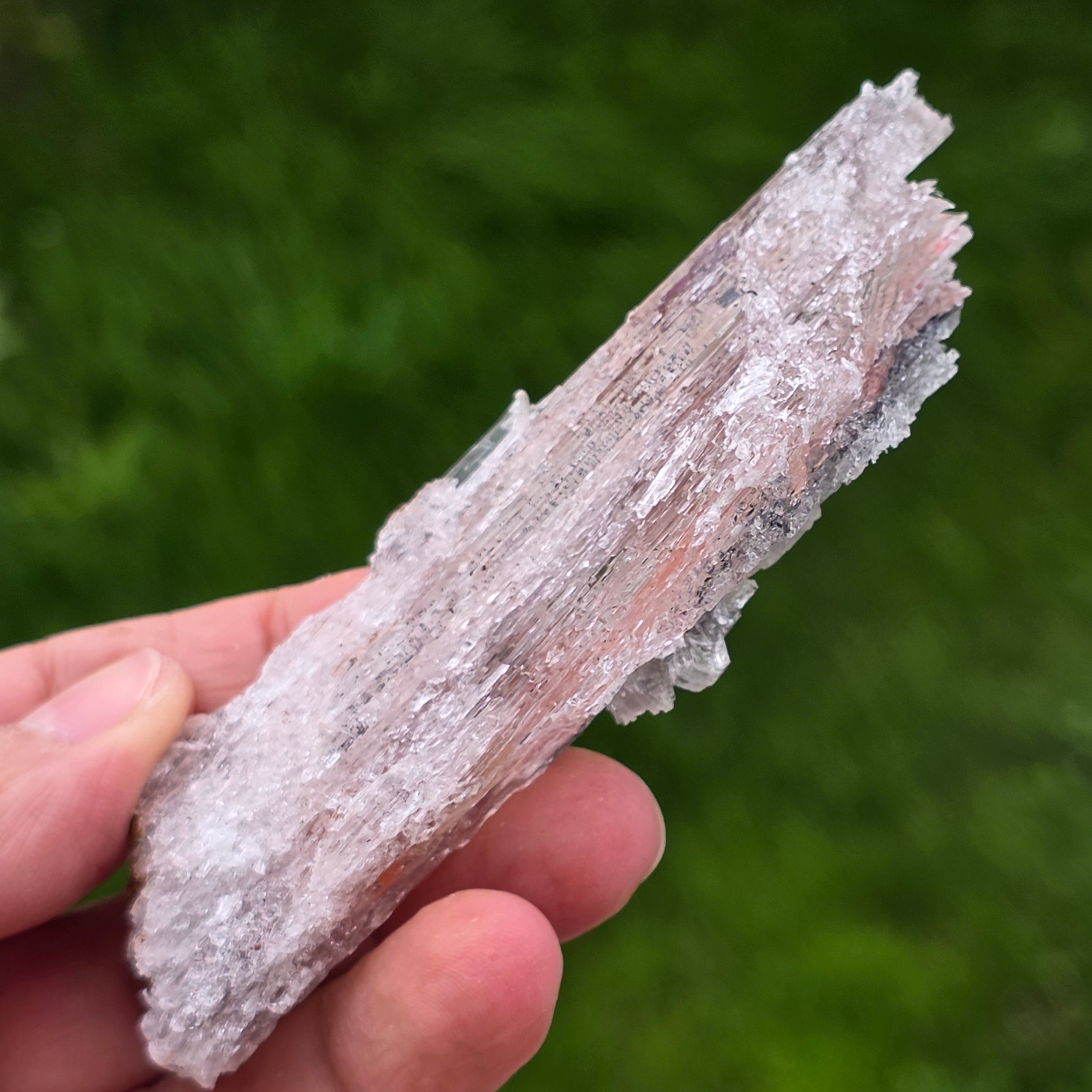 Selenitul apare sub formă de cristale alungite sau plăci translucide, cu luciu mătăsos și textură fină, în timp ce hematitul este prezent sub formă de incluziuni, pelicule sau depuneri naturale, care accentuează structura cristalului și îi conferă profunzime vizuală.