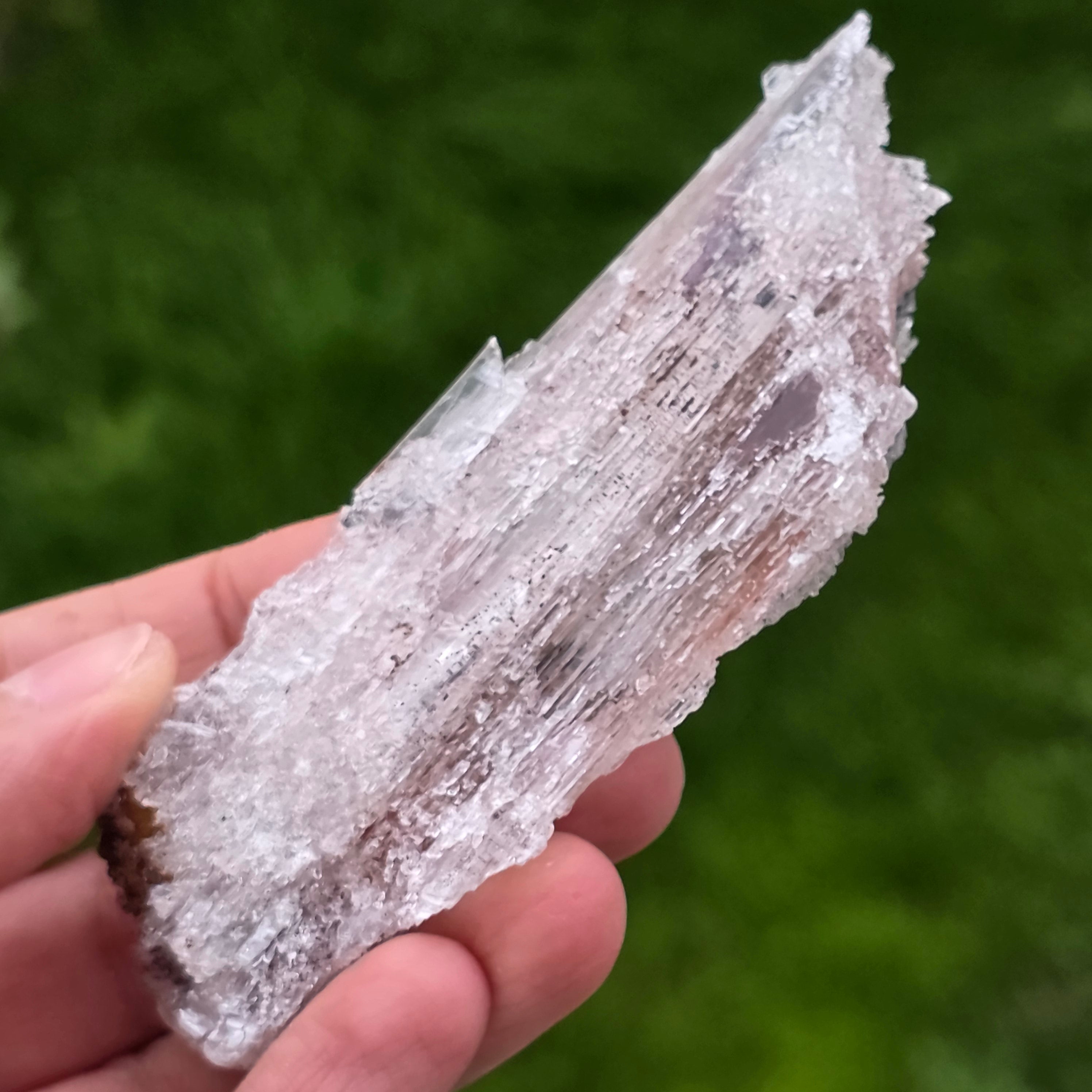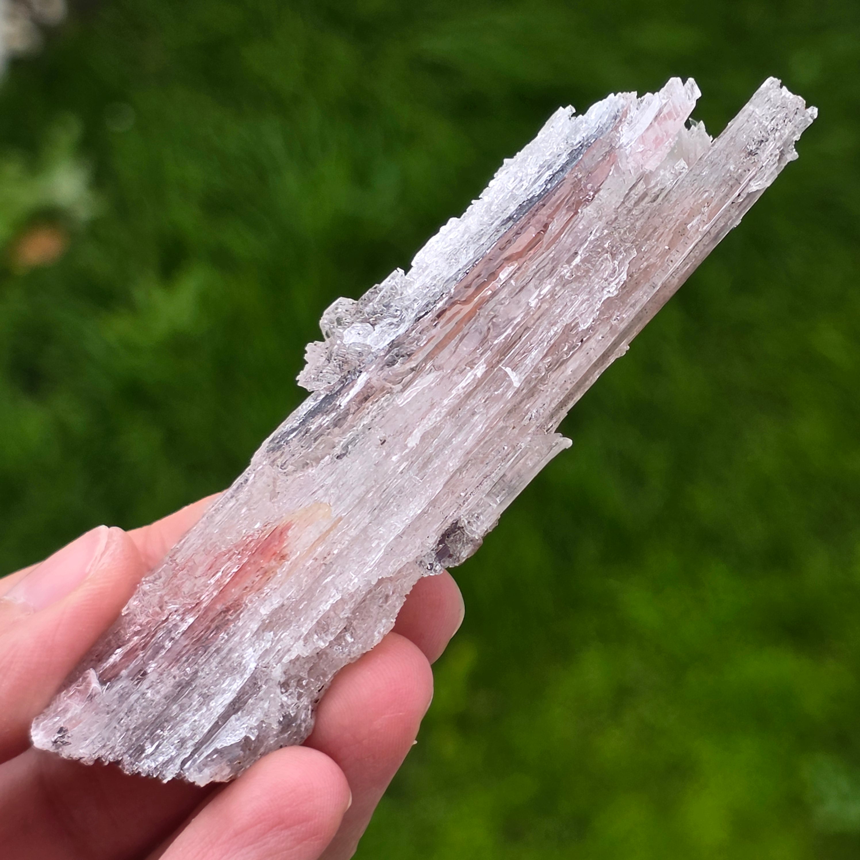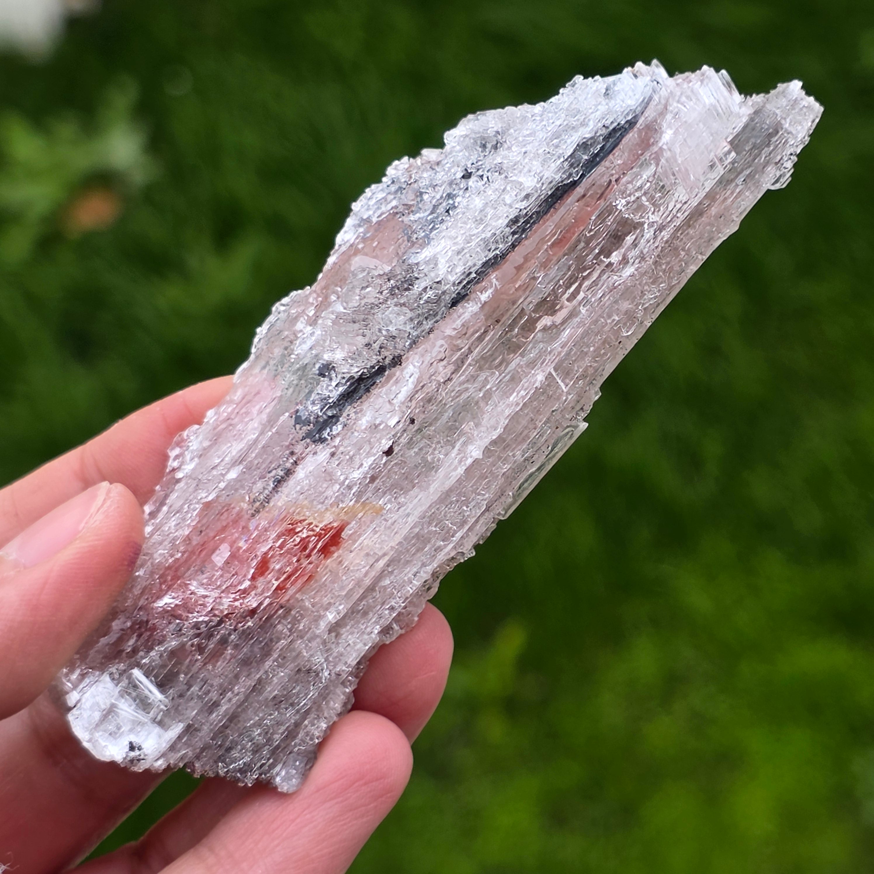 Selenitul apare sub formă de cristale alungite sau plăci translucide, cu luciu mătăsos și textură fină, în timp ce hematitul este prezent sub formă de incluziuni, pelicule sau depuneri naturale, care accentuează structura cristalului și îi conferă profunzime vizuală.