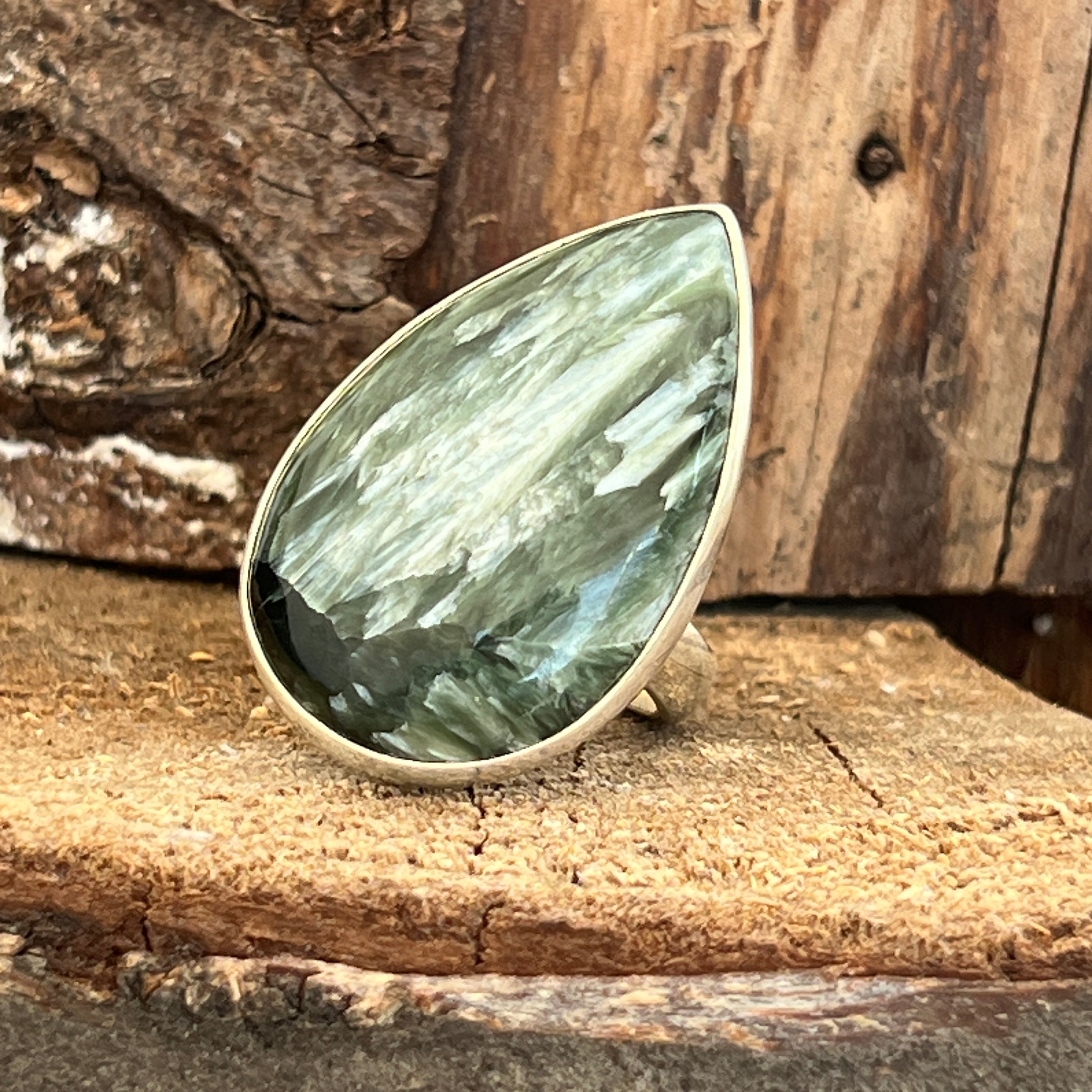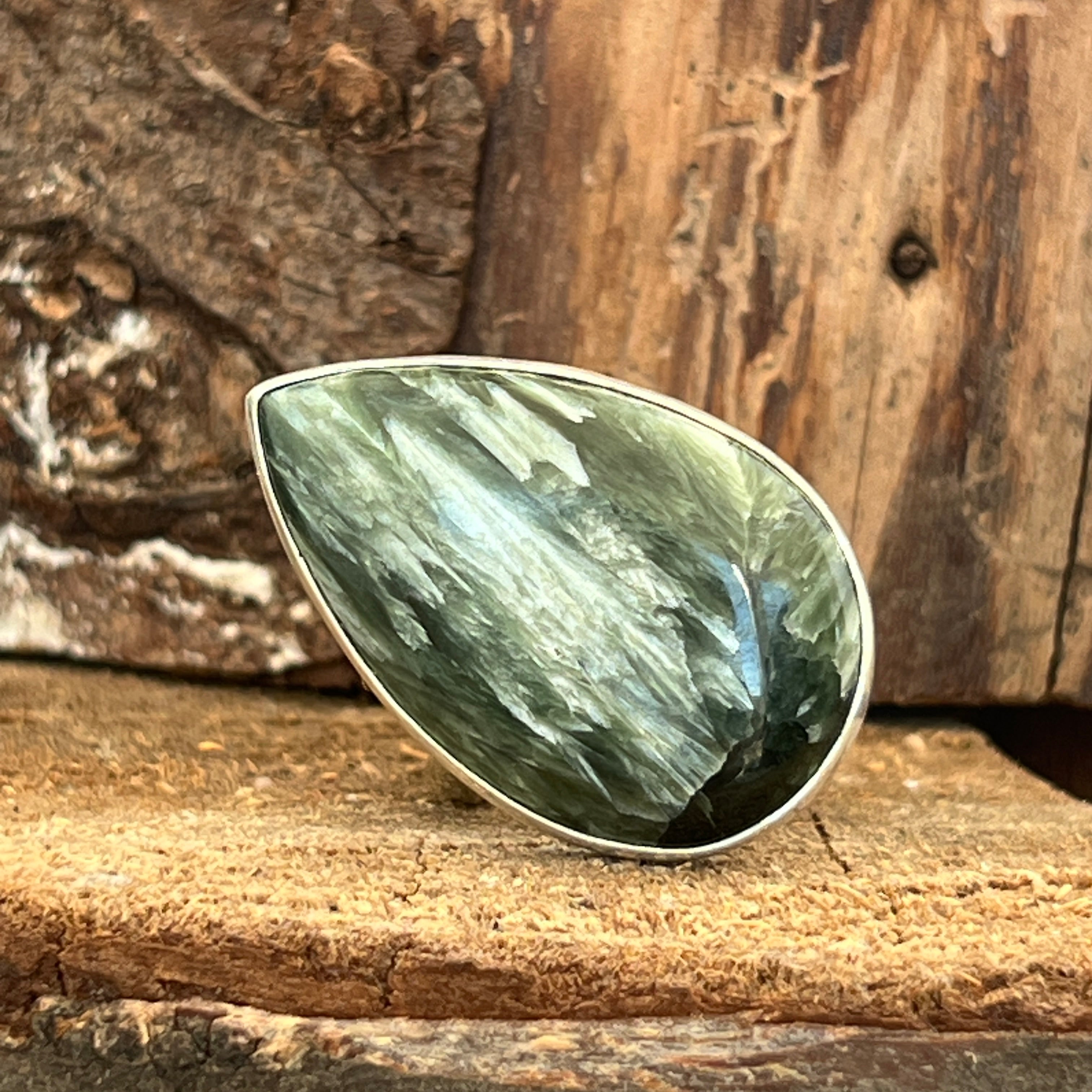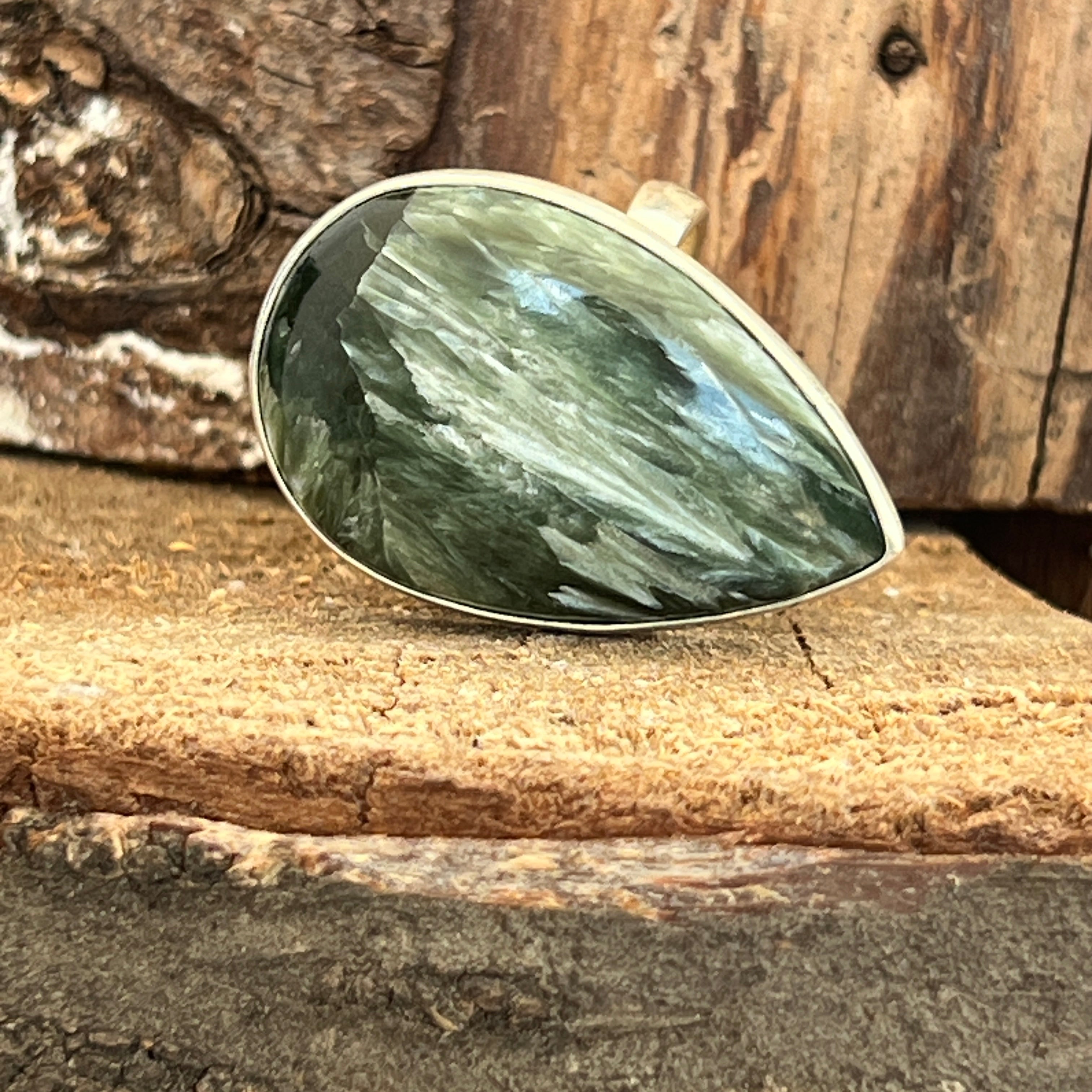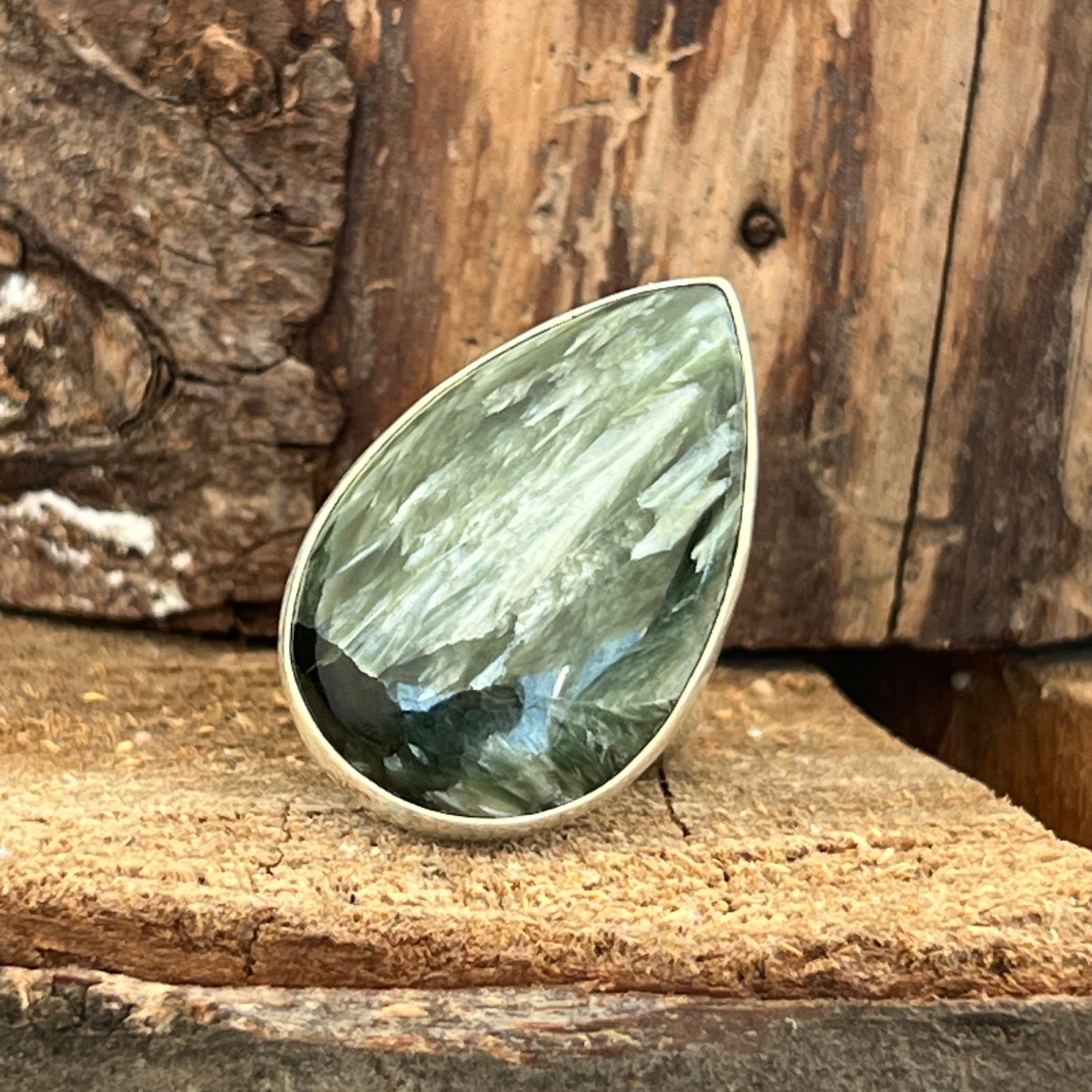 Serafinitul jest znany z subtelnych odcieni zieleni, harmonijnie połączonych ze srebrnymi lub białymi paskami, które przypominają skrzydła anioła. Ta kombinacja kolorów i naturalnych wzorów tworzy delikatny i uroczy wygląd biżuterii. Serafinitus jest często kojarzony z anielskimi i duchowymi energią, uważany za kamień boskiego światła i miłości.