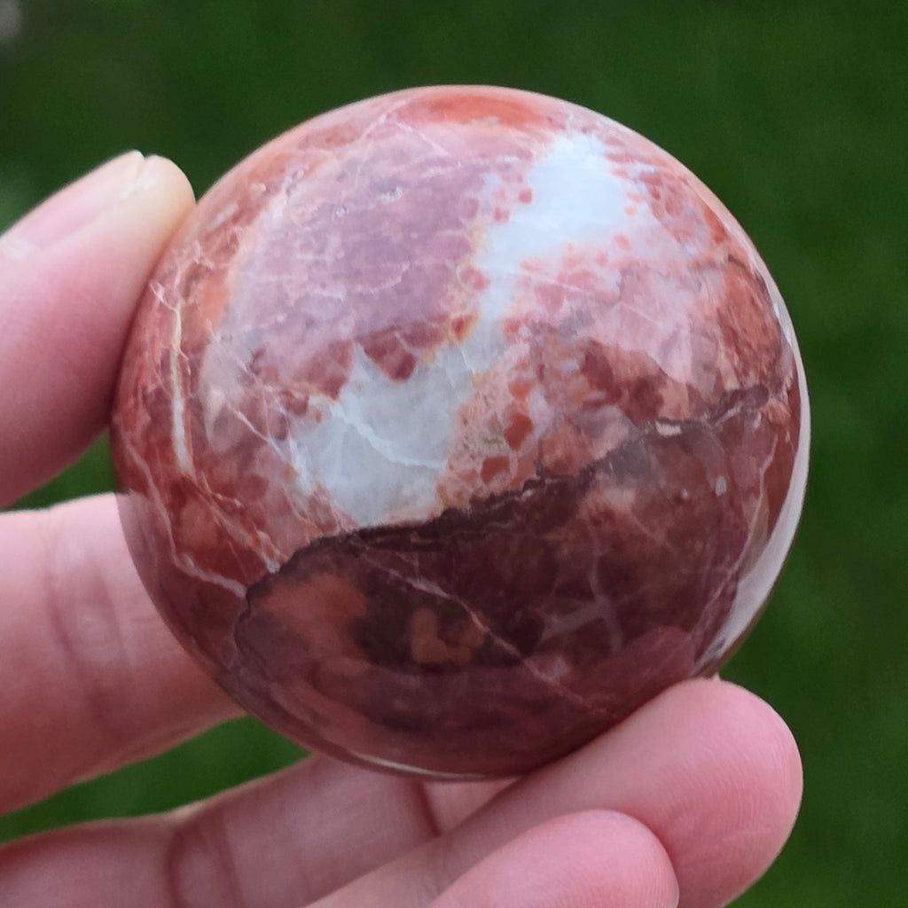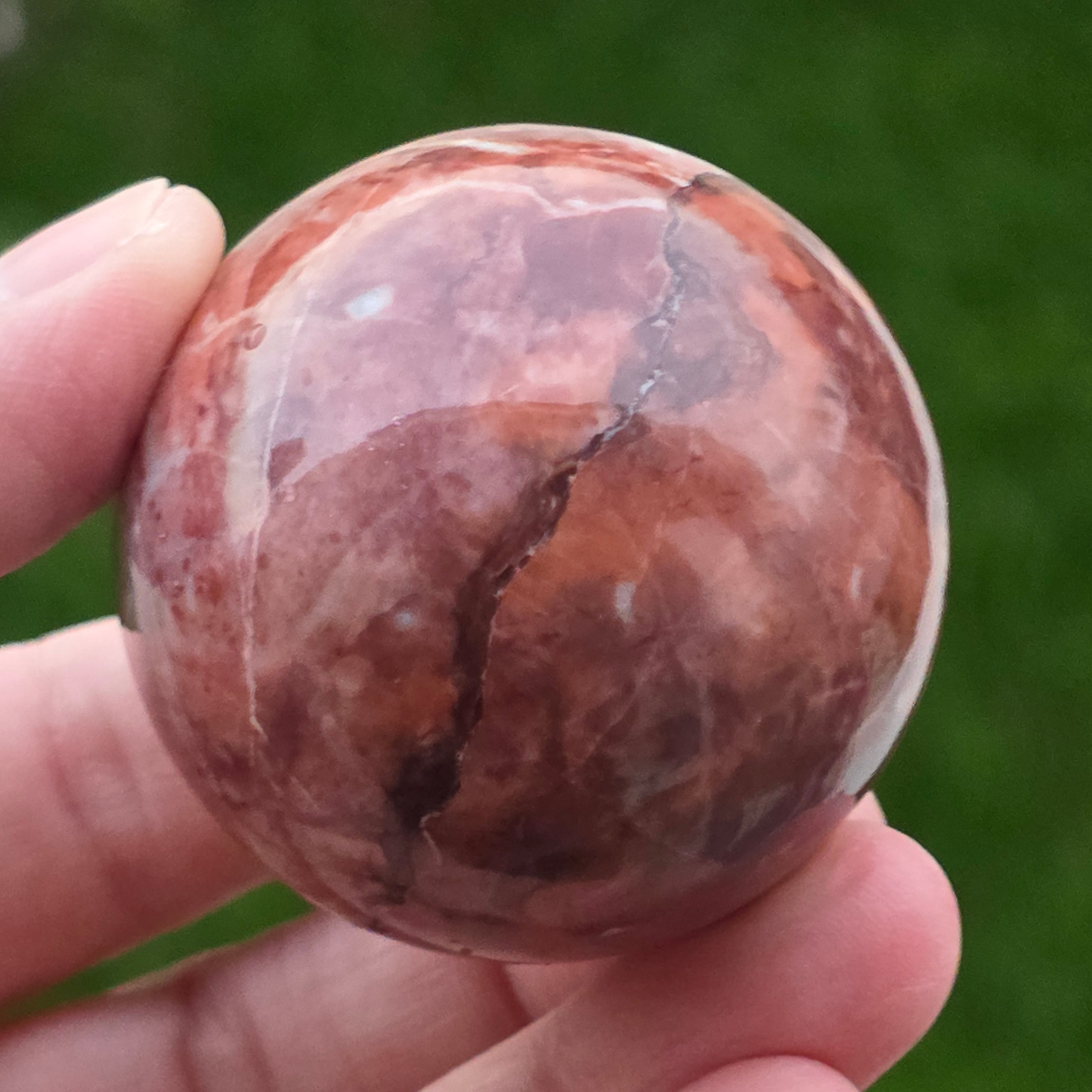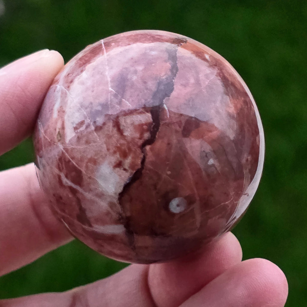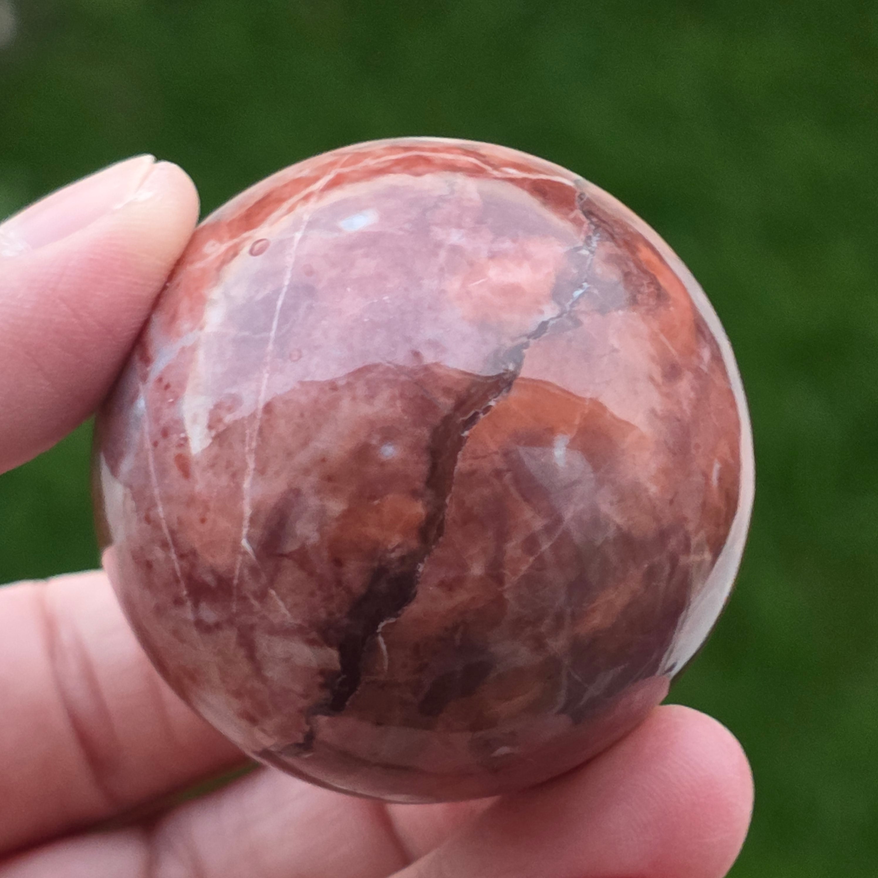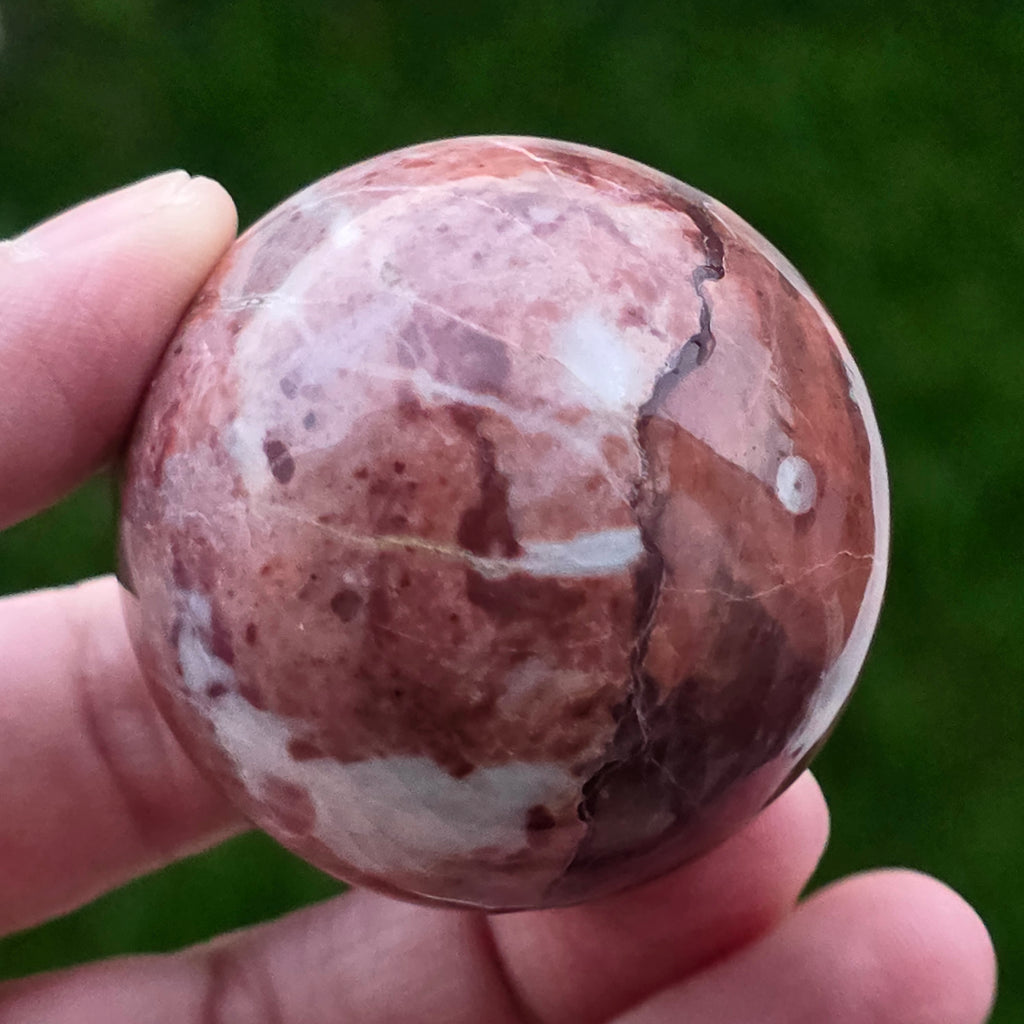 Sfera din Jasp Căpșună este o piesă vibrantă și expresivă, sculptată cu atenție pentru a evidenția nuanțele calde de roșu căpșună, texturile organice și desenul mineral specific acestei varietăți de jasp. Fiecare piesă este complet unică, cu modele naturale care se împletesc în forme fluide, evocând stratificarea rocilor și frumusețea lor brută.