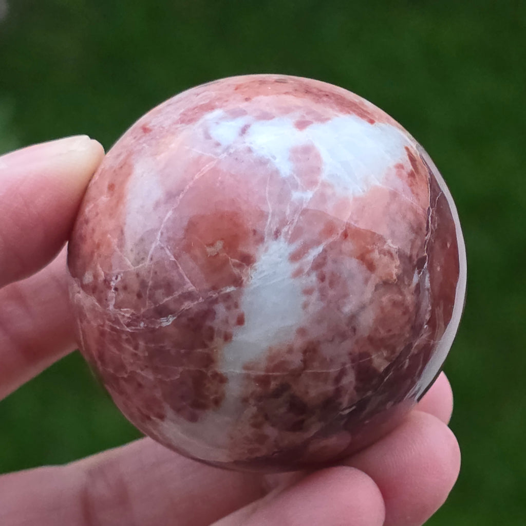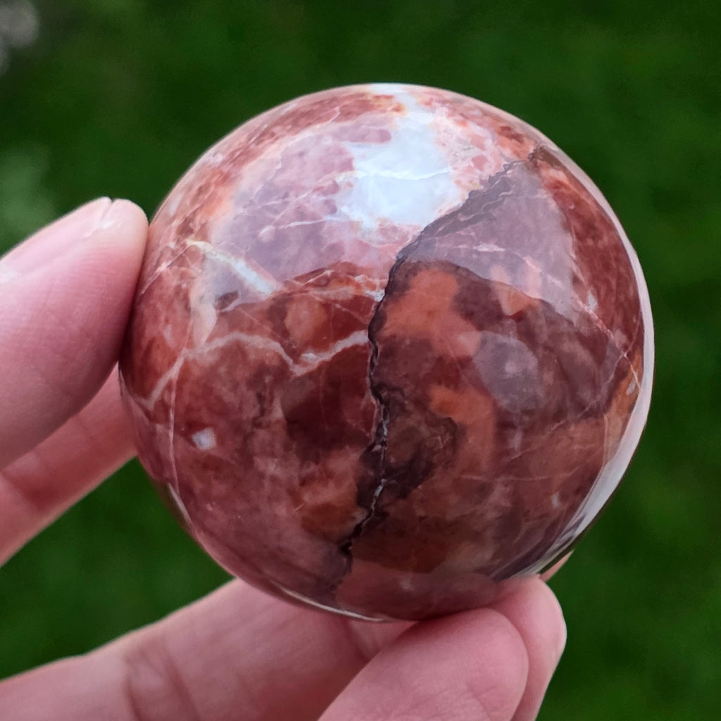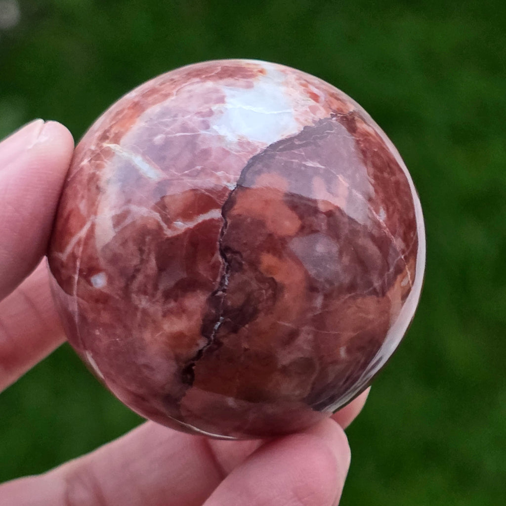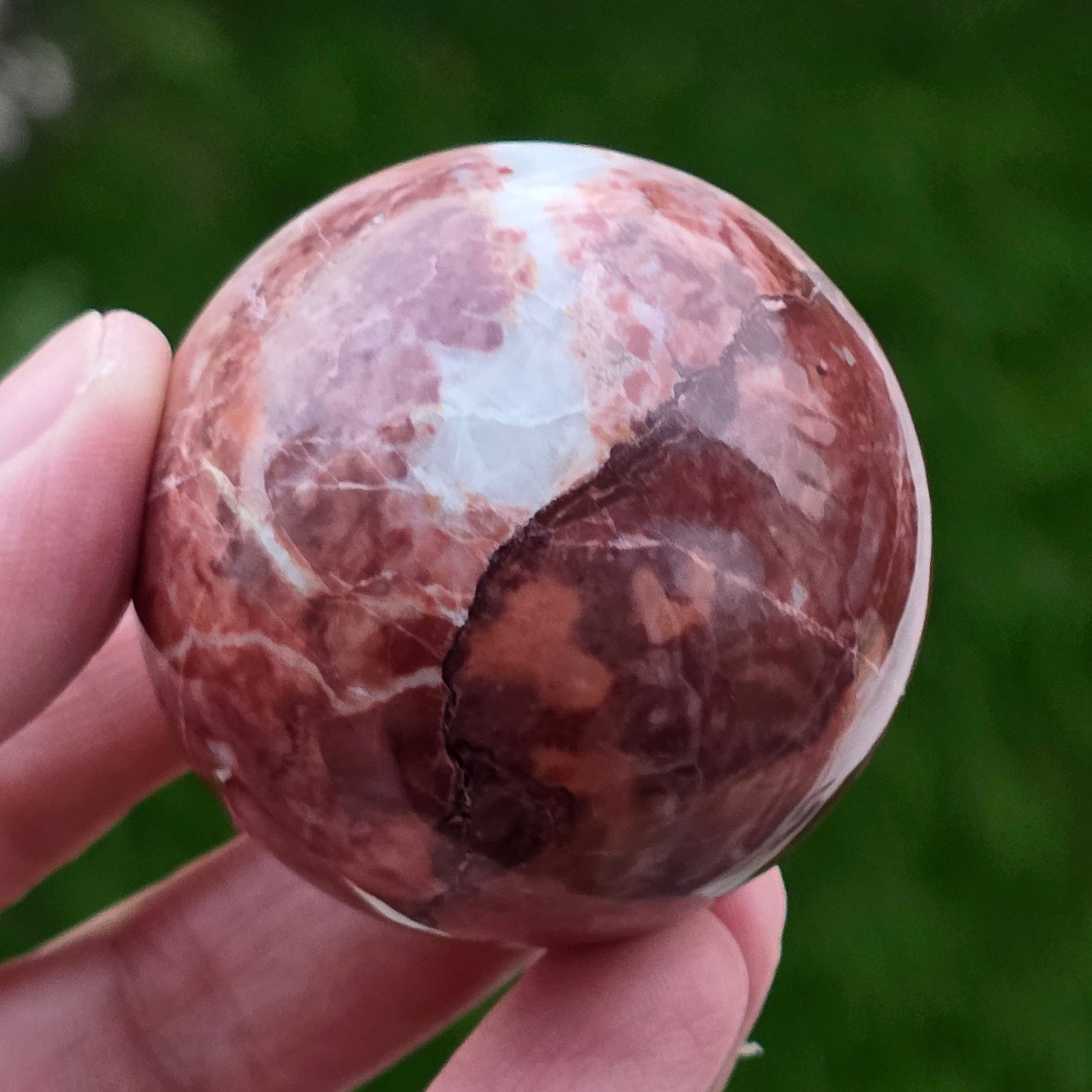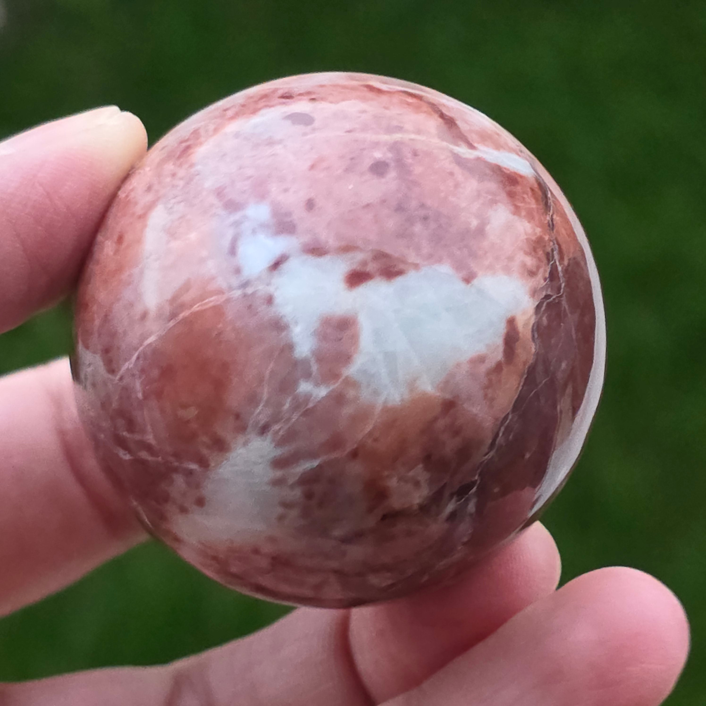 Sfera din Jasp Căpșună este o piesă vibrantă și expresivă, sculptată cu atenție pentru a evidenția nuanțele calde de roșu căpșună, texturile organice și desenul mineral specific acestei varietăți de jasp. Fiecare piesă este complet unică, cu modele naturale care se împletesc în forme fluide, evocând stratificarea rocilor și frumusețea lor brută.