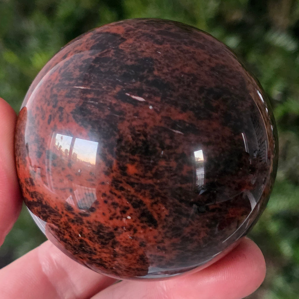 Această sferă din obsidian mahon este o întrupare a forței primordiale a Pământului — o piatră a rădăcinilor, a siguranței și a transformării interioare.