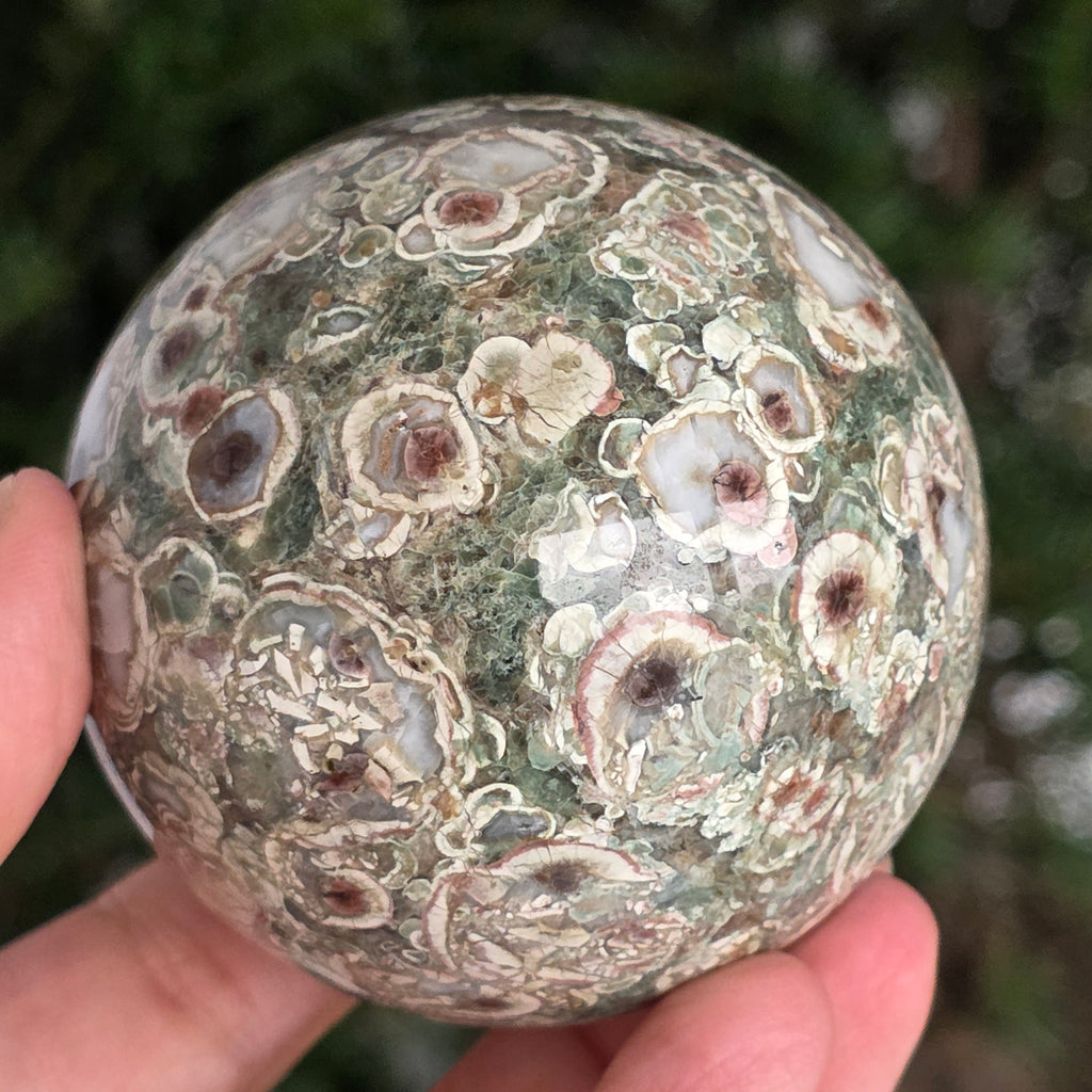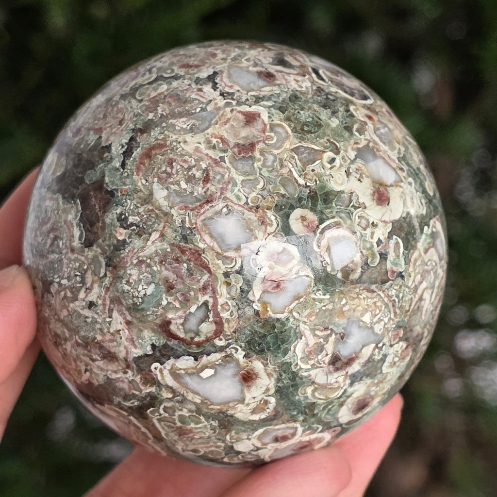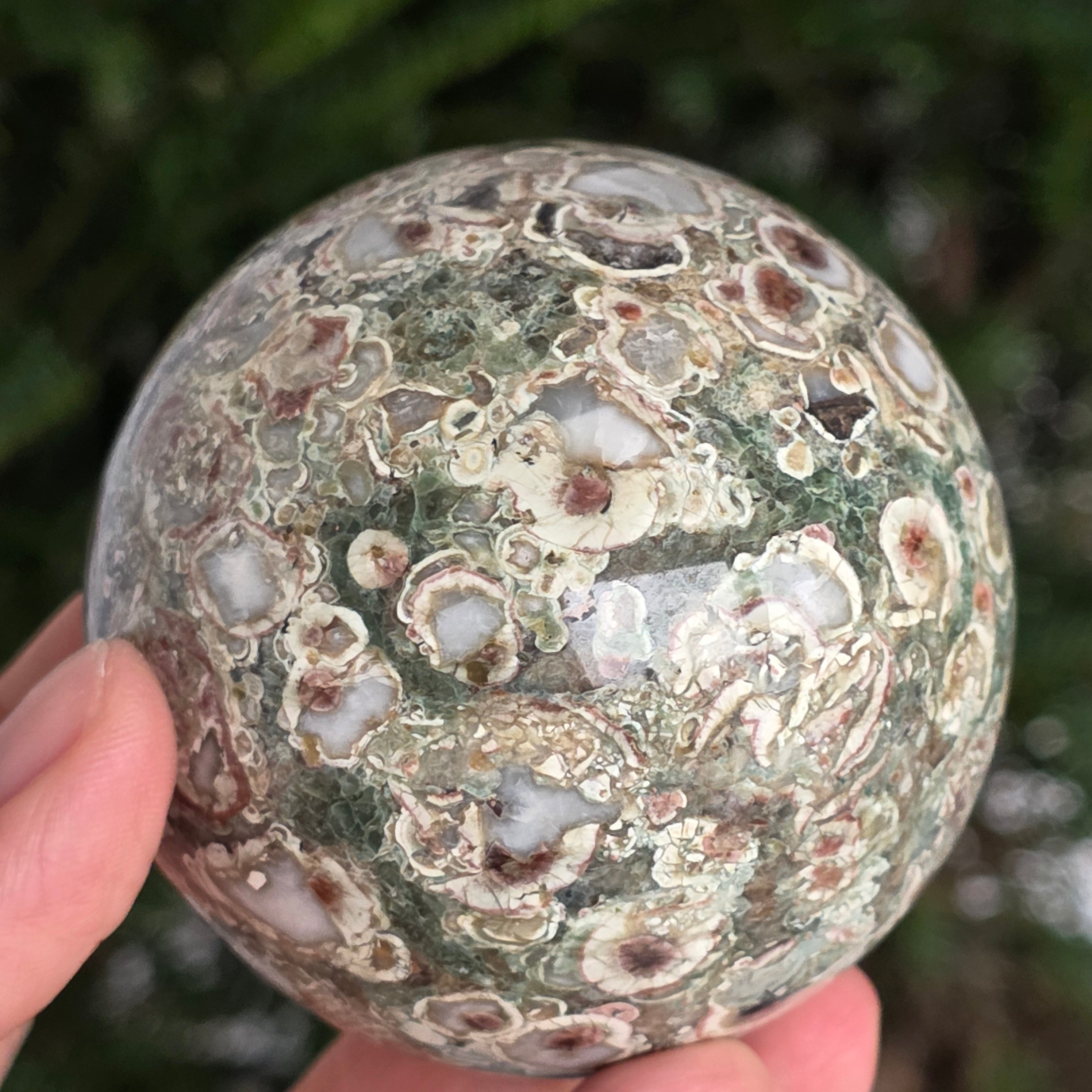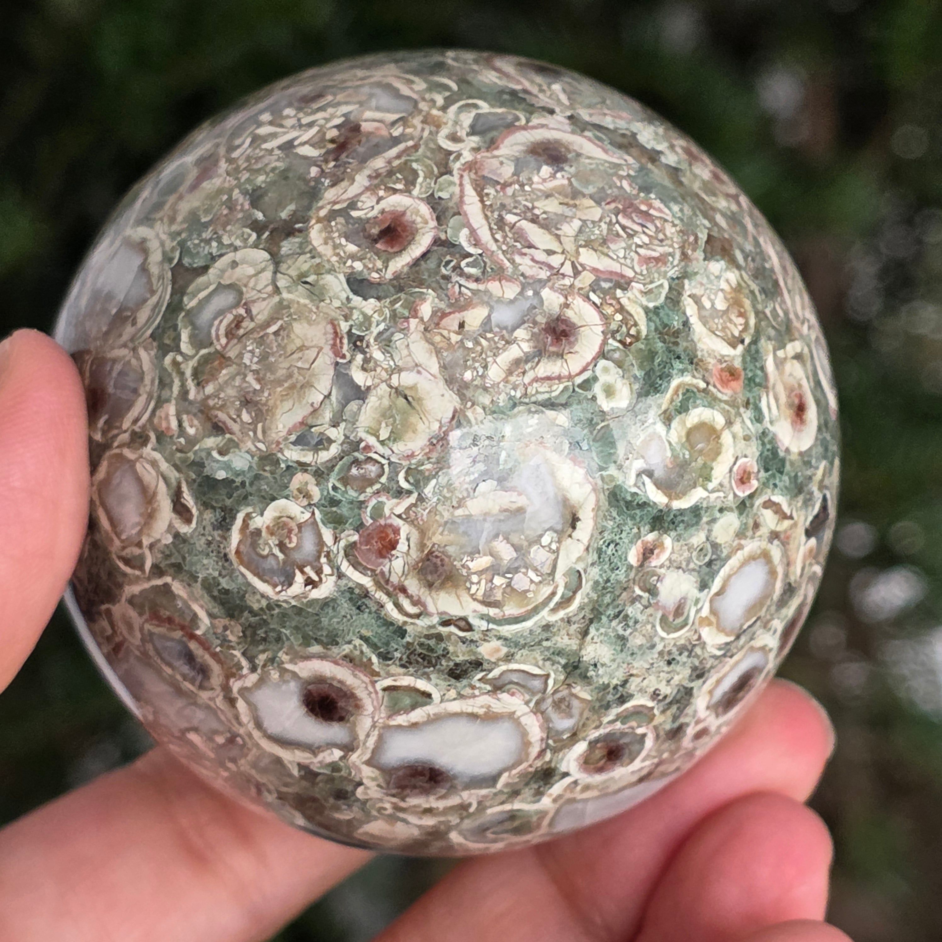 O sferă care poartă în ea urmele unei planete în formare. Texturile vii și culorile pământii ale riolitului natural – nuanțe de verde mușchi, bej, brun și gri vulcanic – se împletesc într-un dans hipnotic de forme și linii, ca o hartă minerală a lumii interioare.