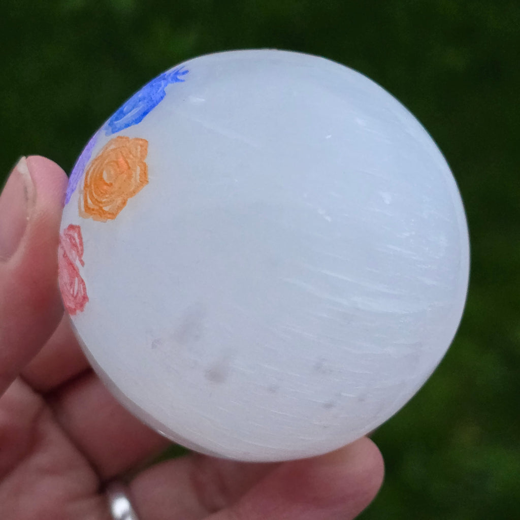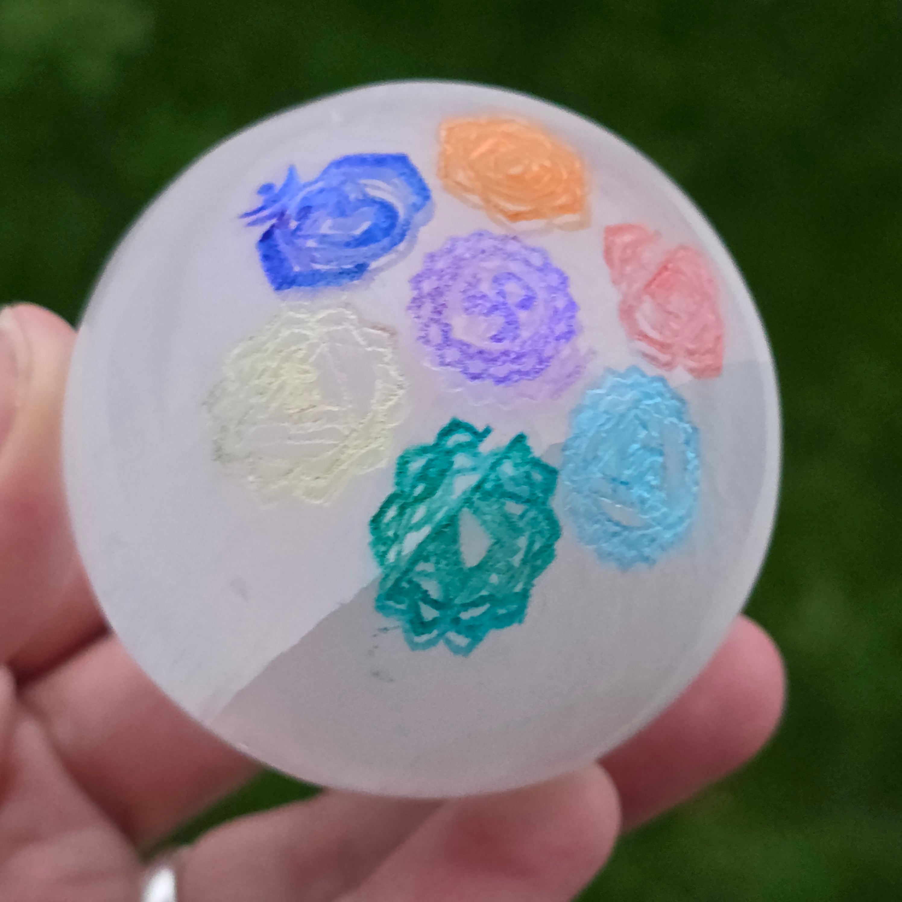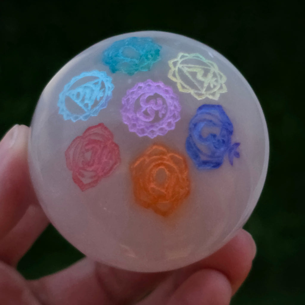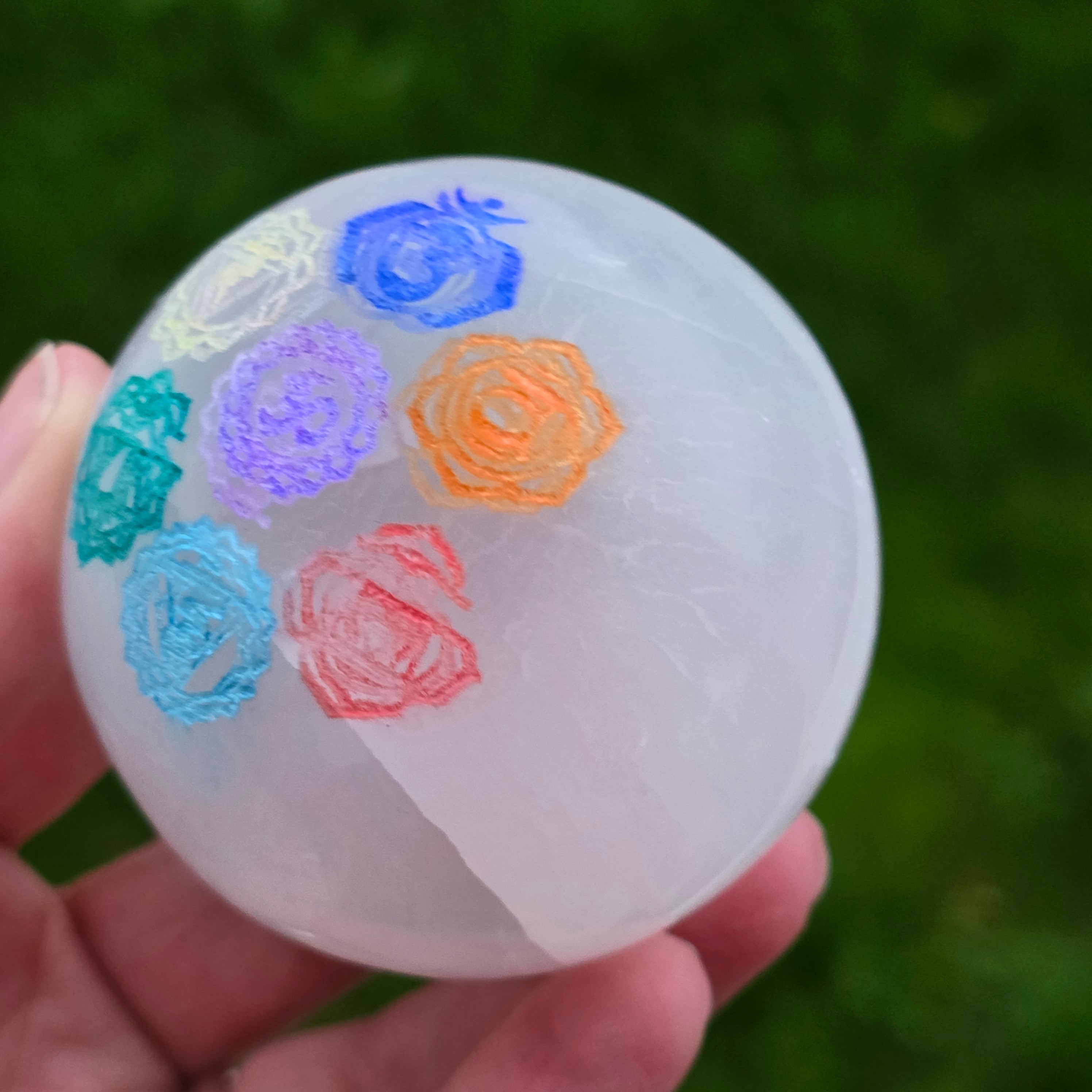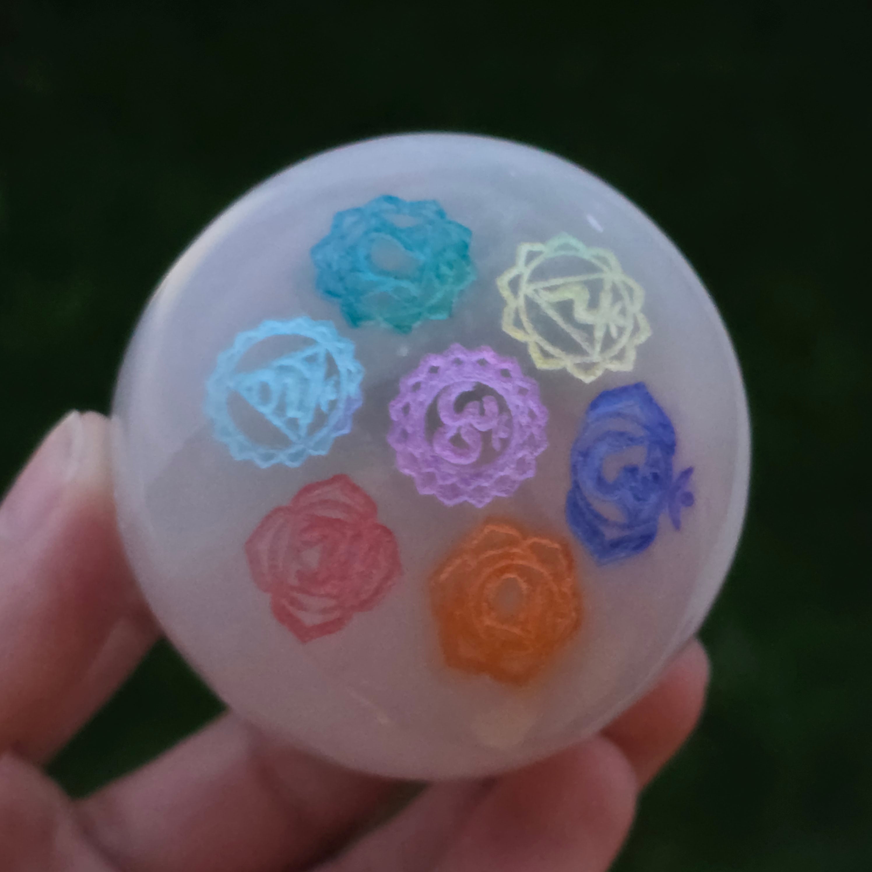 Această sfera din selenit este decorată cu simbolurile celor 7 chakre, fiecare gravat și colorat distinct, pentru a susține lucrul energetic și echilibrul interior. Selenitul este cunoscut ca piatra luminii și a purificării, fiind folosit atât pentru claritate mentală, cât și pentru curățarea altor cristale și a spațiului personal.