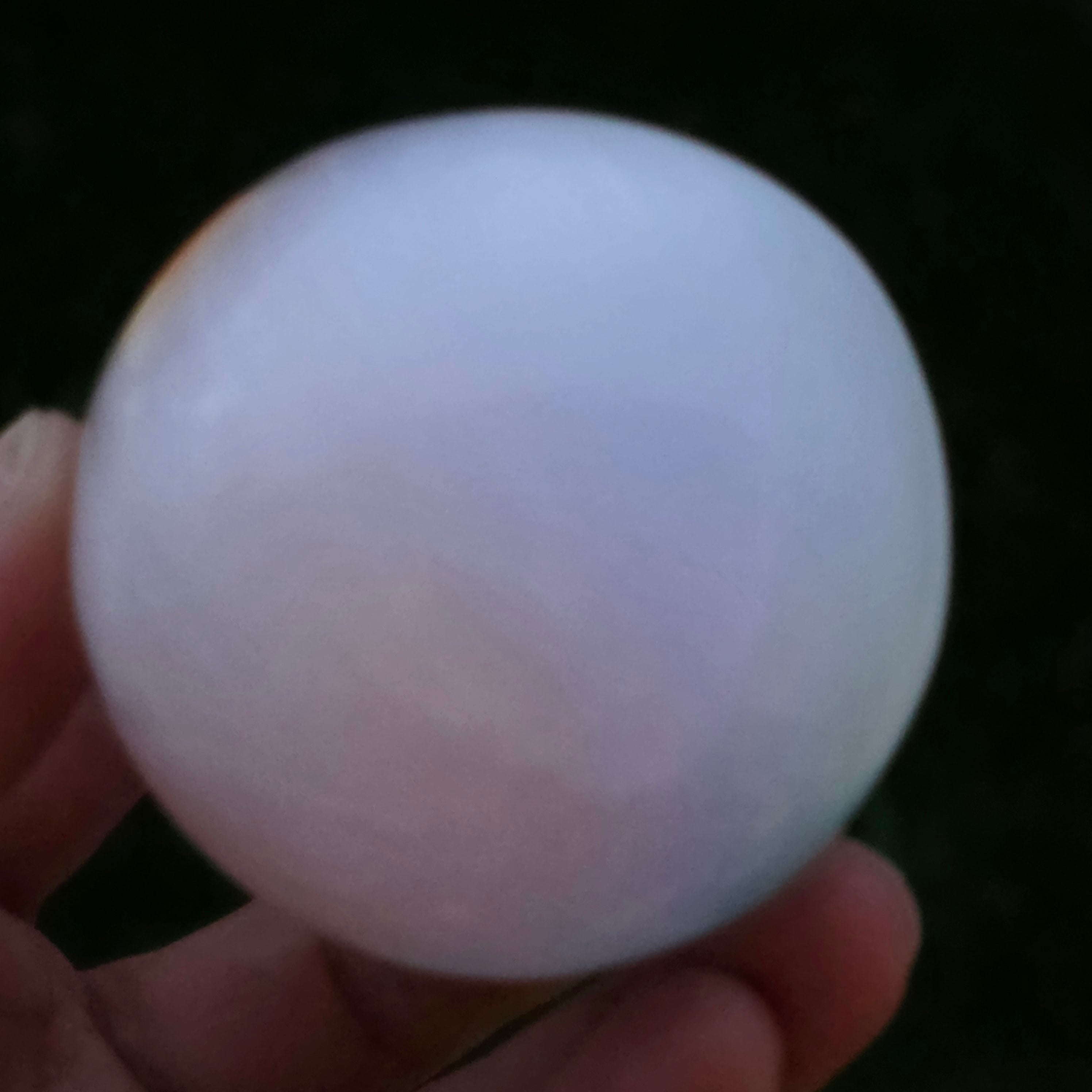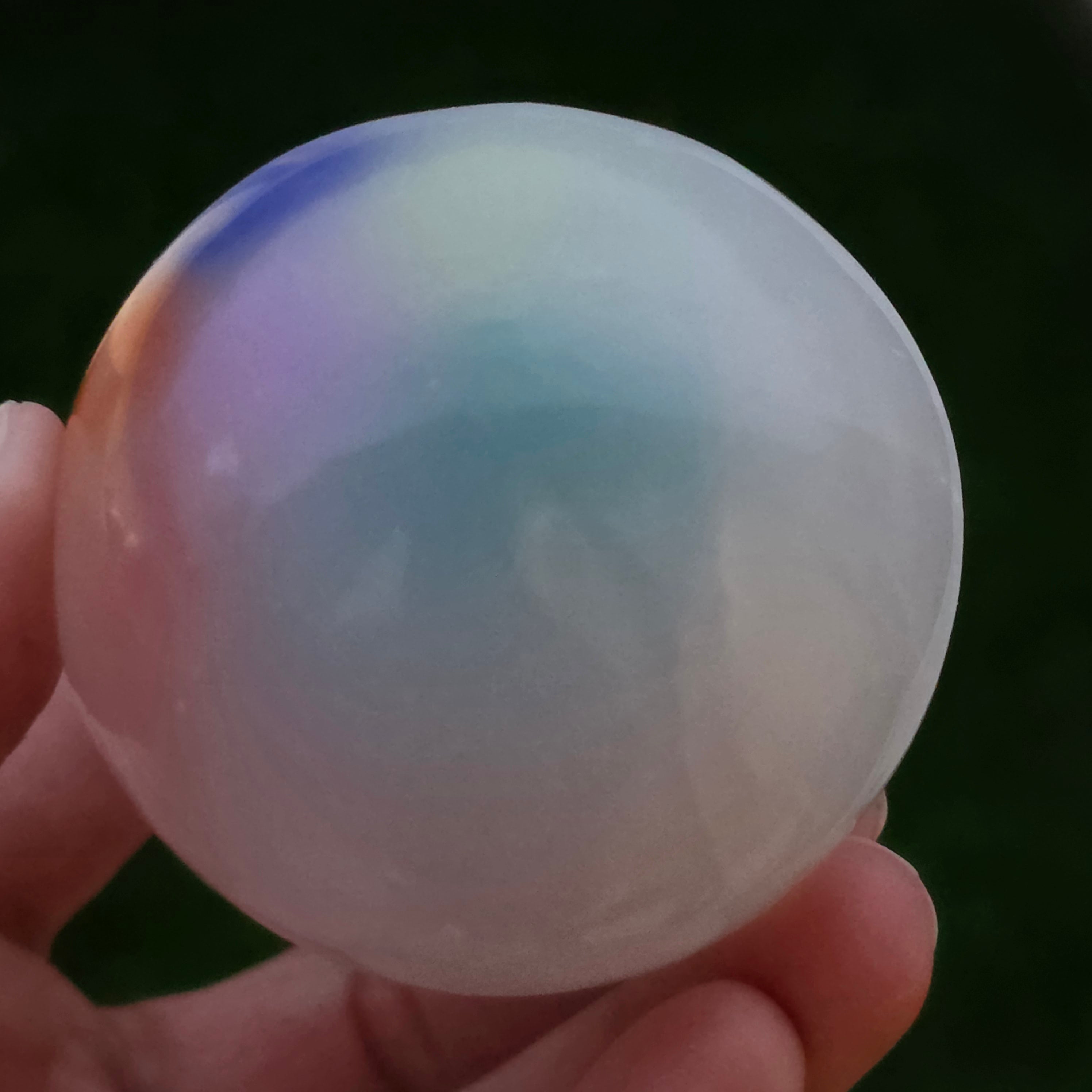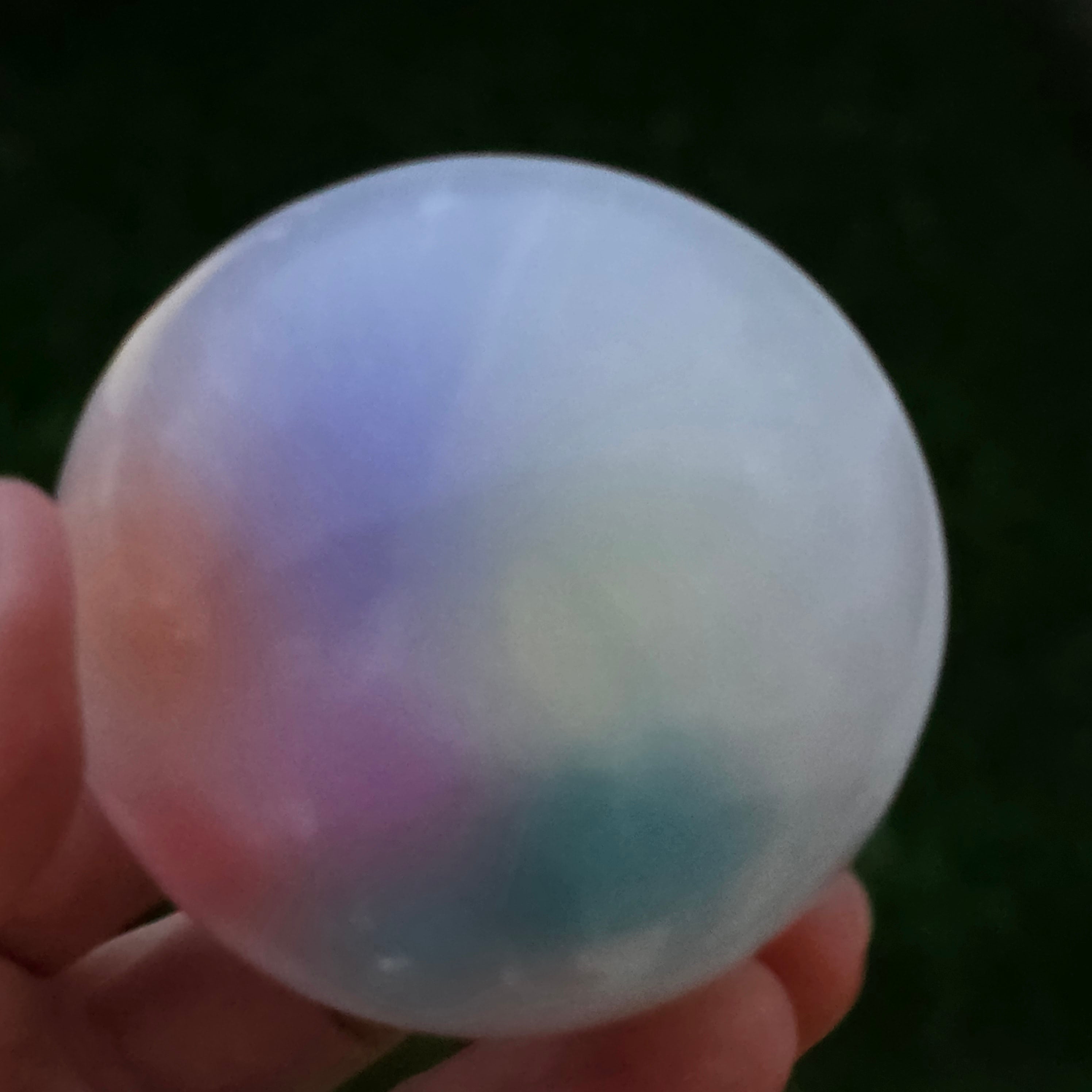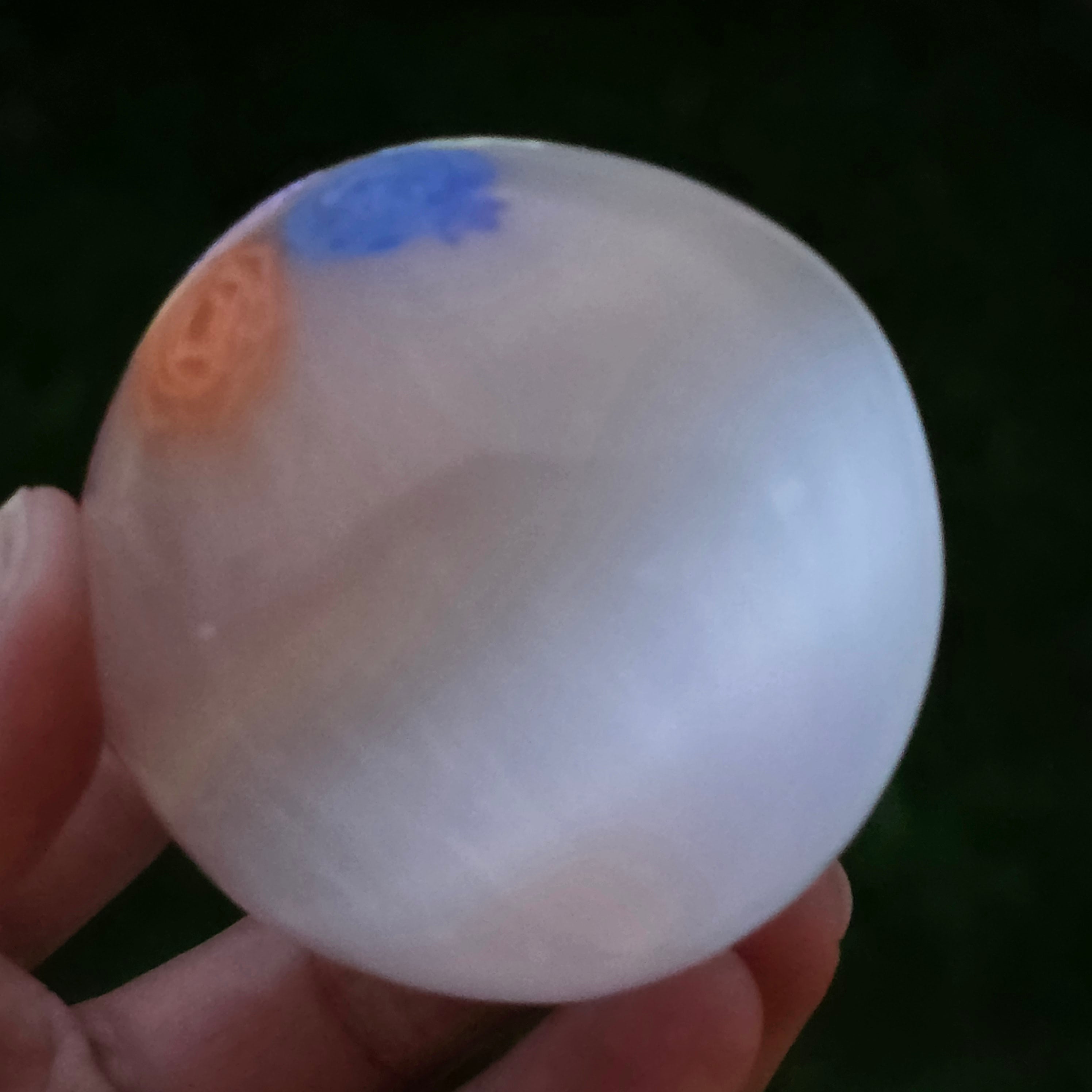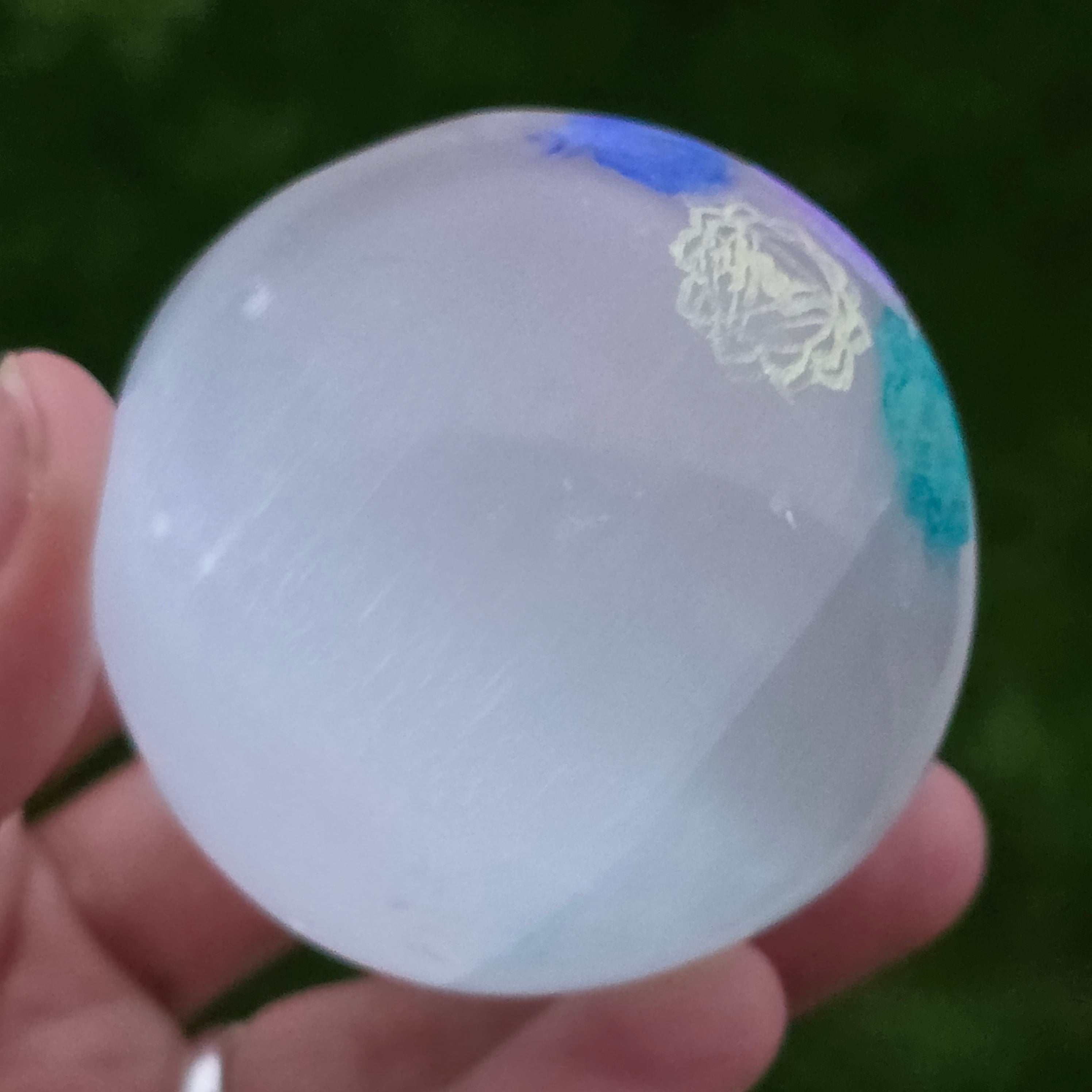 Această sfera din selenit este decorată cu simbolurile celor 7 chakre, fiecare gravat și colorat distinct, pentru a susține lucrul energetic și echilibrul interior. Selenitul este cunoscut ca piatra luminii și a purificării, fiind folosit atât pentru claritate mentală, cât și pentru curățarea altor cristale și a spațiului personal.