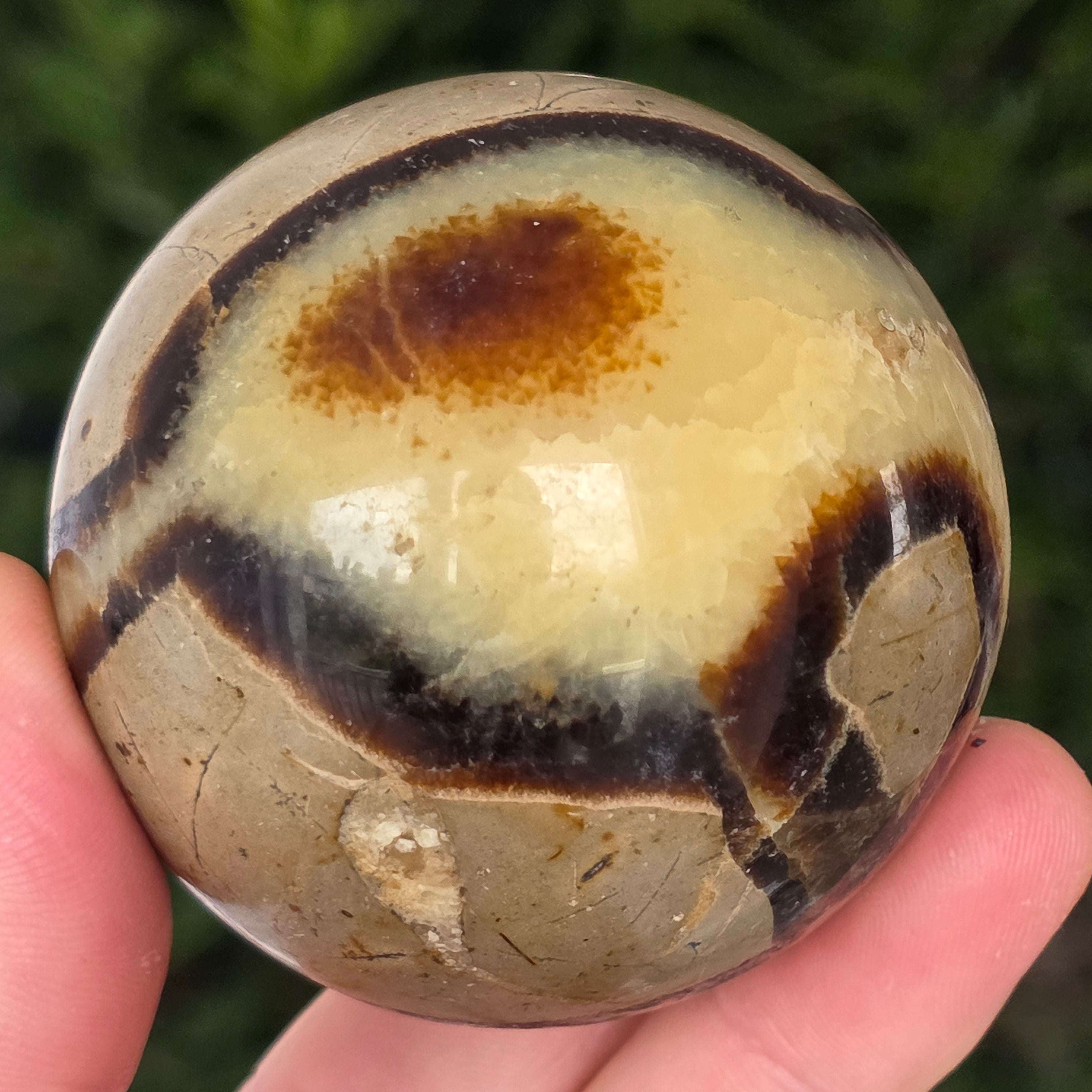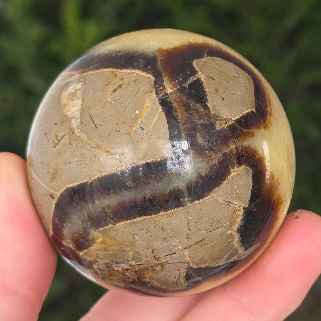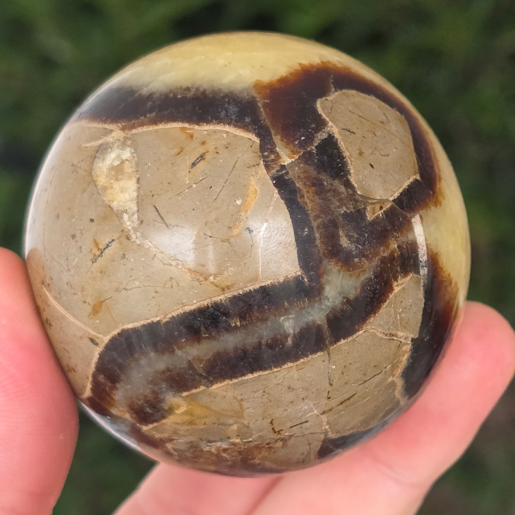 Septaria składa się z kalcytu, limonitu, gipsu i barytu, minerałów, które tworzą niepowtarzalną grę w tym kamieniu i nadają mu wyjątkowy wygląd.