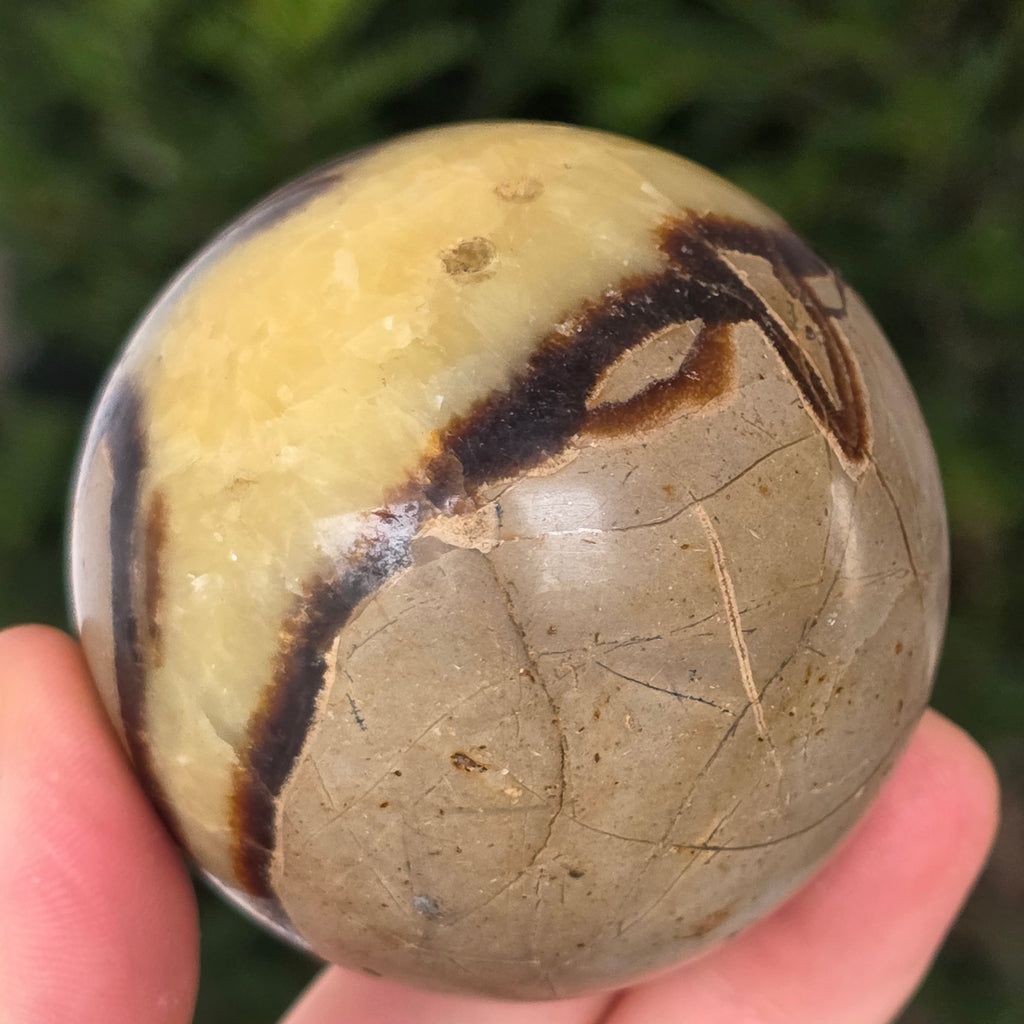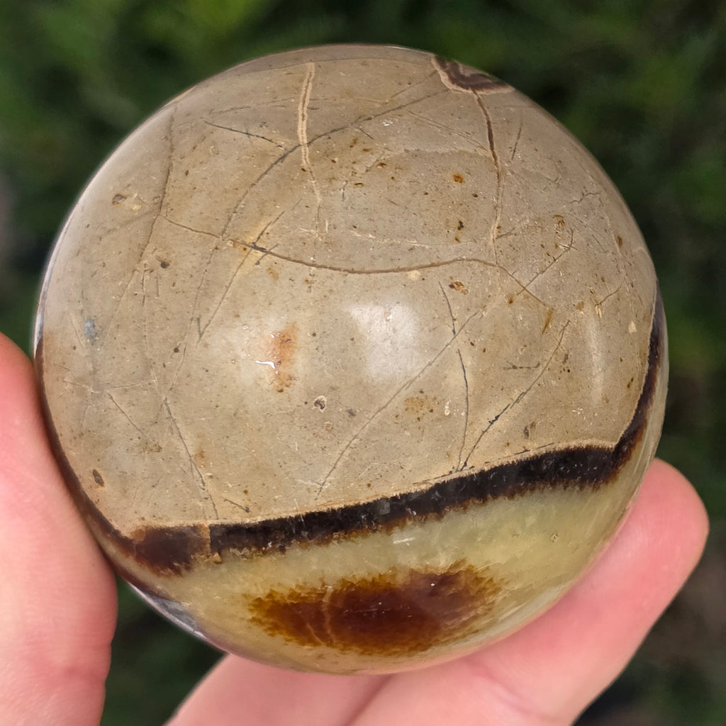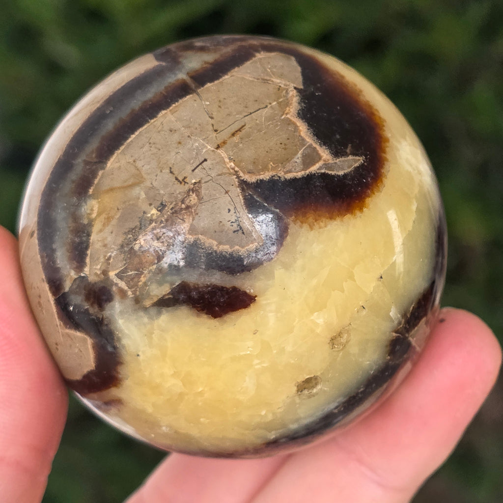 Septaria składa się z kalcytu, limonitu, gipsu i barytu, minerałów, które tworzą niepowtarzalną grę w tym kamieniu i nadają mu wyjątkowy wygląd.