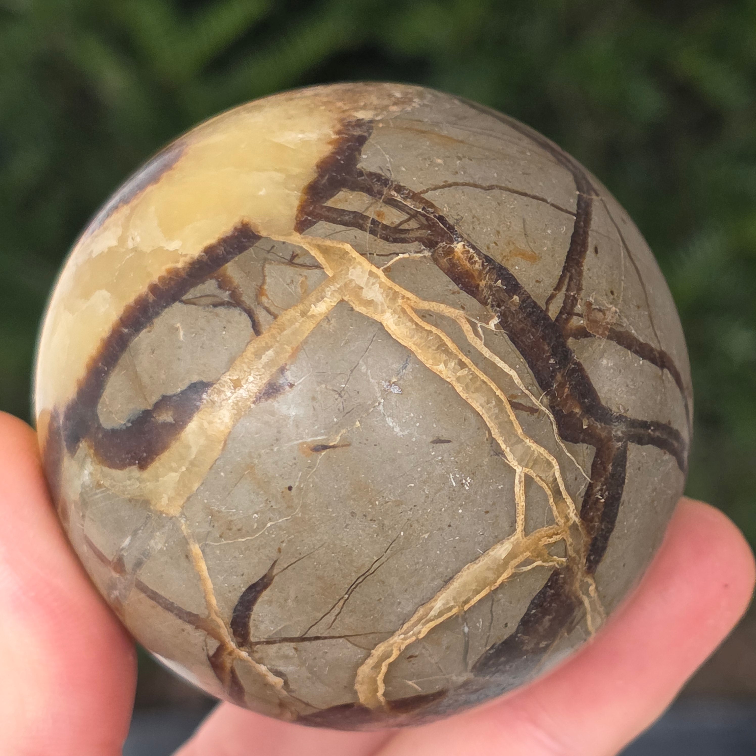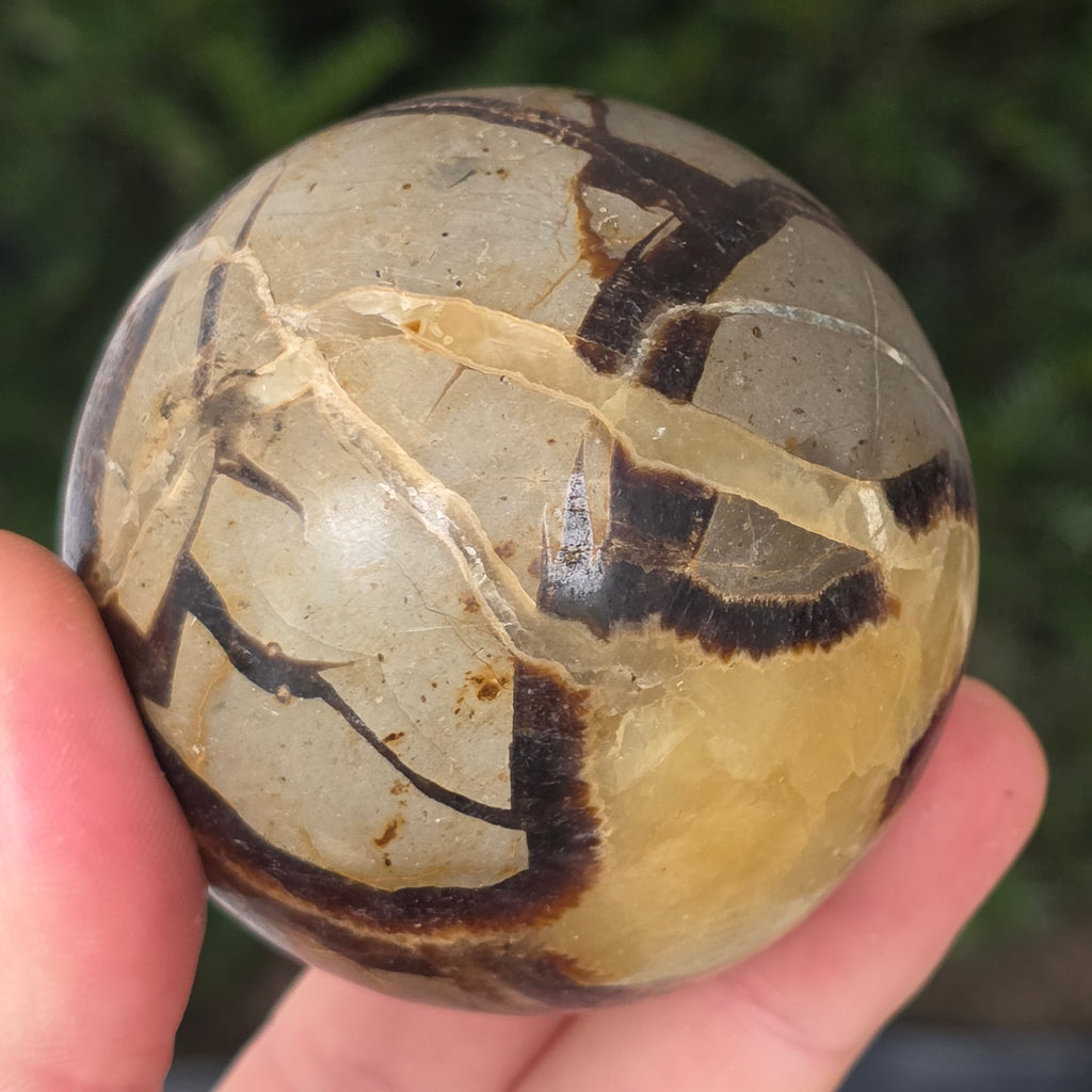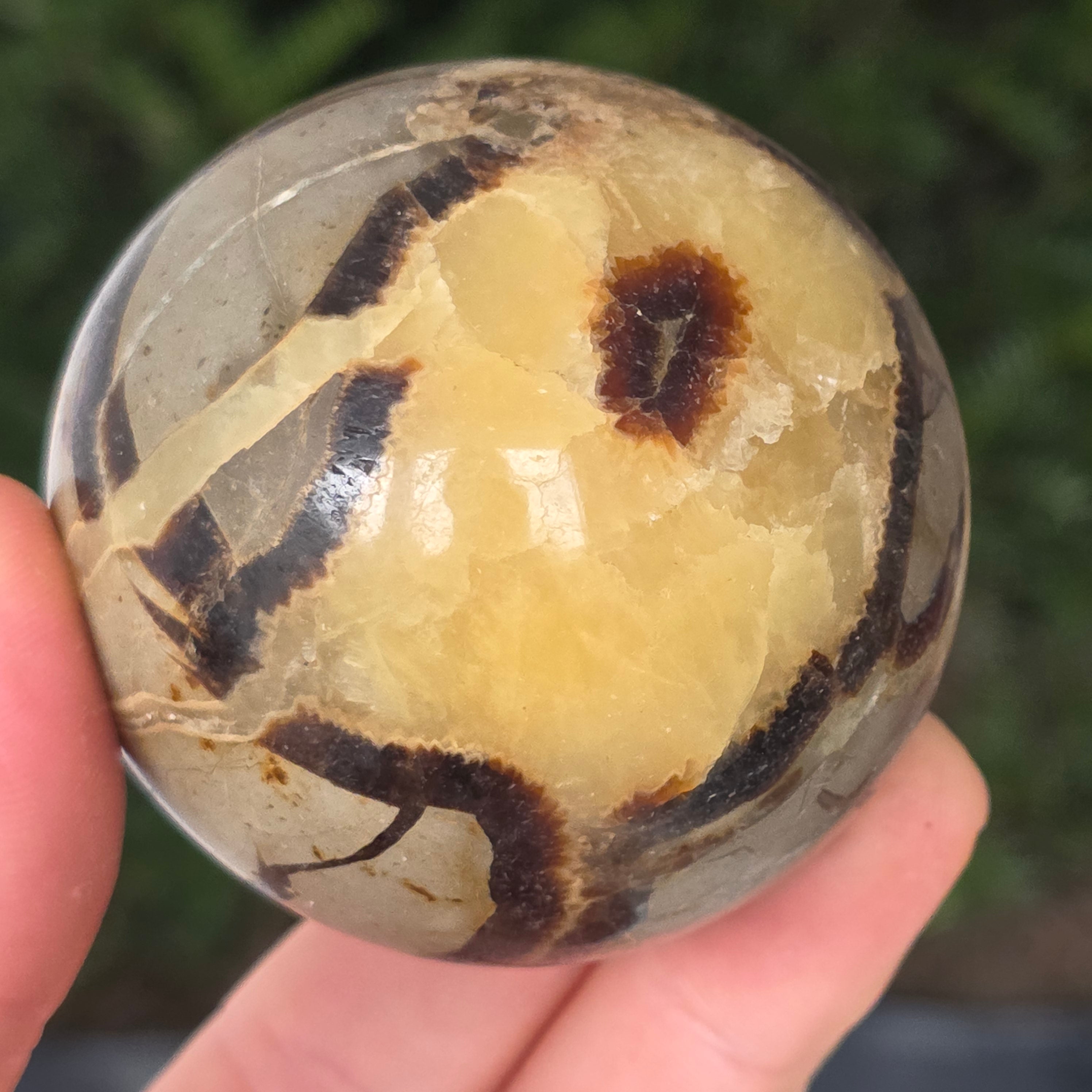 Septaria składa się z kalcytu, limonitu, gipsu i barytu, minerałów, które tworzą niepowtarzalną grę w tym kamieniu i nadają mu wyjątkowy wygląd.