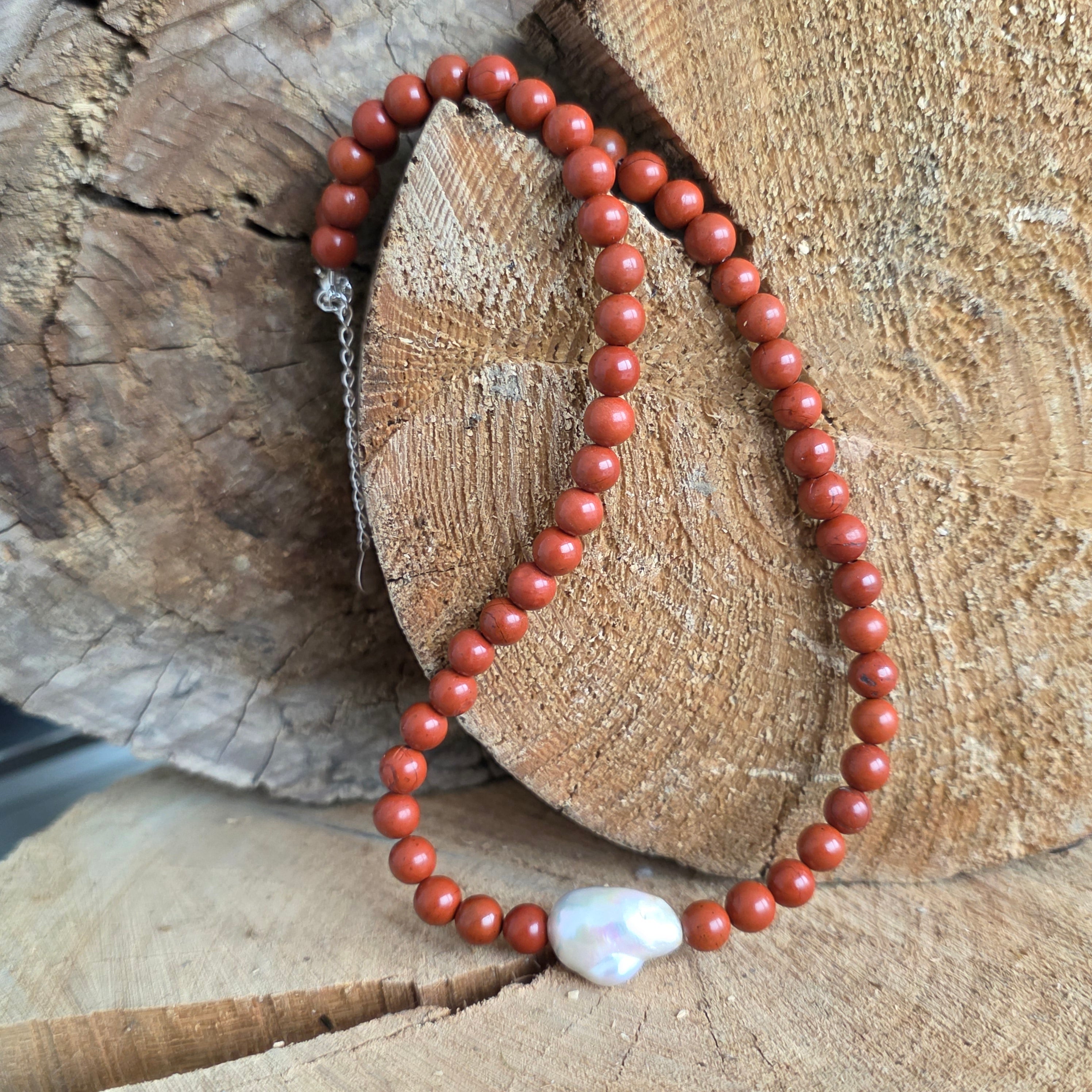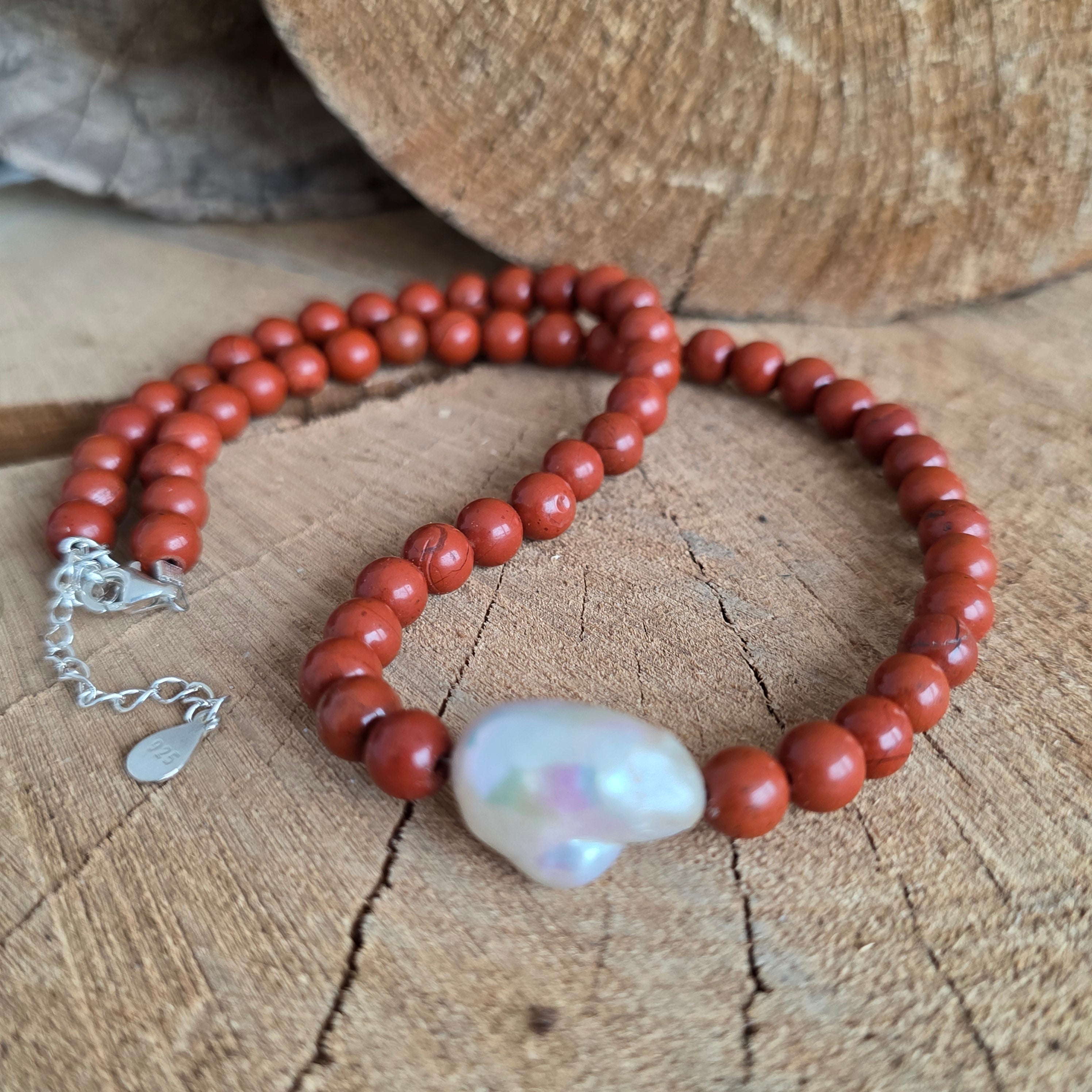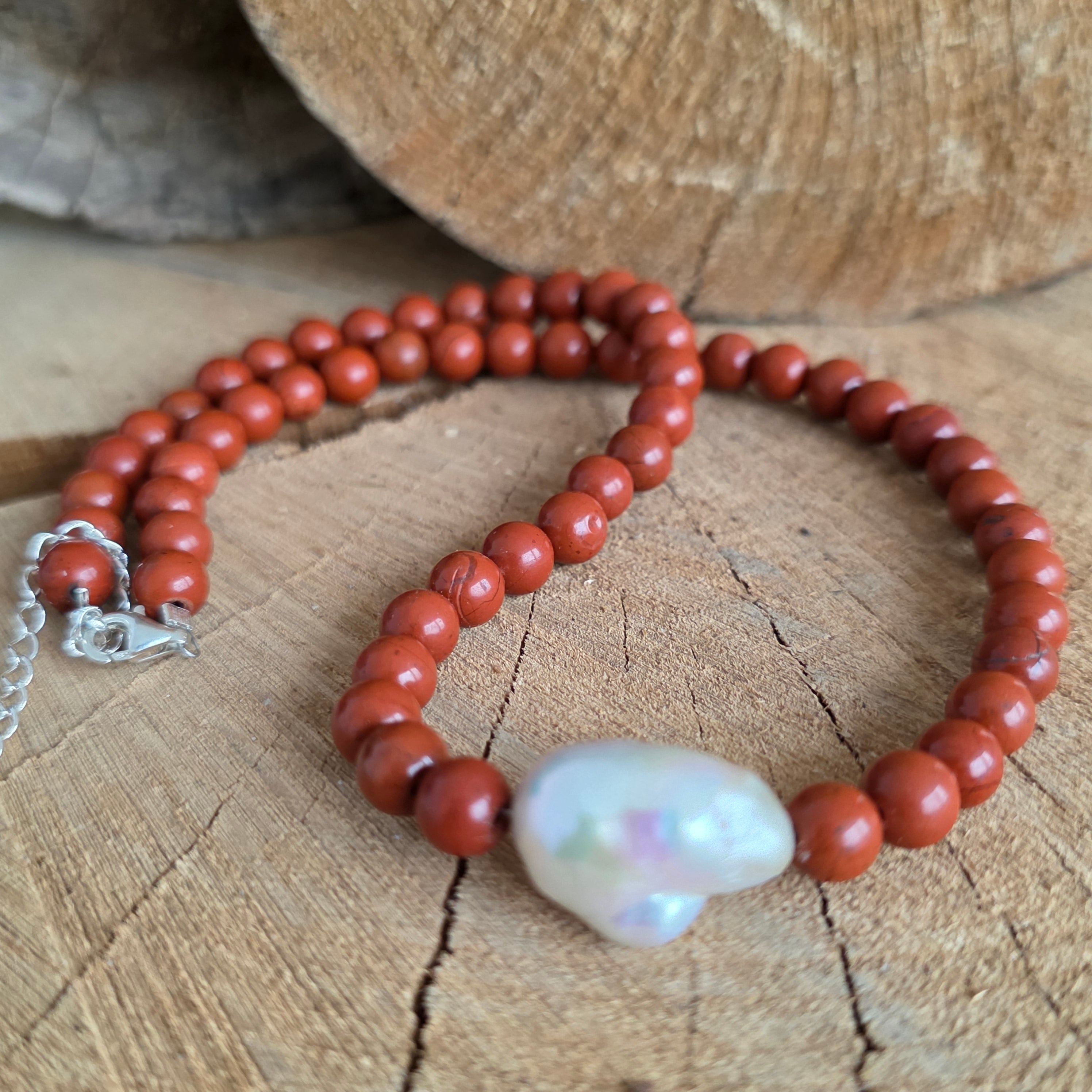 Czerwony jaspis jest uważany za kamień stabilności, odwagi i witalnej energii. Mówi się, że wzmacnia więź z Ziemią, dając poczucie pewności, bezpieczeństwa i wewnętrznej wytrwałości. W połączeniu z perłą, symbolem czystości i kobiecości, naszyjnik staje się subtelnym wyrazem harmonii między siłą a wdziękiem.