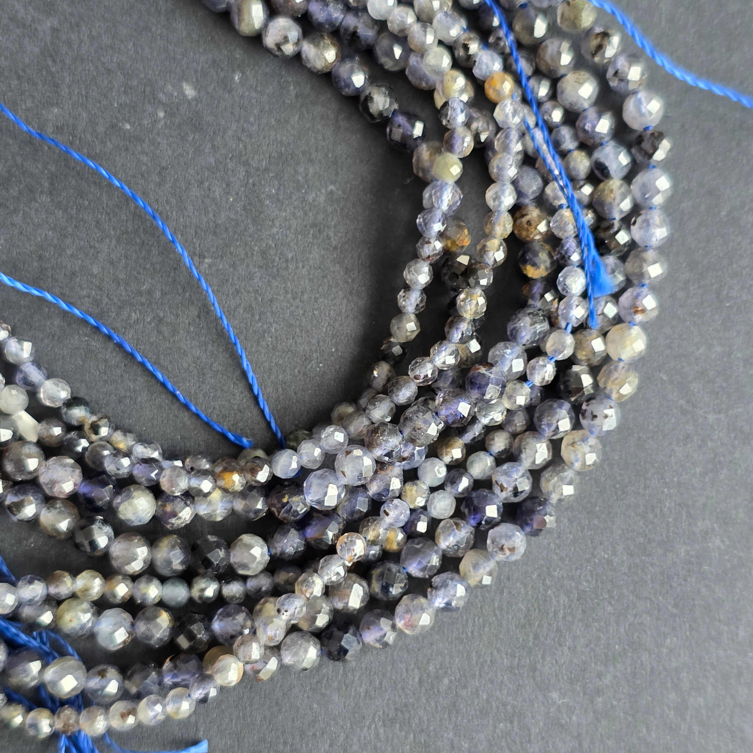 Sirag de sfere iolit, alcătuit din mărgele sferice fatetate naturale, perfect pentru coliere, brățări sau alte bijuterii handmade.