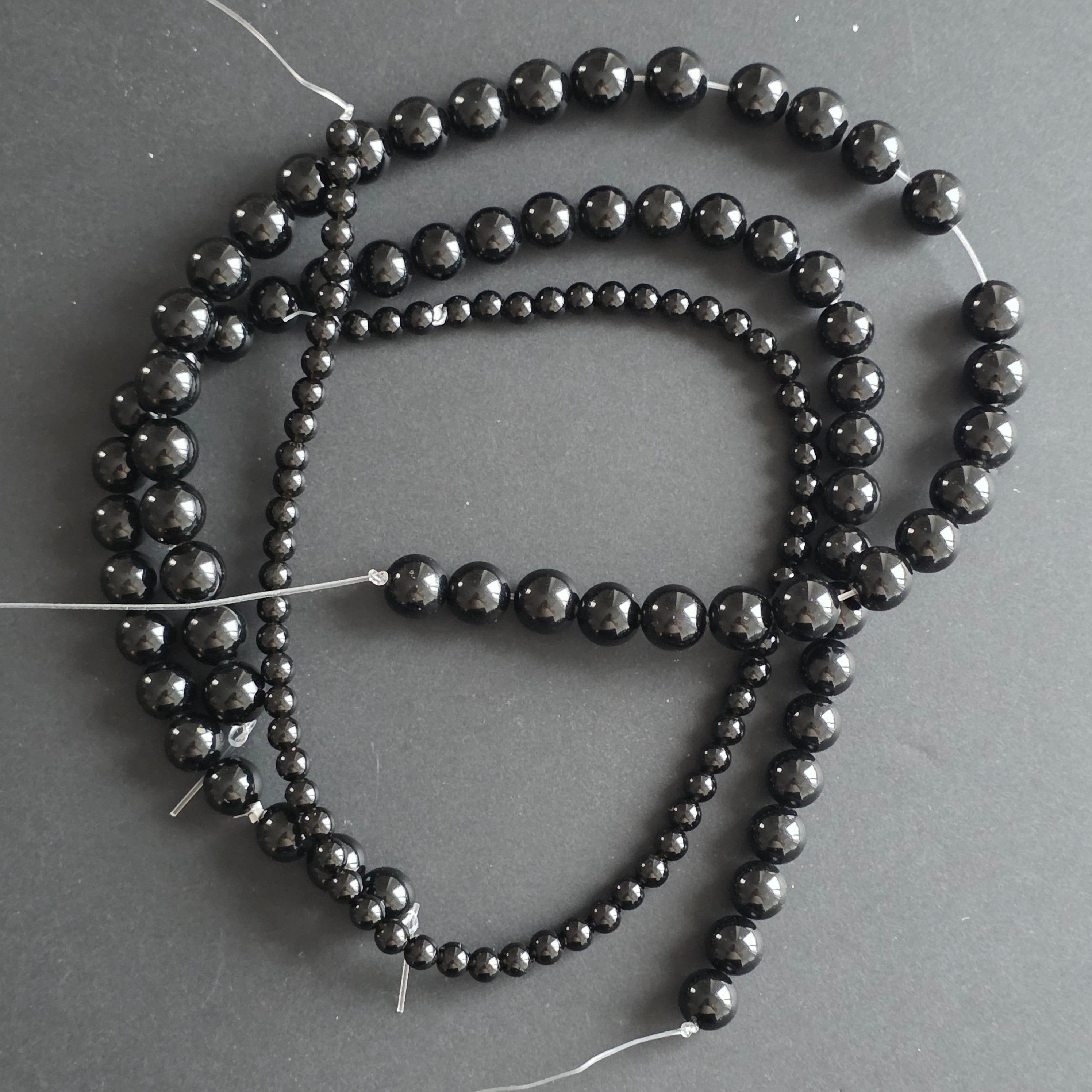 Sznur z obsydianu, składający się z naturalnych koralików w kształcie kul, idealny do naszyjników, bransoletek lub innych biżuterii ręcznie robionej.