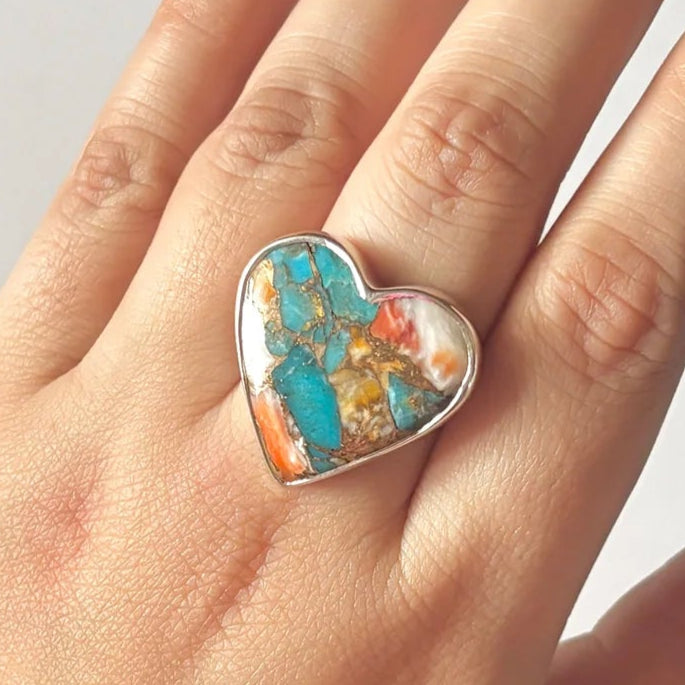 Ten żywy pierścień wykonany z 925 srebro i ozdobiony kompozytowym kamieniem Spiny Oyster i Turquoise, Wytnij w formie markizowej (Cat Eyes/Navette), to unikalny kawałek, który przyciąga spojrzenie przez spektakularną paletę kolorów: intensywna pomarańczowa, niebieska turcoaza i biała.