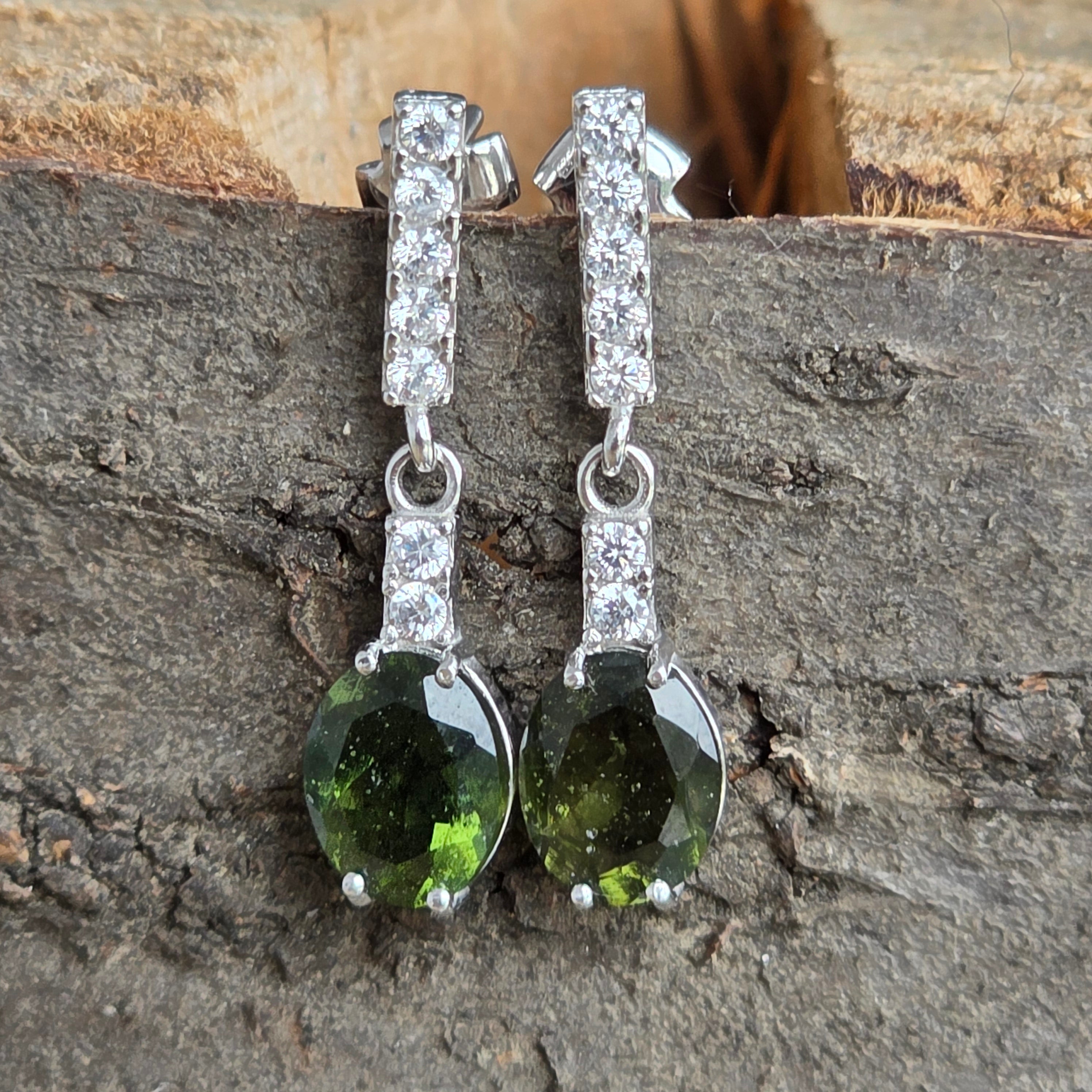 Te eleganckie kolczyki łączą unikalne piękno naturalnego Mołdawitu z dyskretnym blaskiem cyrkonu sześciennego, zamontowanego w wyrafinowanym srebrnym wzorze 925. Intensywne warzywa Moldavit, z głębokimi i tajemniczymi odbiciami, są podkreślone przez jasność białych kamieni, tworząc wyrafinowany kontrast.