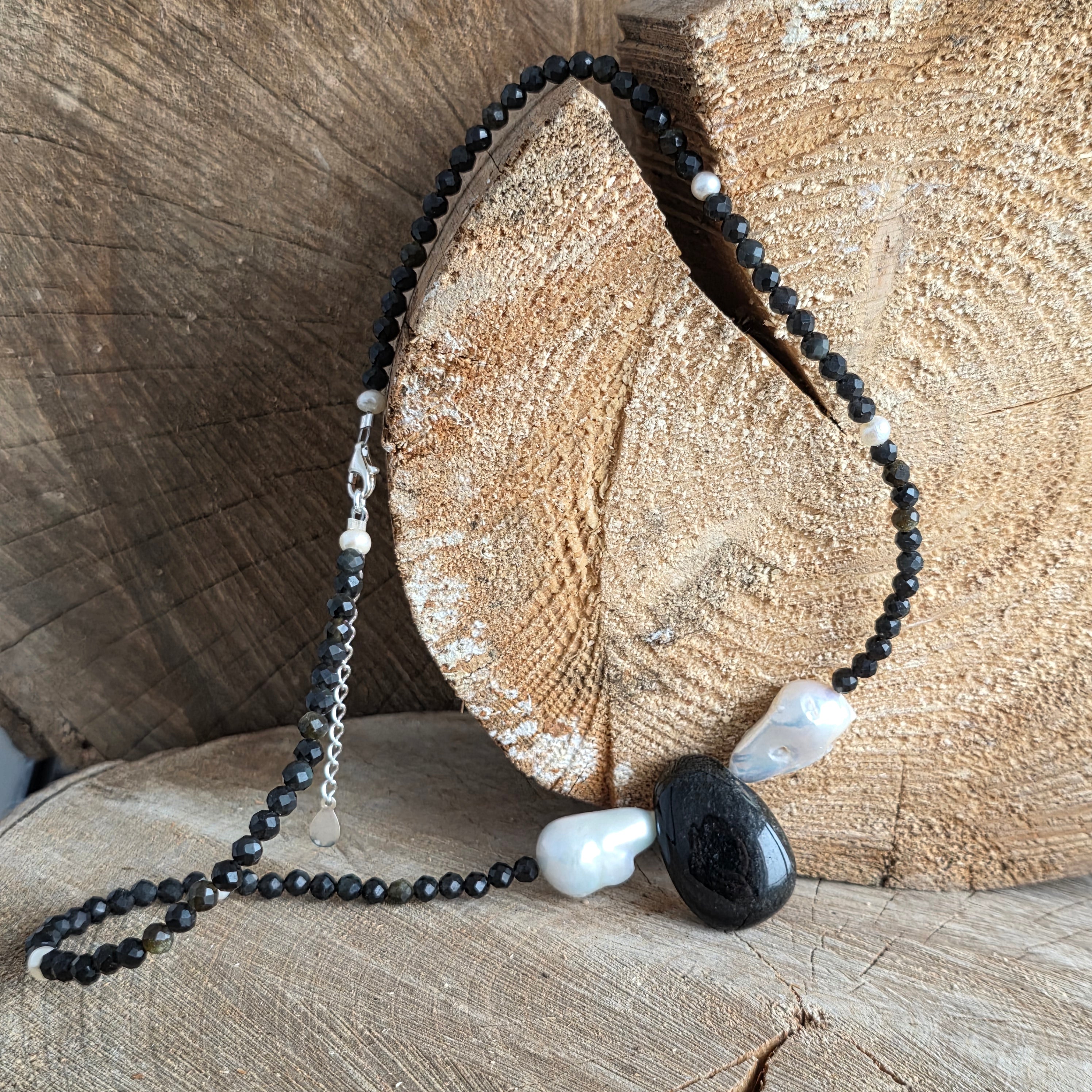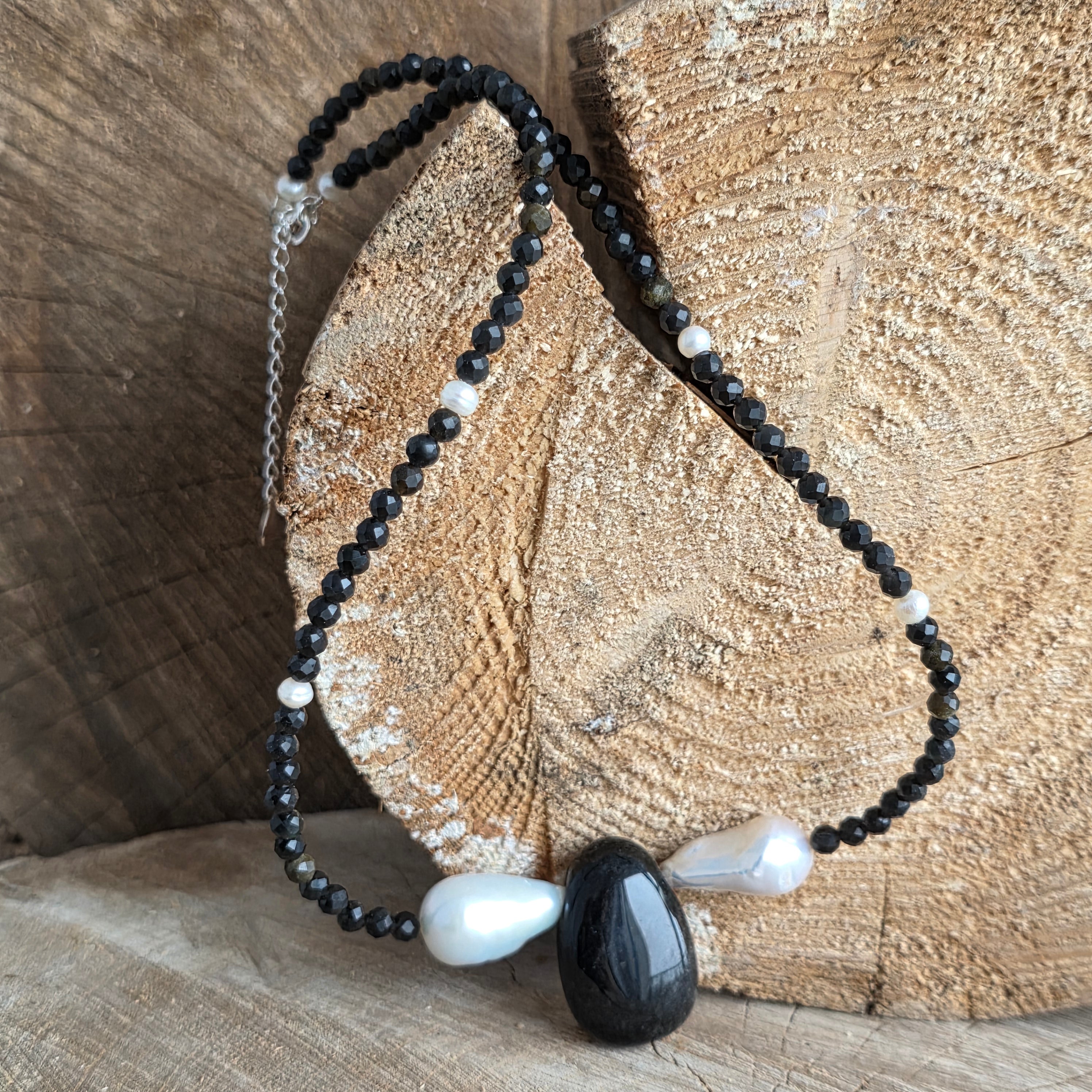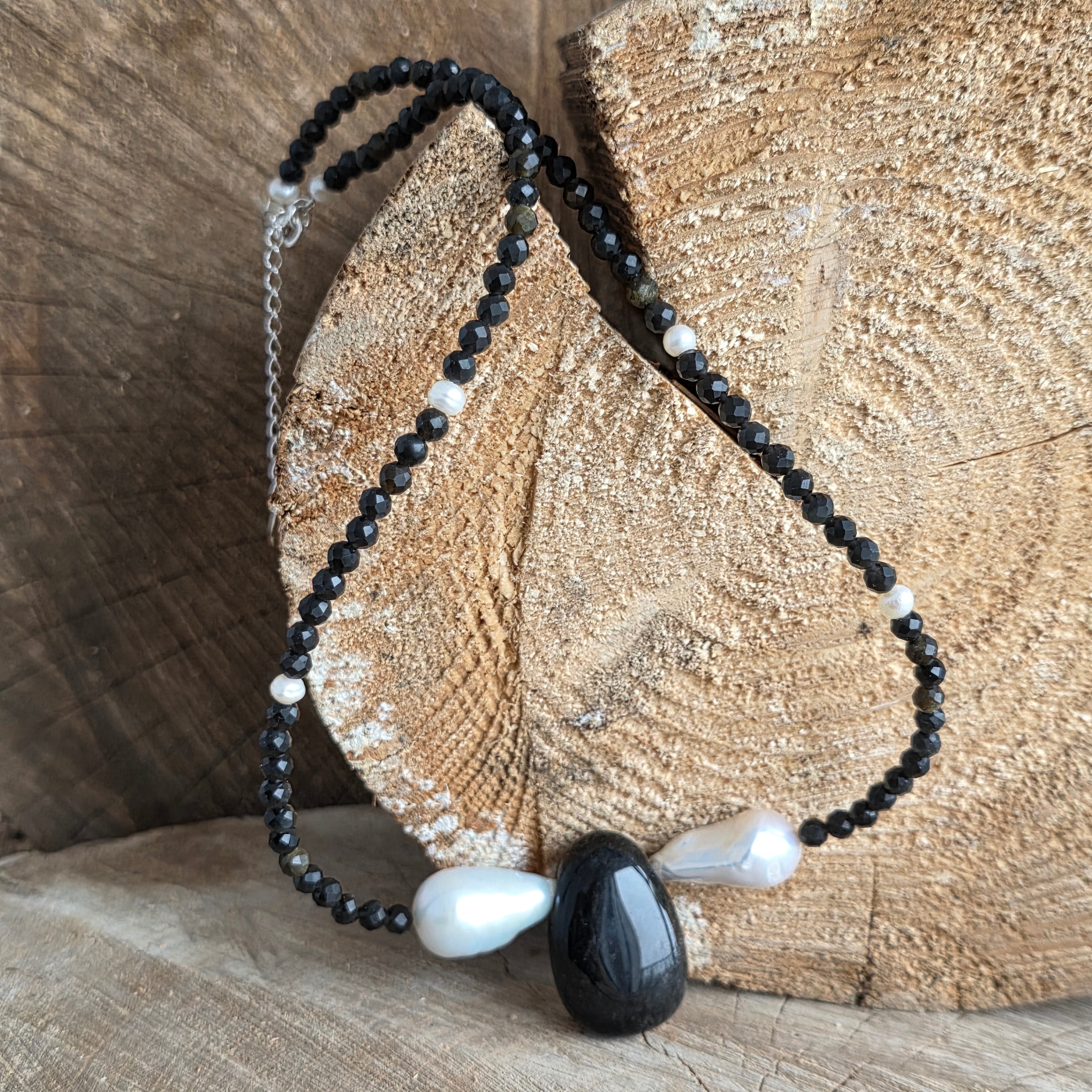 W środku naszyjnika wisiorek drop 3 cm srebrnego obsydianu opada jak pieczęć ochronna, głęboka i lśniąca, strzegąc serca spokojną i zdecydowaną obecnością. Dwie naturalne perły uzupełniają kompozycję nutami wdzięku i równowagi – zjednoczeniem siły ziemi i łagodności wód.