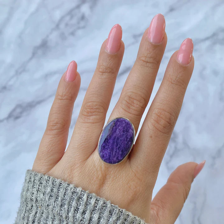 • Kamień: Charoit naturalny, krój owalny; unikalny model – otrzymujesz dokładnie taki produkt, jaki widzisz na zdjęciach