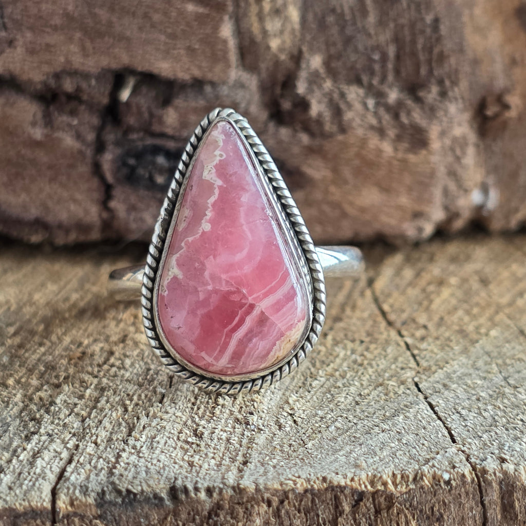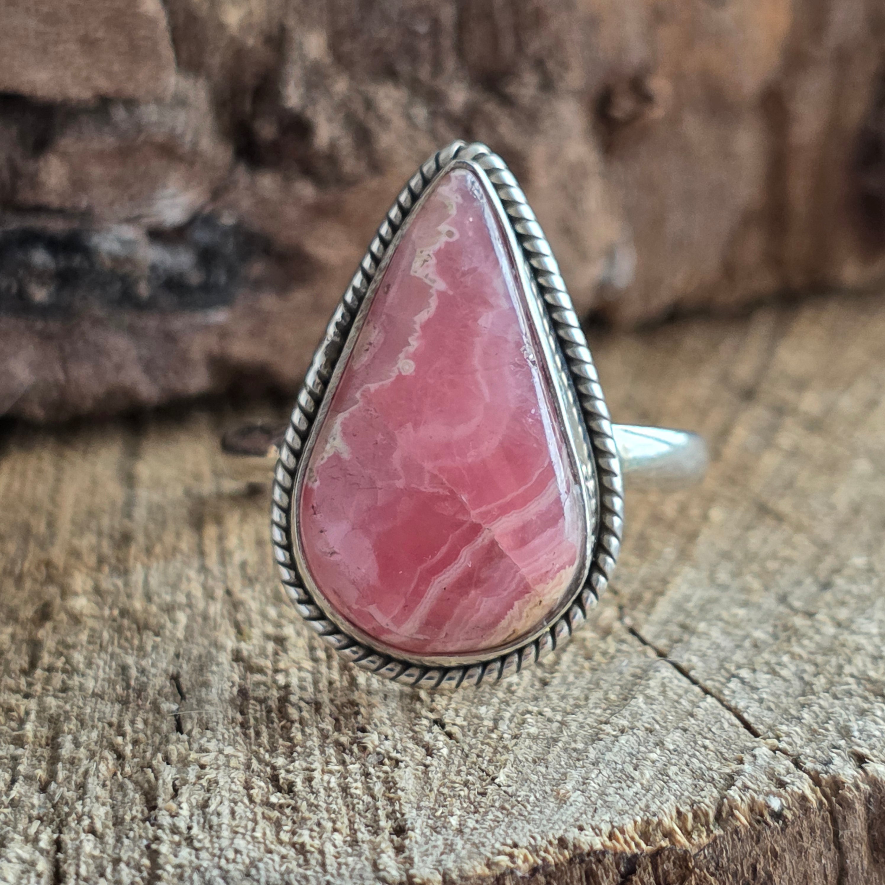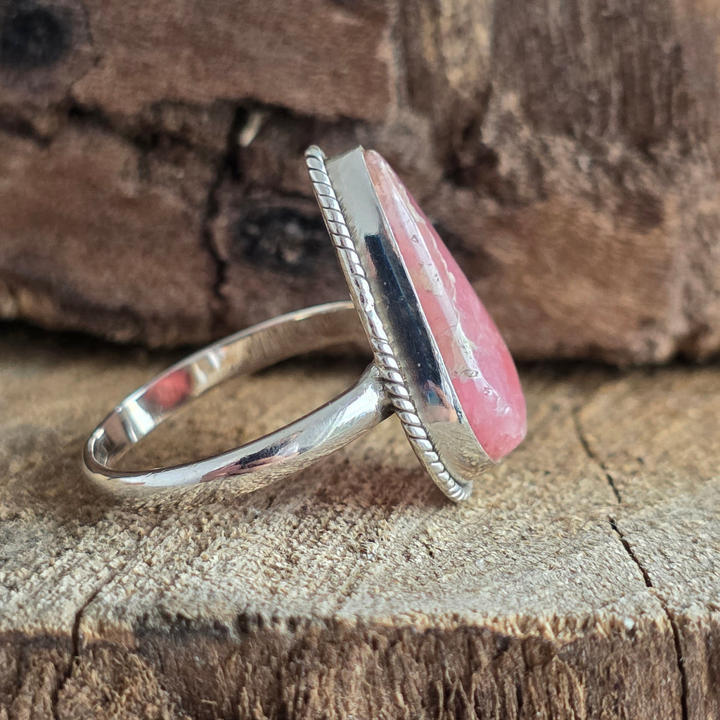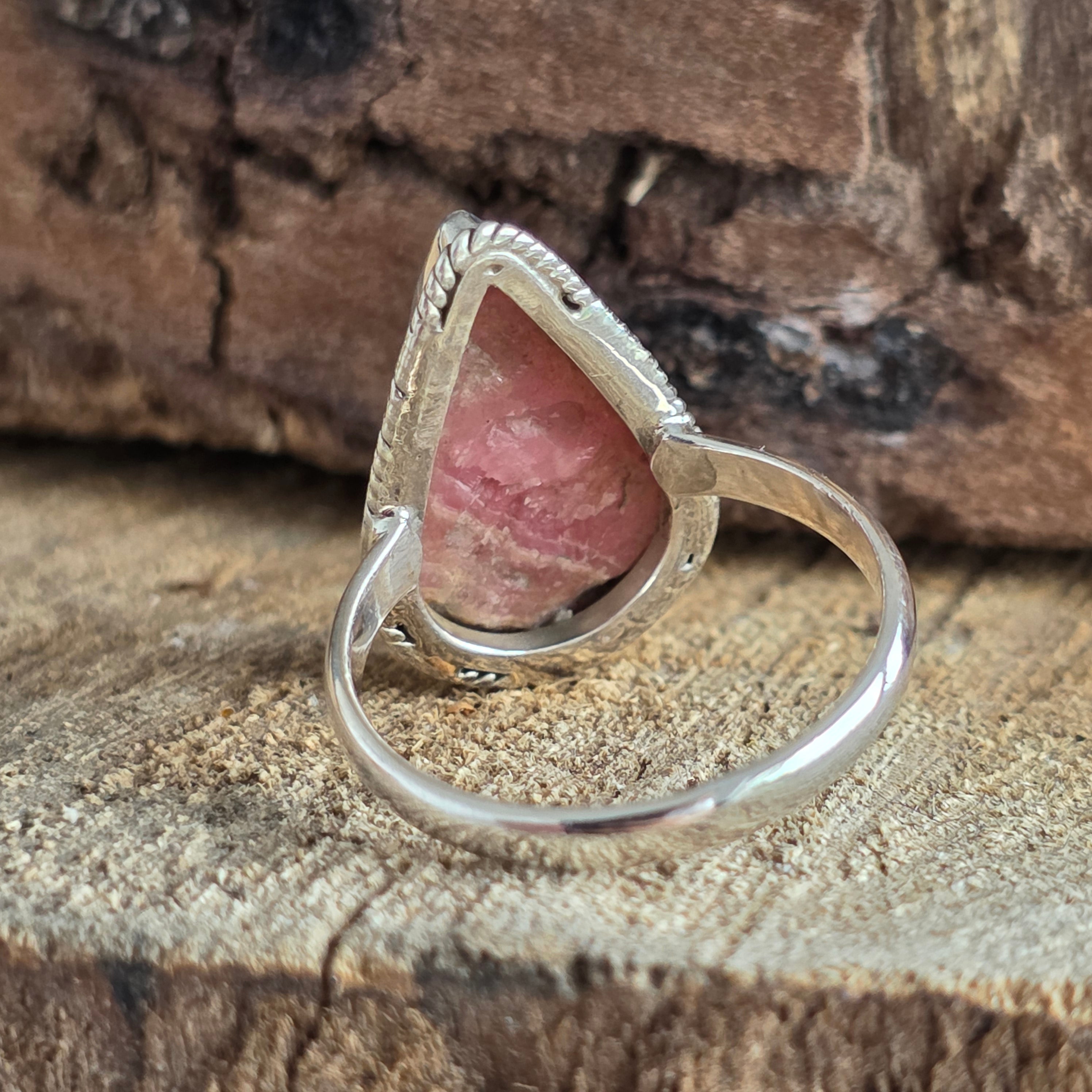 Elegancki pierścionek ze srebra próby 925 z naturalnym rodochrozytem w intensywnym różowym odcieniu z ciepłymi refleksami i wyjątkową fakturą. Projekt praca ze skręconym drutem, ręcznie wykonany, dodaje uroku vintage i wydobywa naturalność kamienia.