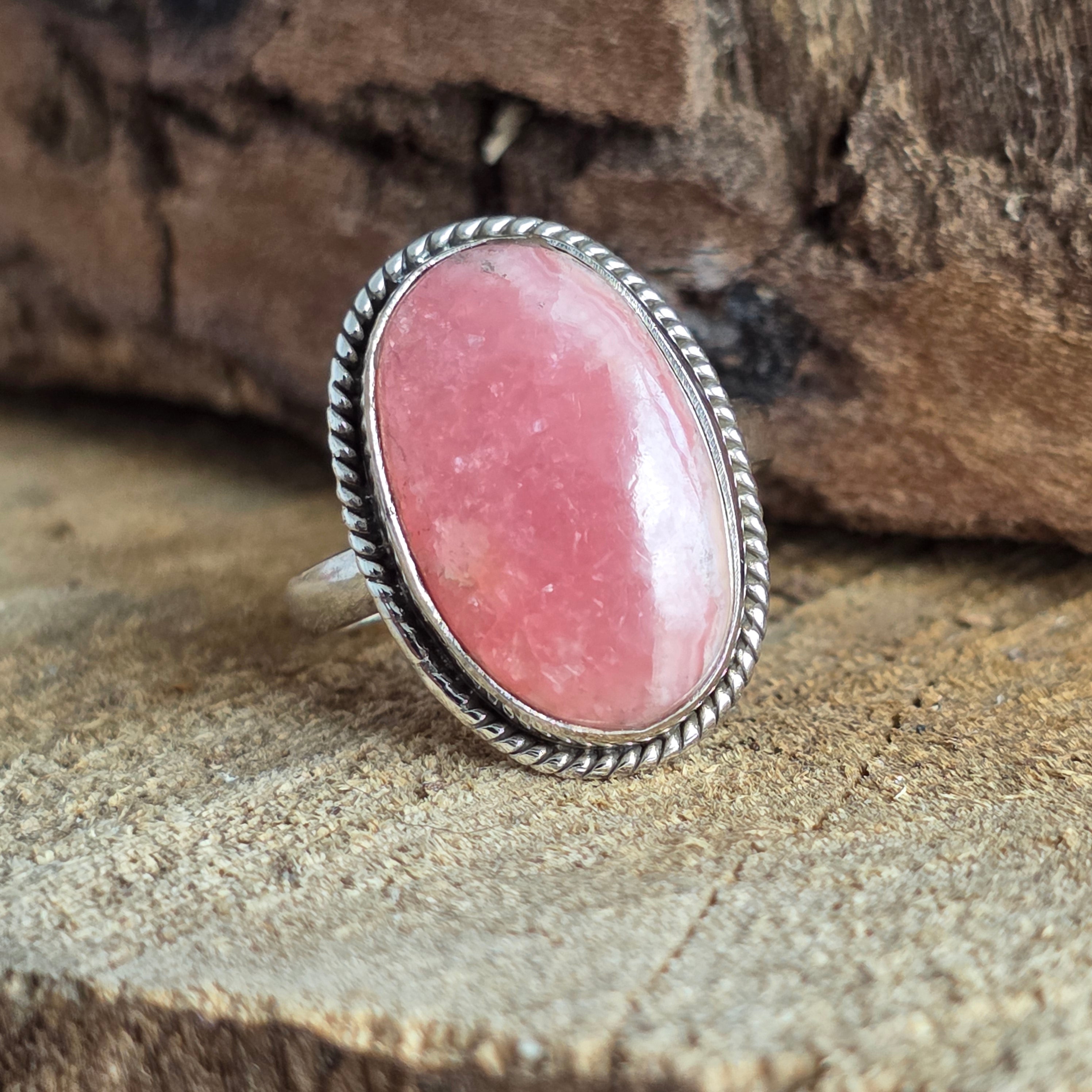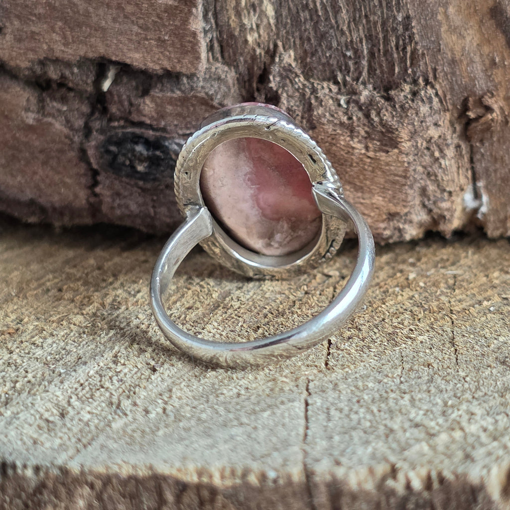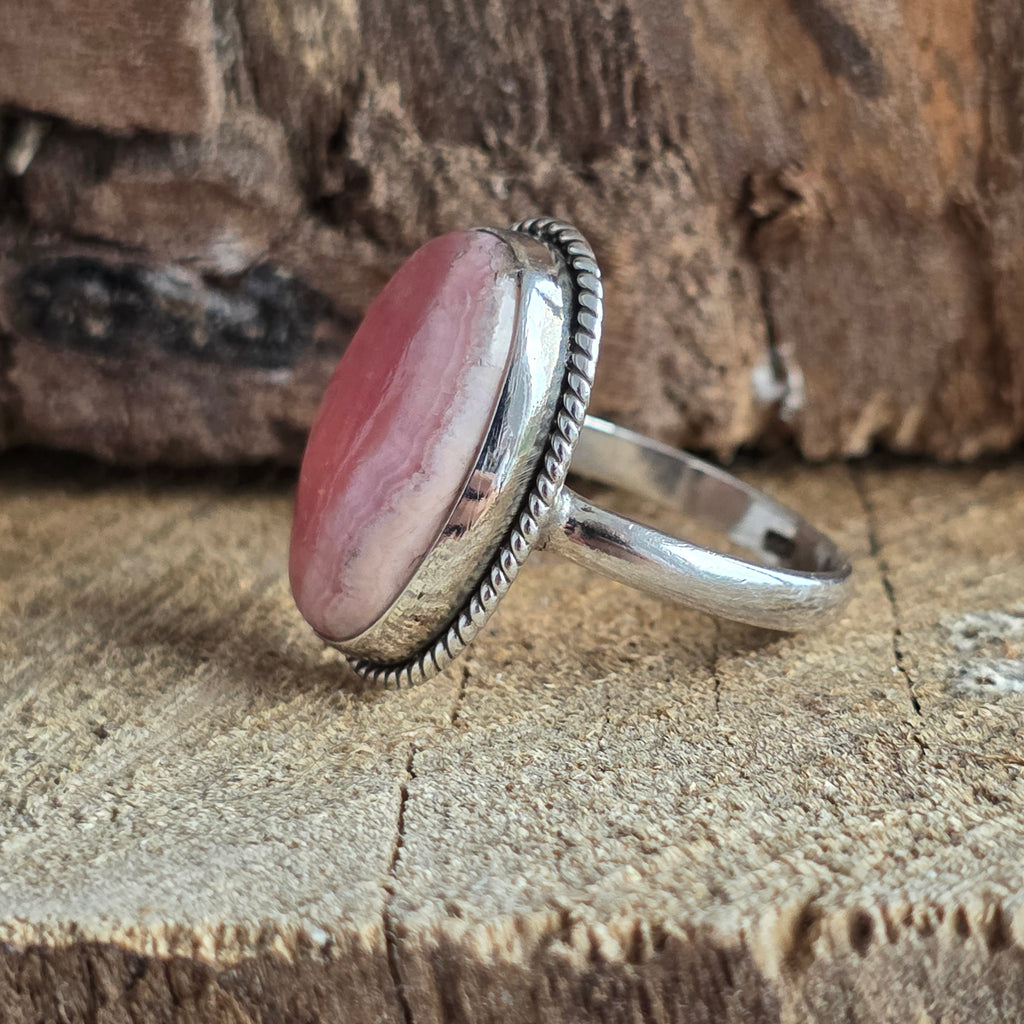 • Elegancki i kobiecy pierścionek ze srebra próby 925 z naturalnym rodochrozytem o owalnym szlifie, odsłaniającym delikatne warstwy różu i bieli. Projekt praca ze skręconym drutem, ręcznie robiony, nadaje klejnotowi styl vintage i wyrafinowany, odpowiedni dla miłośników prawdziwych kamieni naturalnych.