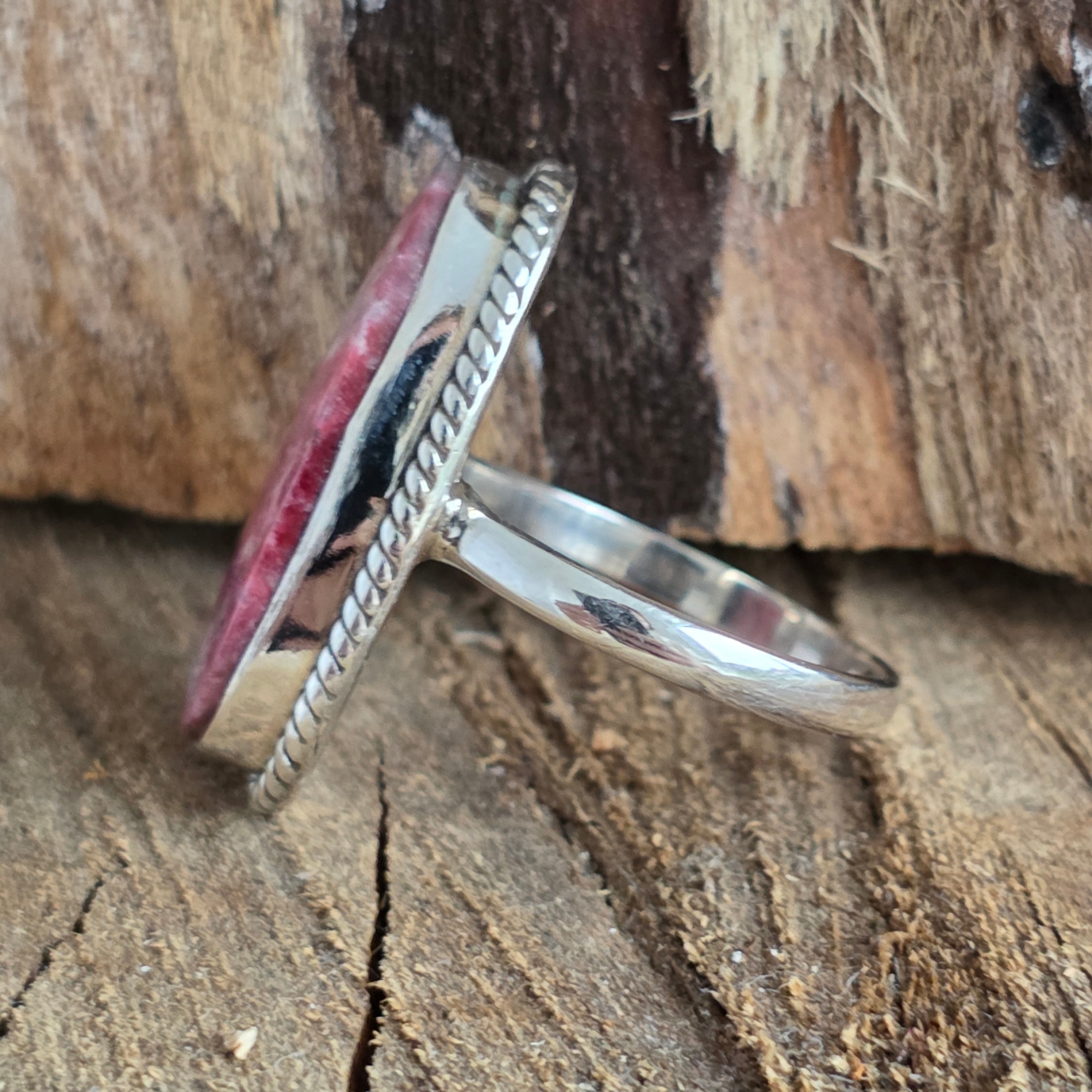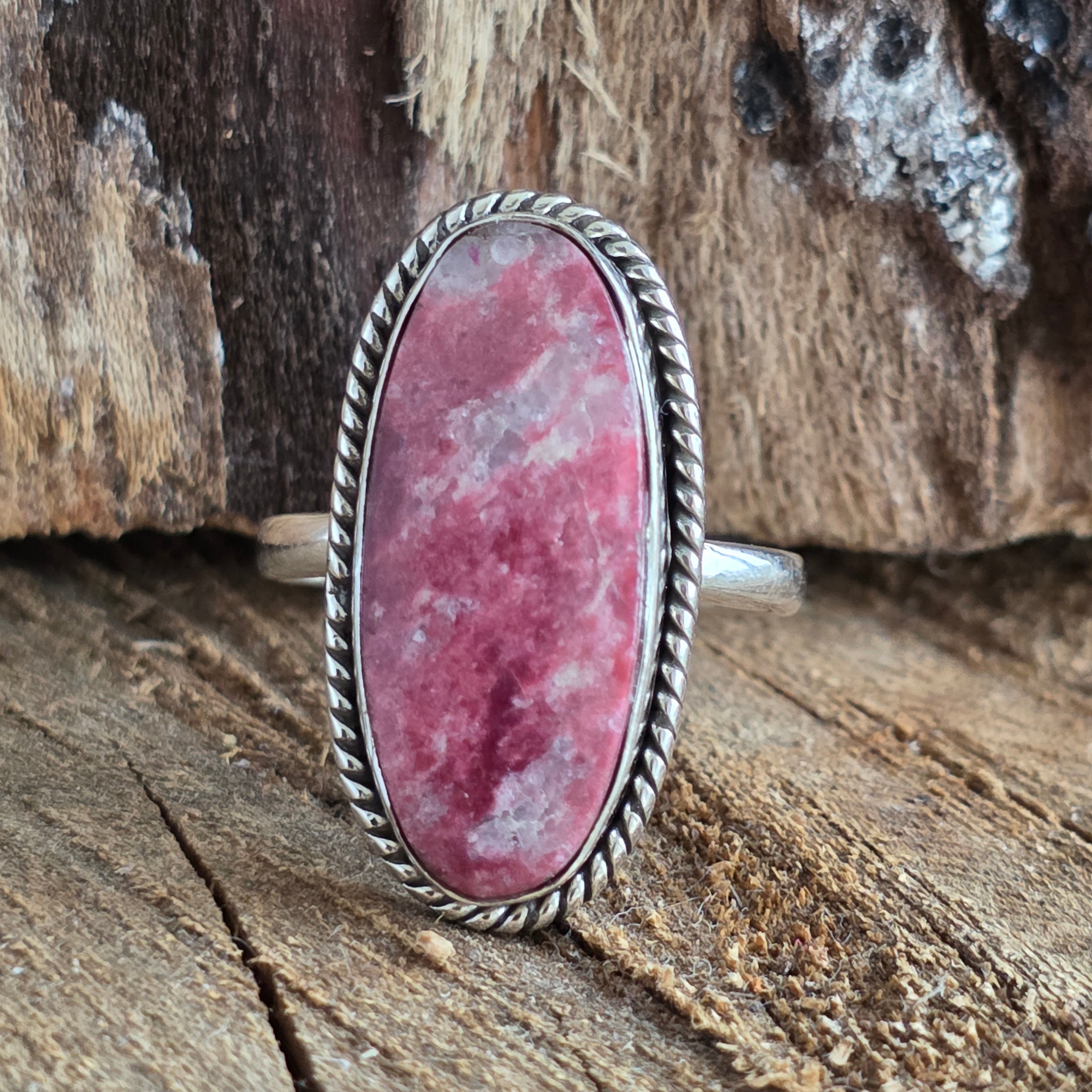 Pierścionek ze srebra próby 925, który niesie w sobie energię nordyckiej ziemi – Tulit, różowa odmiana zoisytu o naturalnej fakturze i subtelnych różnicach kolorystycznych pomiędzy łososiowym różem, fuksją i kredową bielą.