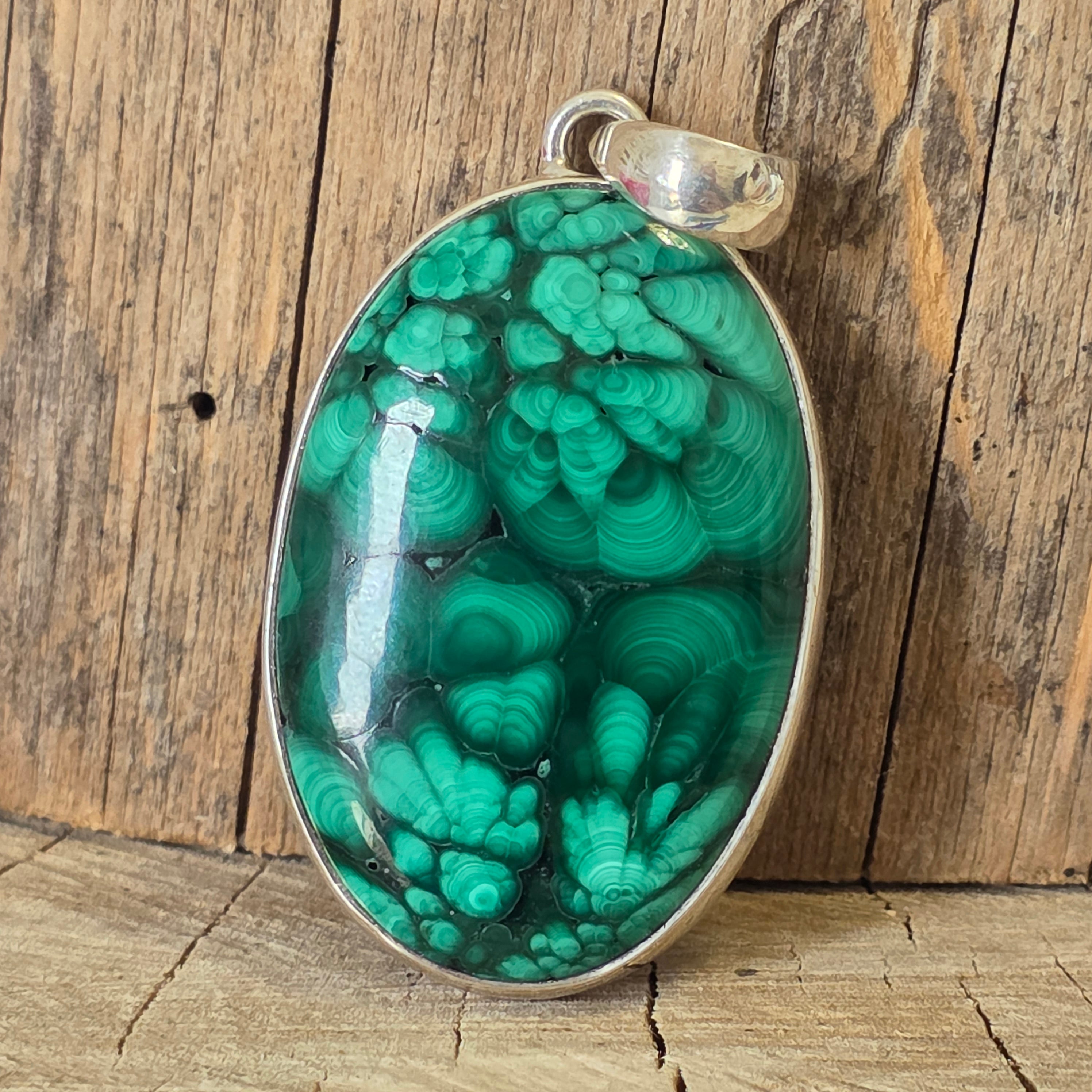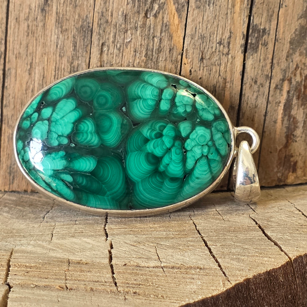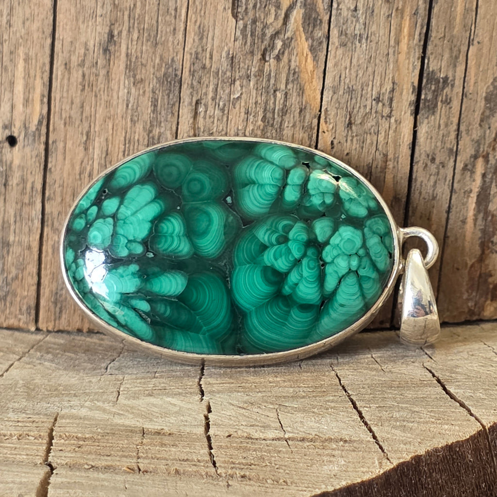 Ten masywny wisiorek od naturalny malachit i Srebro próby 925 wyróżnia się intensywnymi odcieniami zieleni i efektownymi okrągłymi wzorami, charakterystycznymi dla tego minerału. Kamień o owalnym szlifie w stylu kaboszonu jest podkreślony prostą srebrną oprawą, która zachowuje jego naturalne piękno.