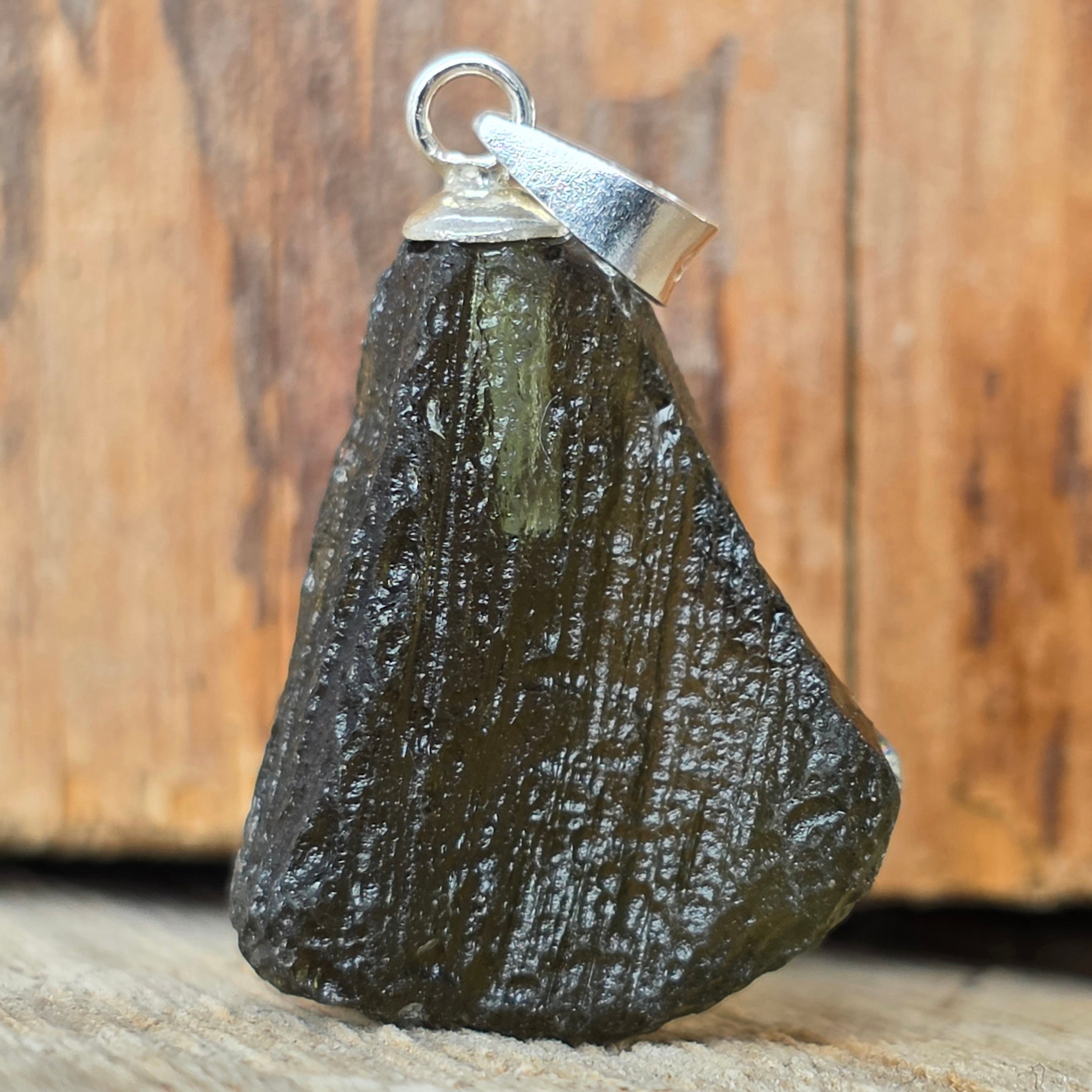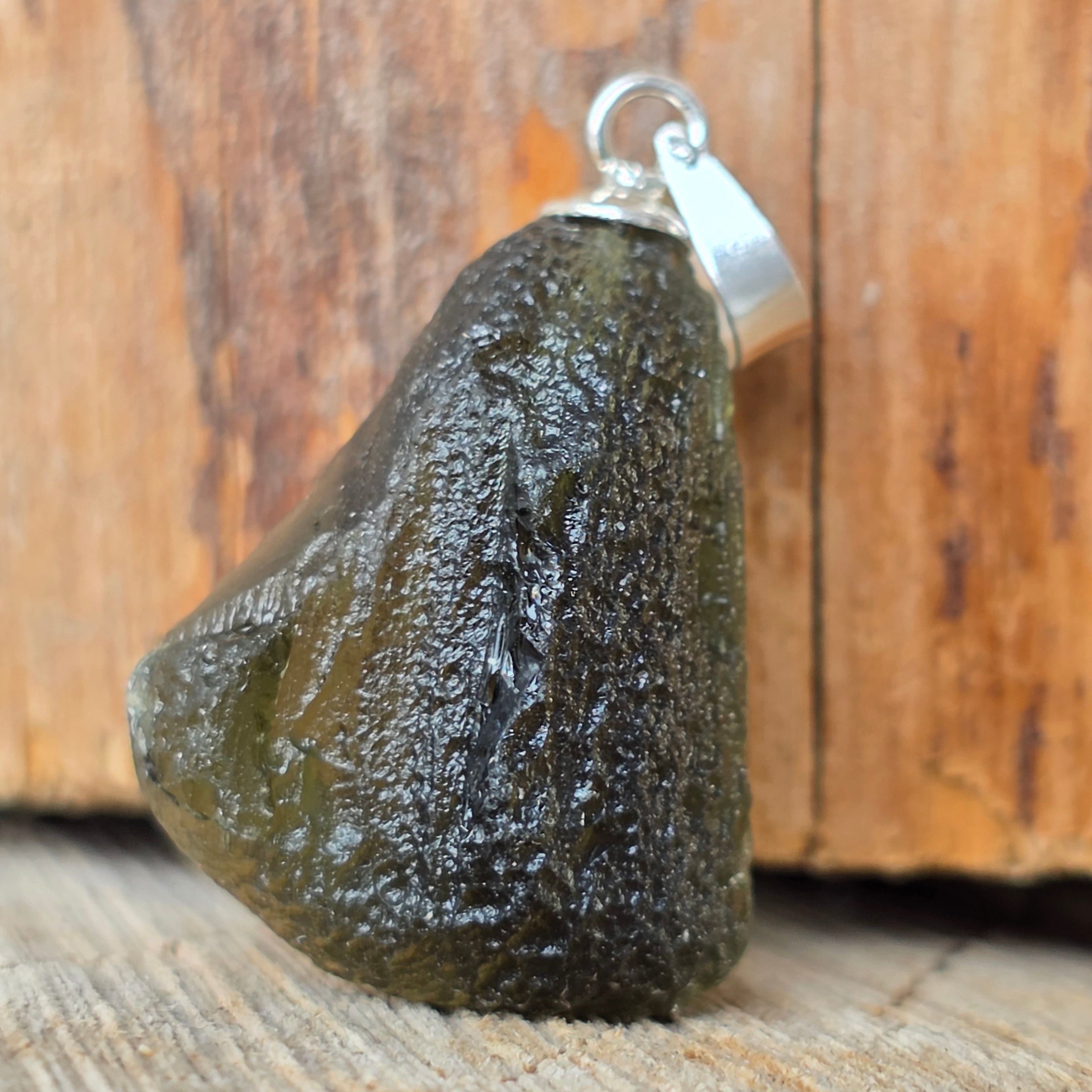 Rzadki i autentyczny wisiorek, wykonany z Moldavit brutto, elegancko zamontowany 925 srebro.
