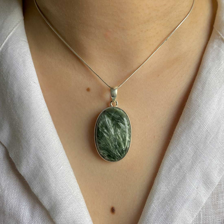 Serafinit wyróżnia się subtelnymi odcieniami zieleni, harmonijnie połączonymi ze srebrnymi lub białymi pasmami, które przypominają skrzydła anioła. To połączenie kolorów i naturalnych wzorów tworzy delikatny i urokliwy wygląd biżuterii. Serafinit jest często kojarzony z energią anielską i duchową, uważany za kamień światła i boskiej miłości.