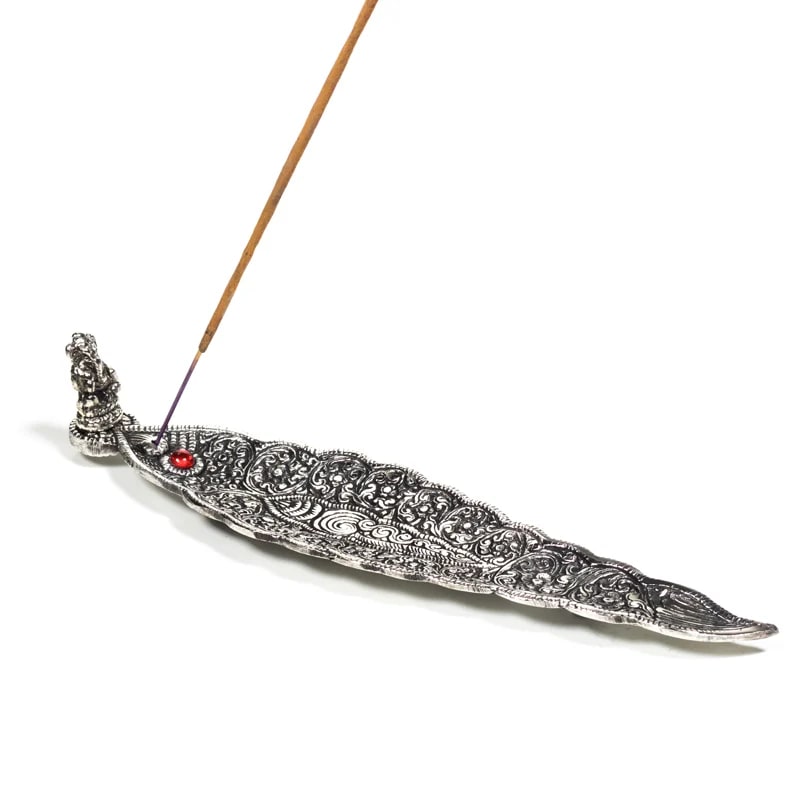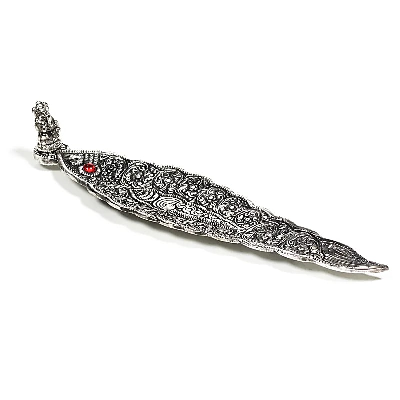 Ten stojak na kadzidełka wykonany jest z aluminium i ma elegancki design inspirowany motywem Ganesh Leaf. Jego wydłużony kształt umożliwia bezpieczne spalanie kadzidełka, zbierając popiół na powierzchni stojaka.