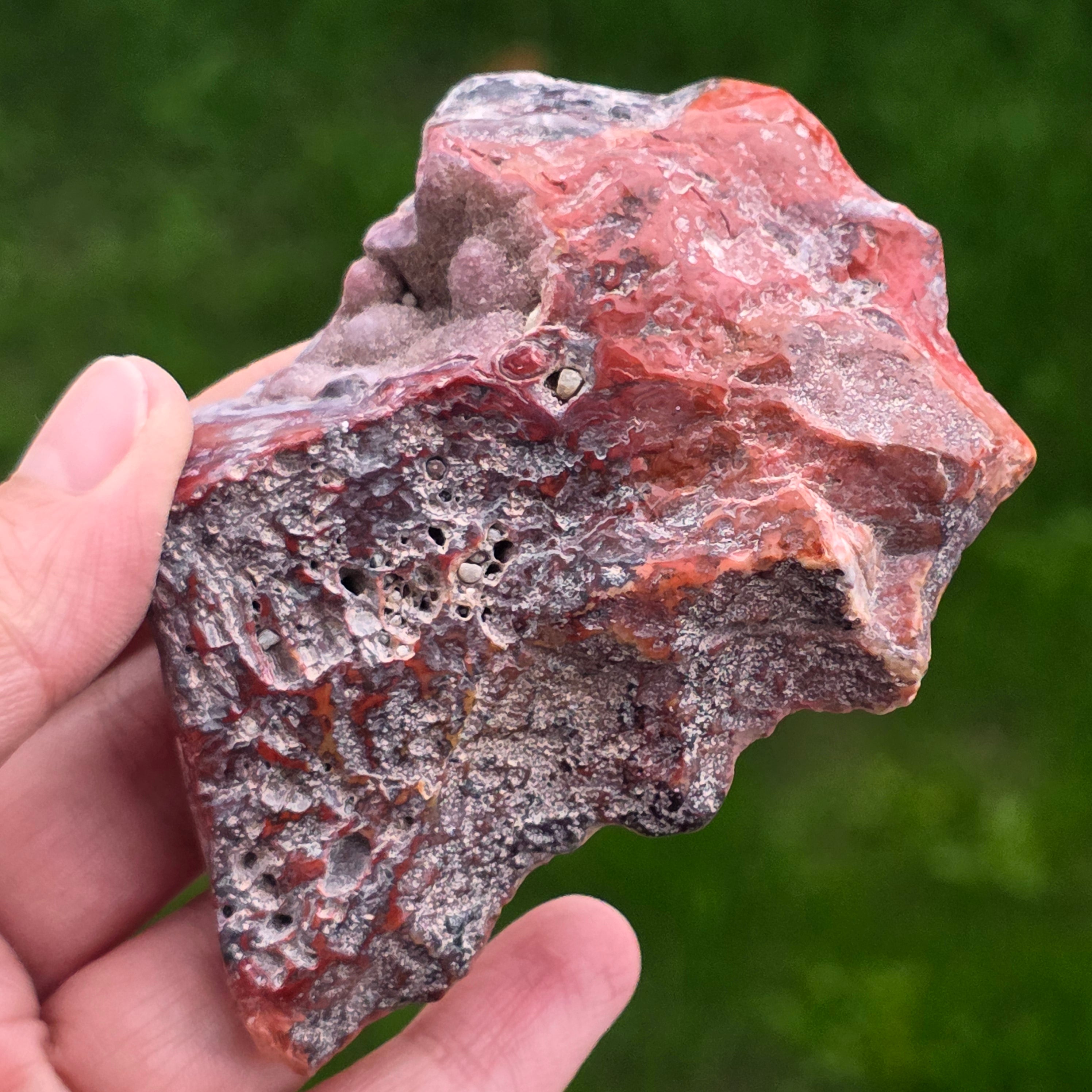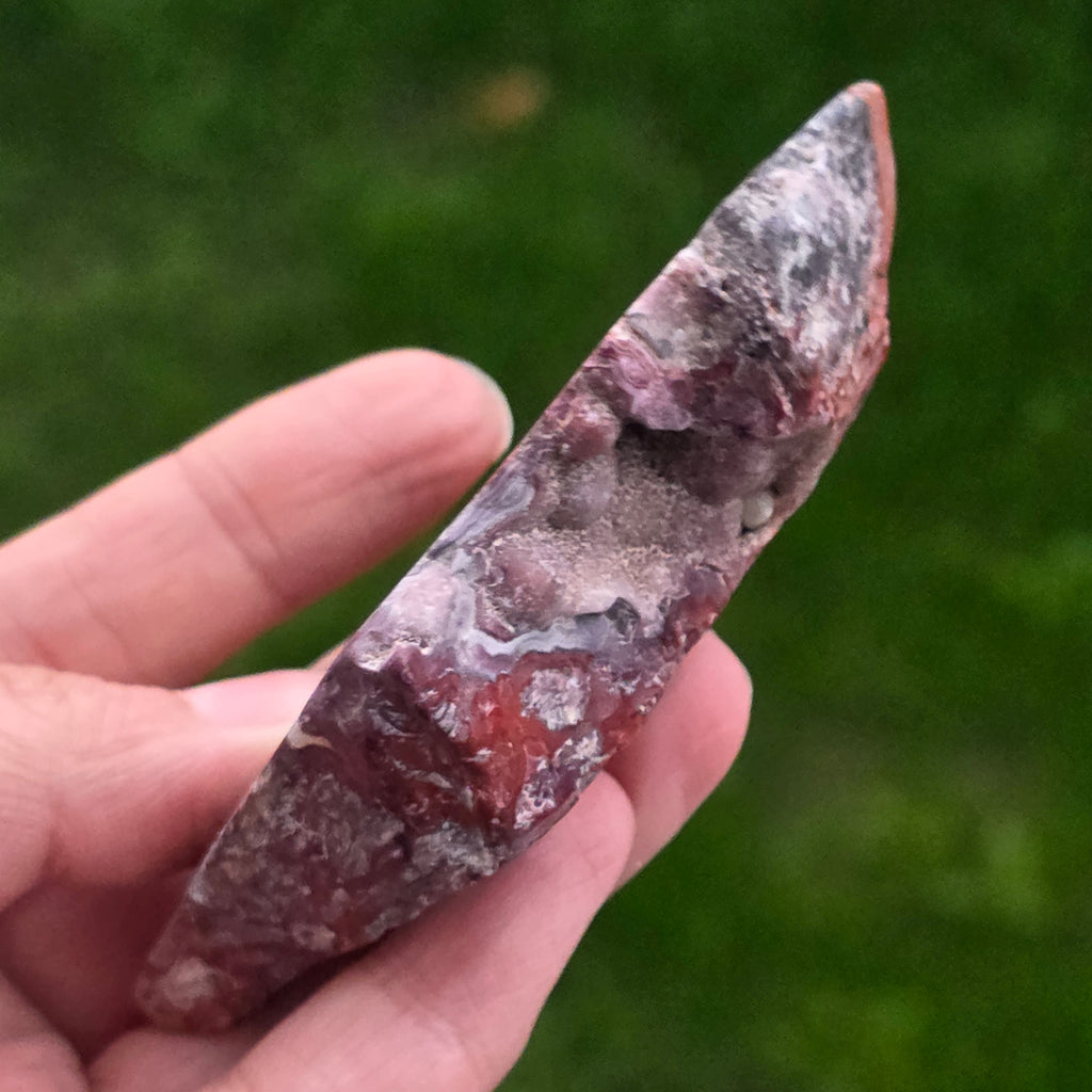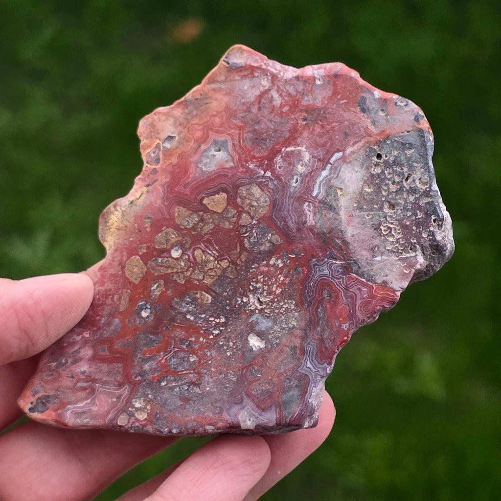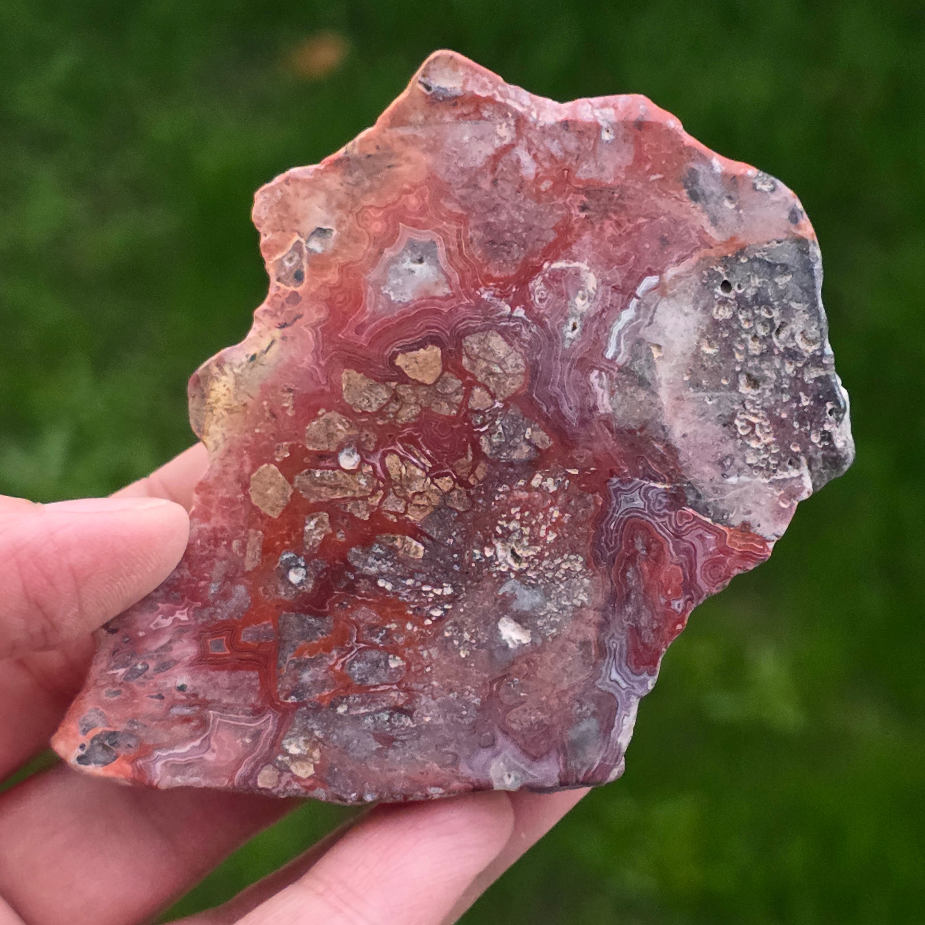 Agat Crazy z Meksyku jest jednym z najbardziej żywych i spektakularnych rodzajów agatu, znany z falistych linii i szalonych gry kolorów, które wyglądają jakby były rysowane wolną ręką, bez zasad. W tym naturalnym plasterku, małym, ale niezwykle ekspresyjnym, ujawnia się cała historia kamienia: ziemiste warstwy, ciepłe odcienie karmelu, intensywna czerwień, pomarańcz, szarość i krem, zmieszane w spiralne wzory, które wydają się pulsować życiem.