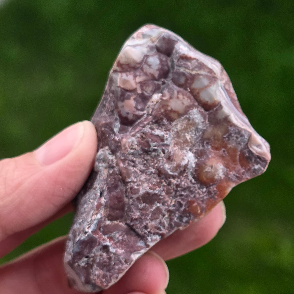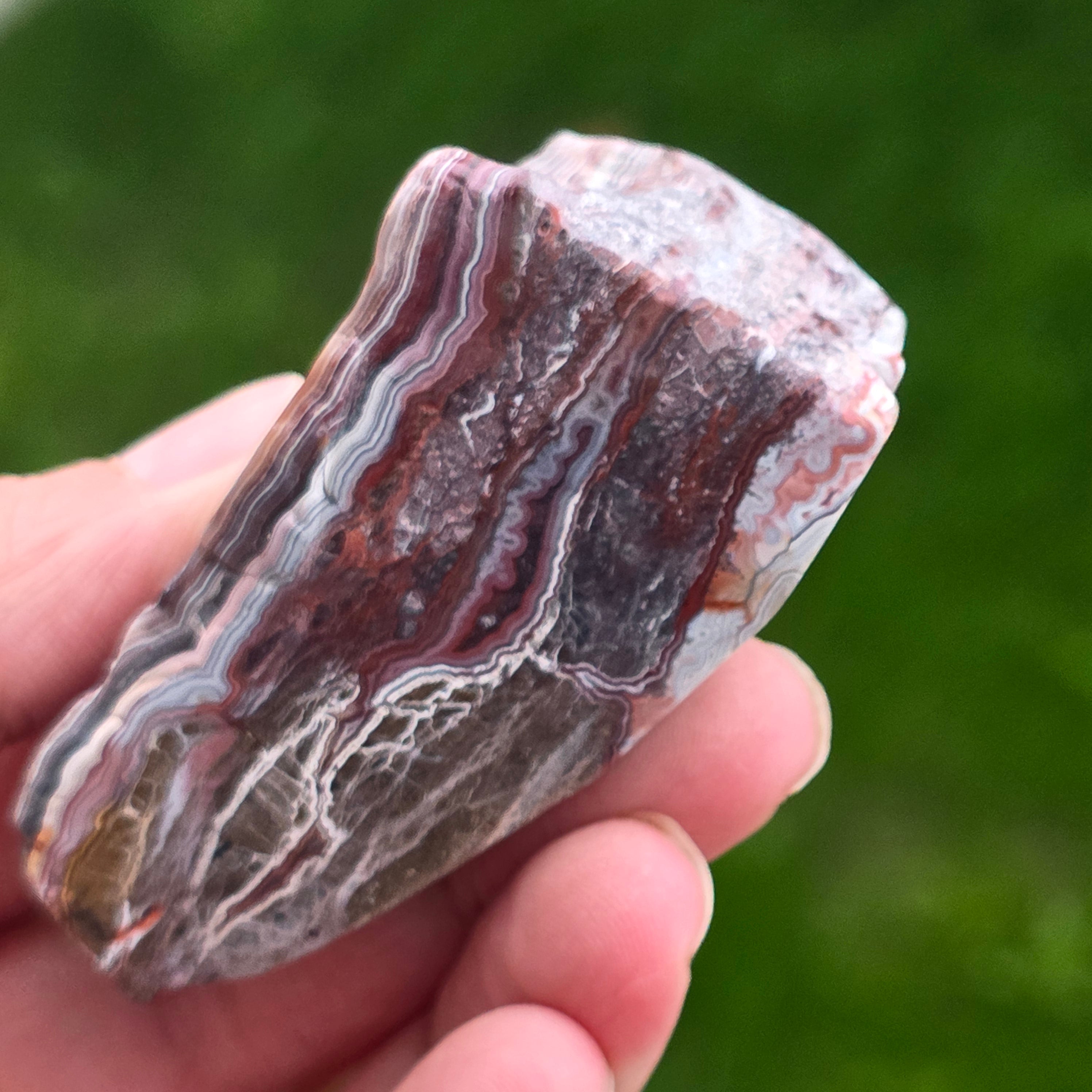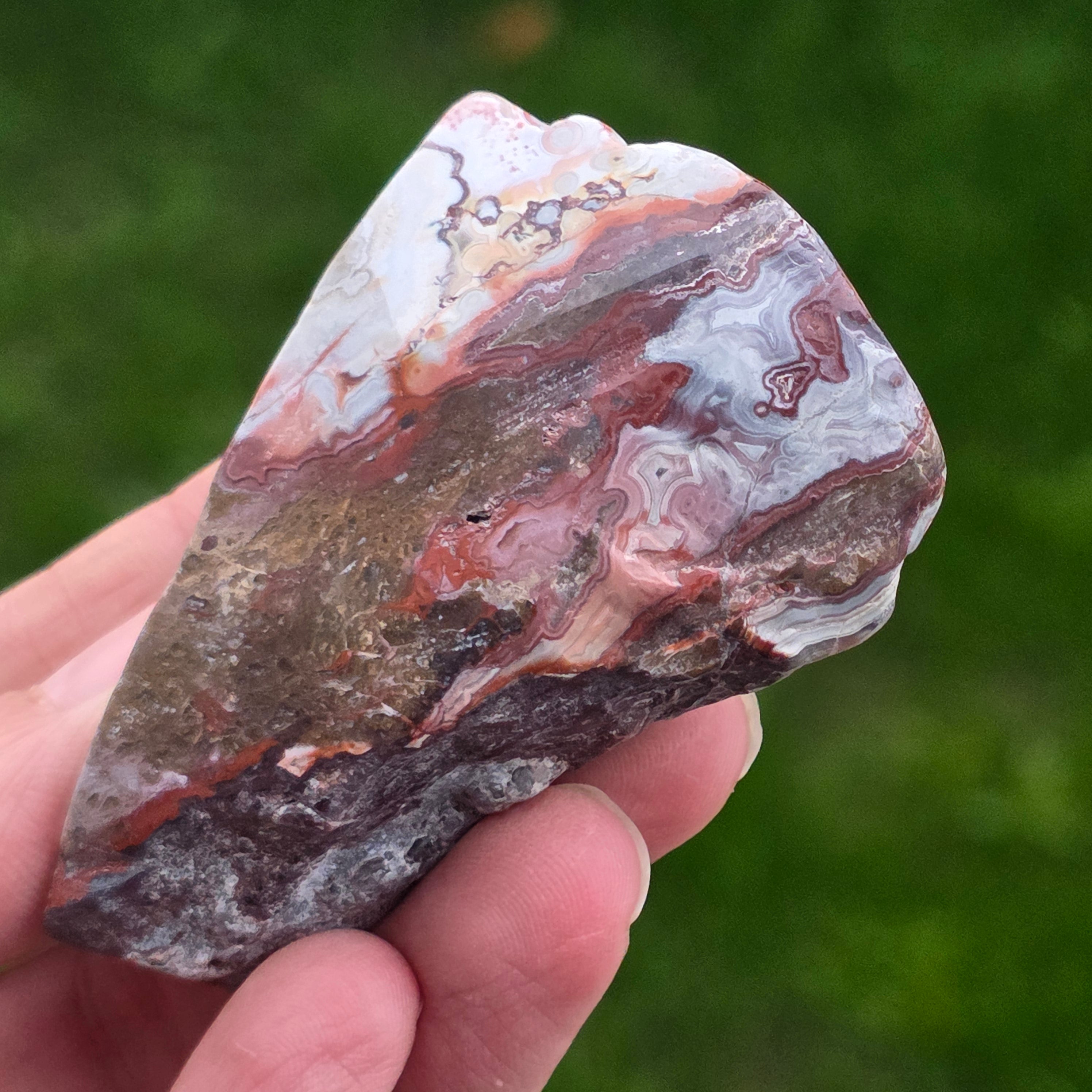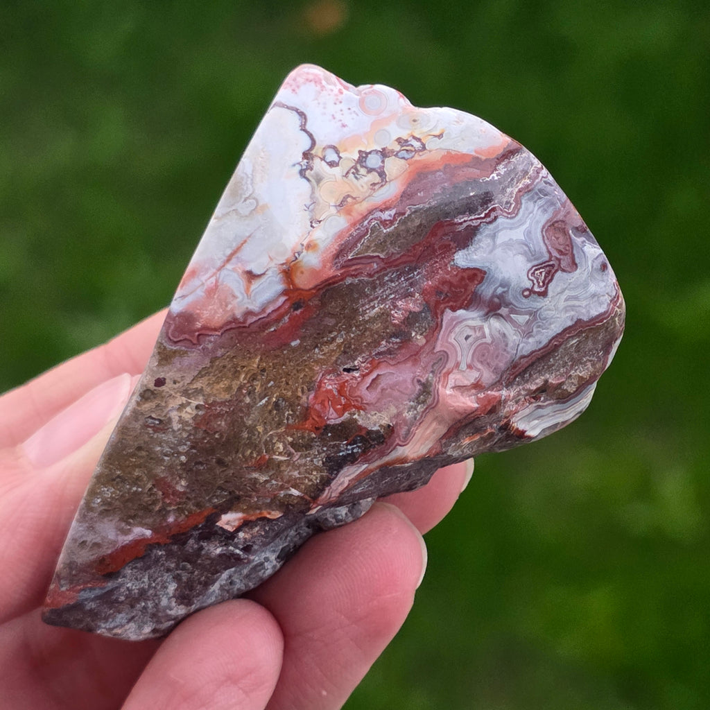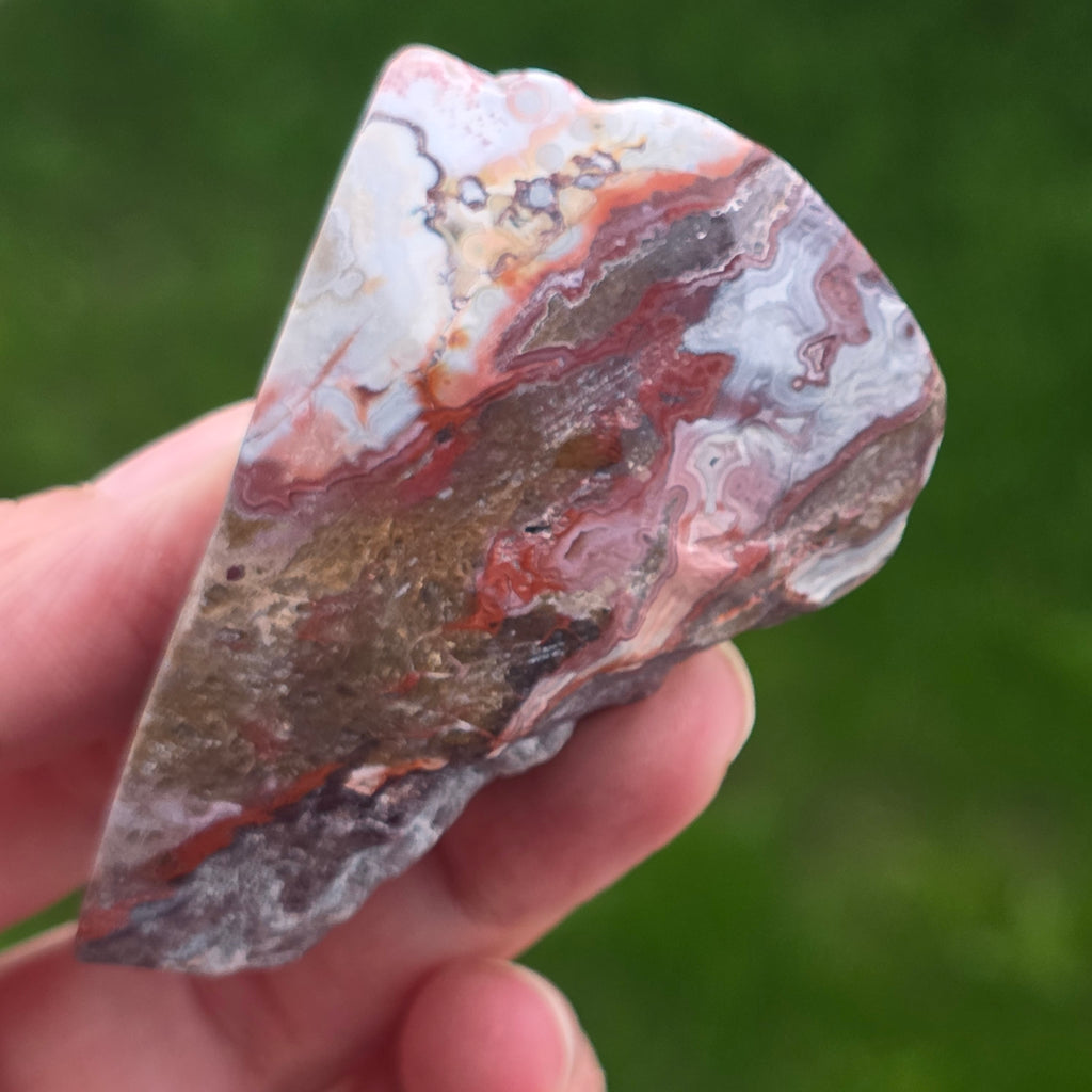 Agat Crazy z Meksyku jest jednym z najbardziej żywych i spektakularnych rodzajów agatu, znany z falistych linii i szalonych gry kolorów, które wyglądają jakby były rysowane wolną ręką, bez zasad. W tym naturalnym plasterku, małym, ale niezwykle ekspresyjnym, ujawnia się cała historia kamienia: ziemiste warstwy, ciepłe odcienie karmelu, intensywna czerwień, pomarańcz, szarość i krem, zmieszane w spiralne wzory, które wydają się pulsować życiem.