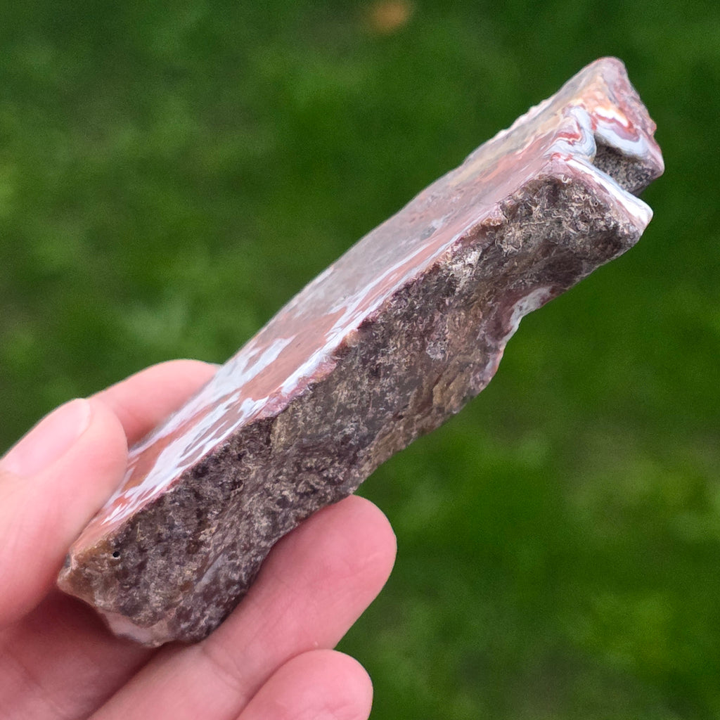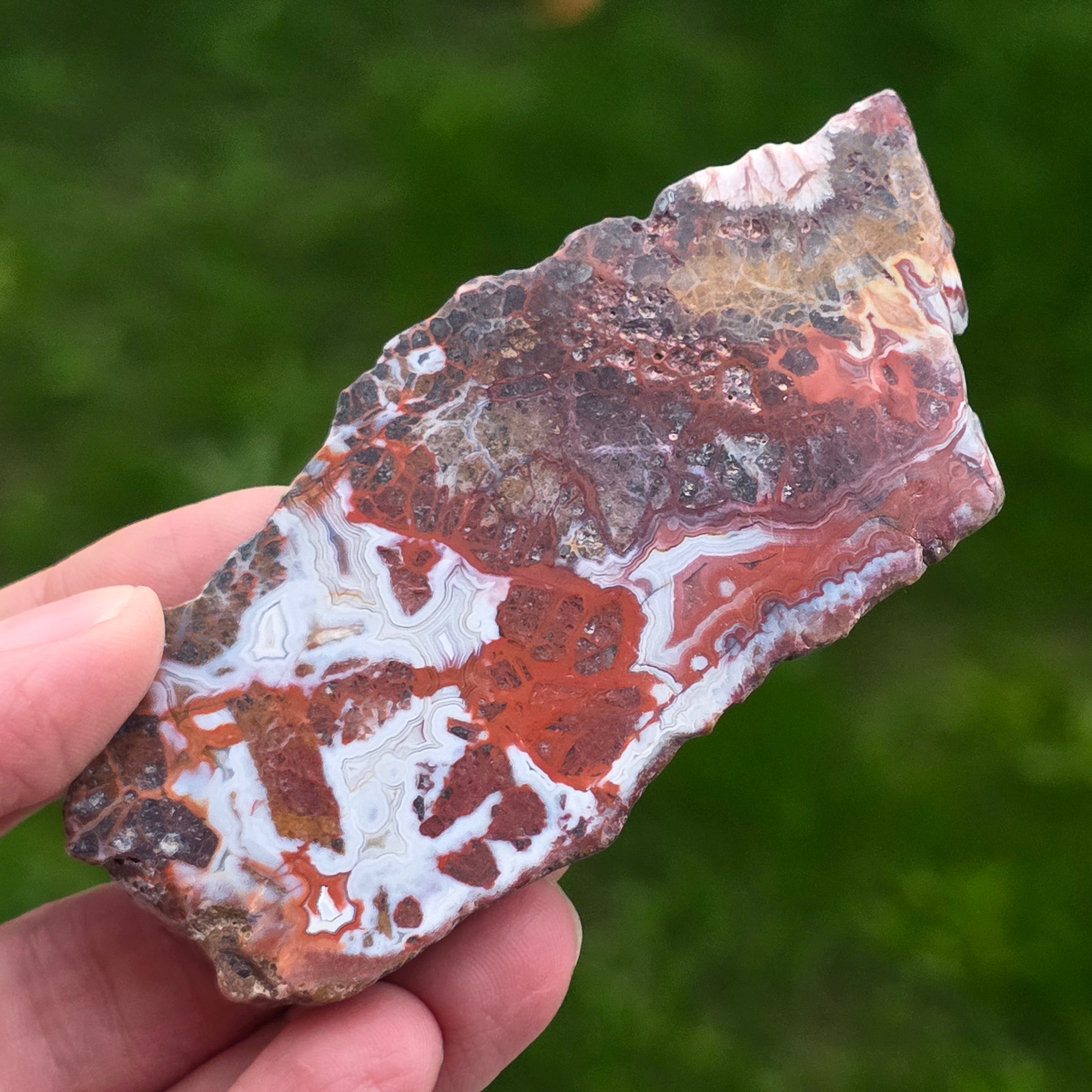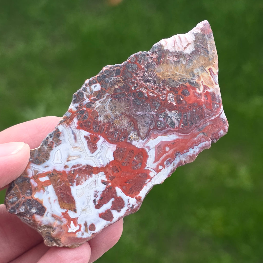 Agat Crazy z Meksyku jest jednym z najbardziej żywych i spektakularnych rodzajów agatu, znany z falistych linii i szalonych gry kolorów, które wyglądają jakby były rysowane wolną ręką, bez zasad. W tym naturalnym plasterku, małym, ale niezwykle ekspresyjnym, ujawnia się cała historia kamienia: ziemiste warstwy, ciepłe odcienie karmelu, intensywna czerwień, pomarańcz, szarość i krem, zmieszane w spiralne wzory, które wydają się pulsować życiem.