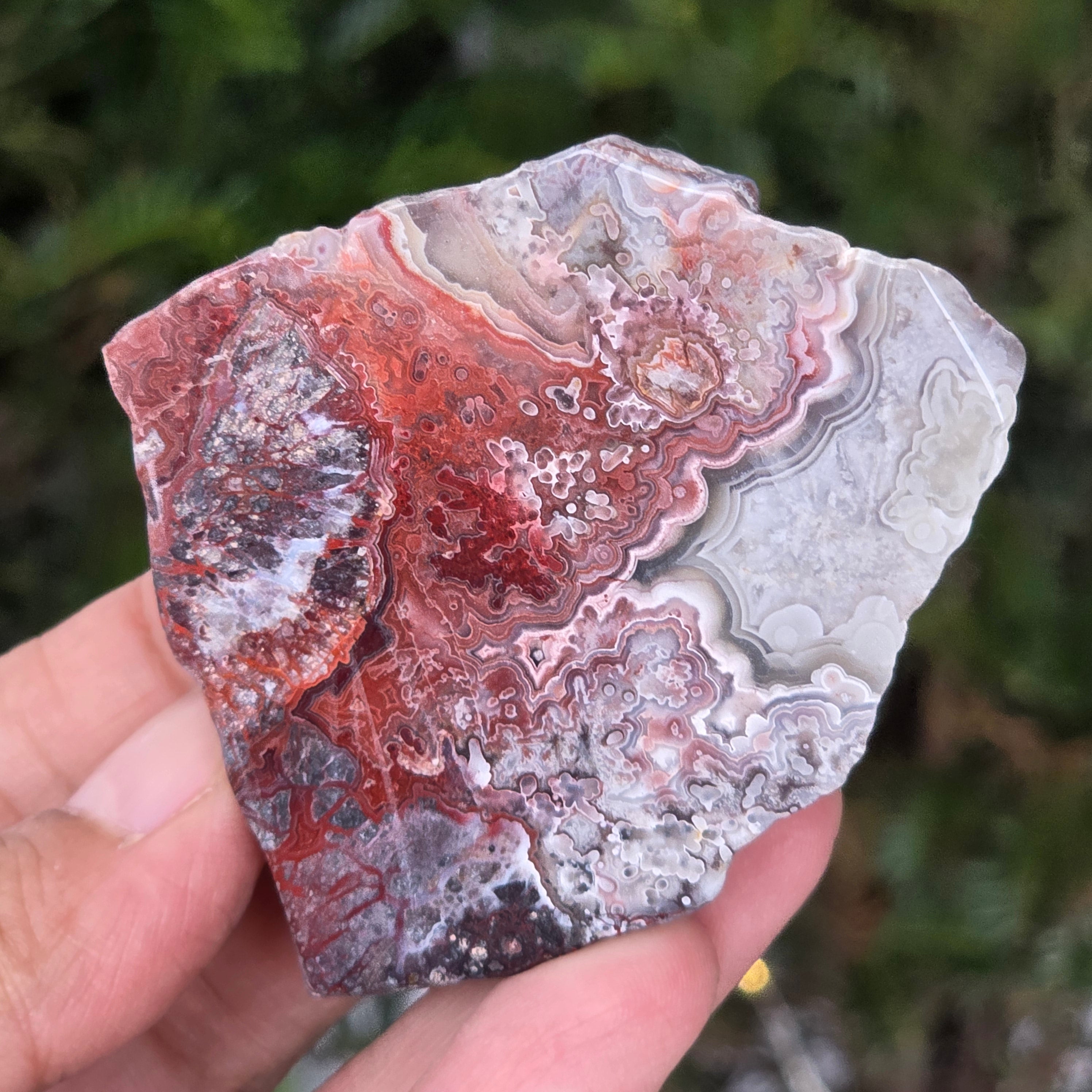Agat Crazy z Meksyku jest jedną z najbardziej żywych i spektakularnych odmian agatu, słynącą ze swoich falistych linii i szalonych gier kolorów, które wydają się być rysowane wolną ręką, bez zasad. W tym naturalnym kawałku, małym, ale niezwykle ekspresyjnym, ujawnia się cała opowieść kamienia: ziemiste warstwy, ciepłe odcienie karmelu, intensywna czerwień, pomarańcz, szarość i krem, wymieszane w spiralne wzory, które wydają się pulsować życiem.