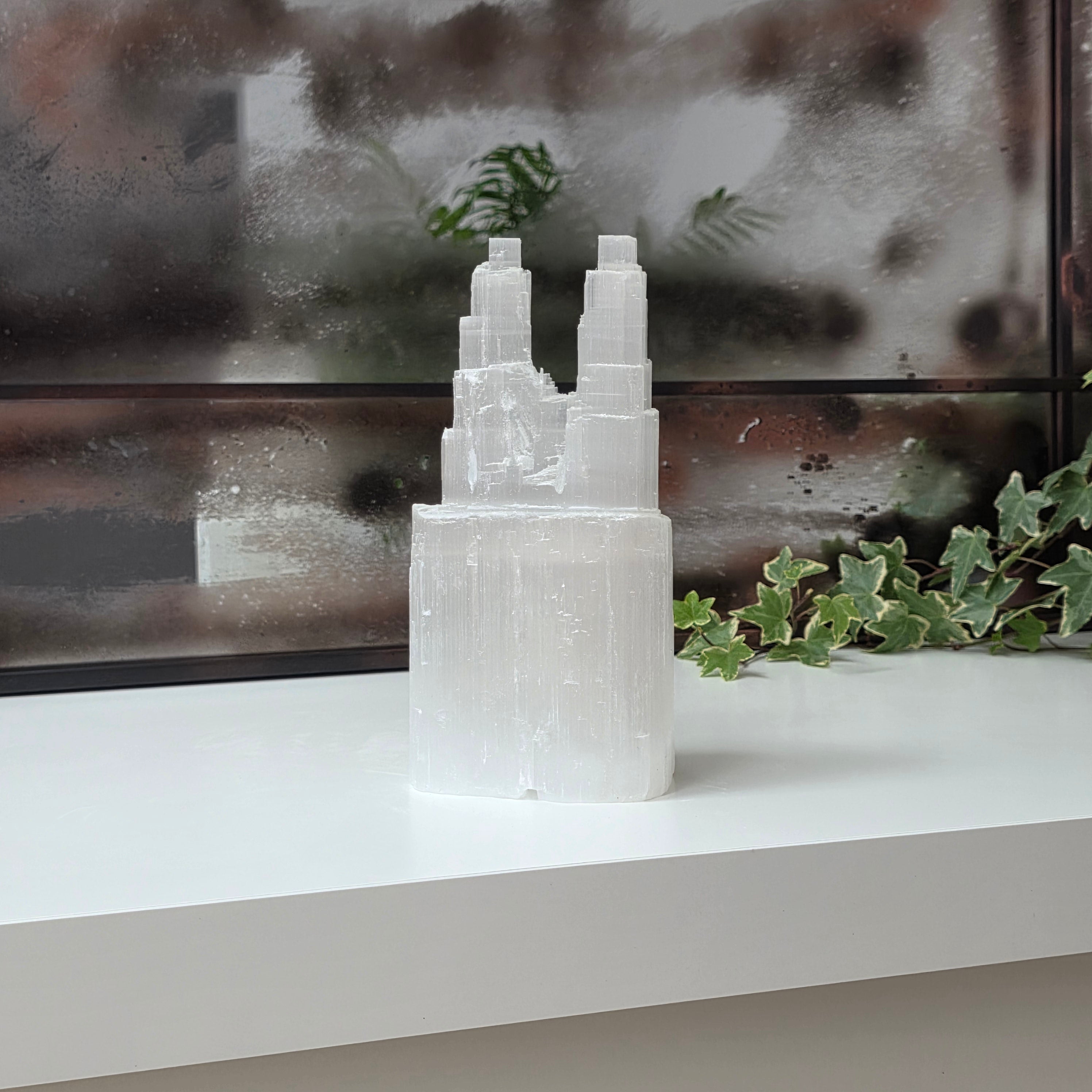 Ten świecznik w kształcie wieży, wykonany z naturalnego selenitu, wnosi odrobinę magii i światła do każdej przestrzeni. Selenit uważany jest za kamień czystości i wewnętrznego spokoju.
