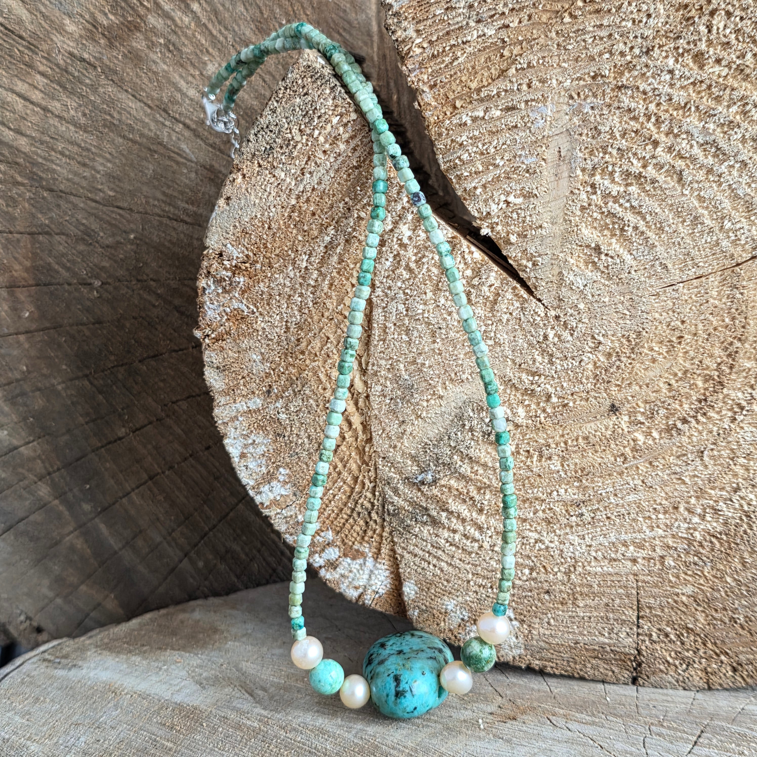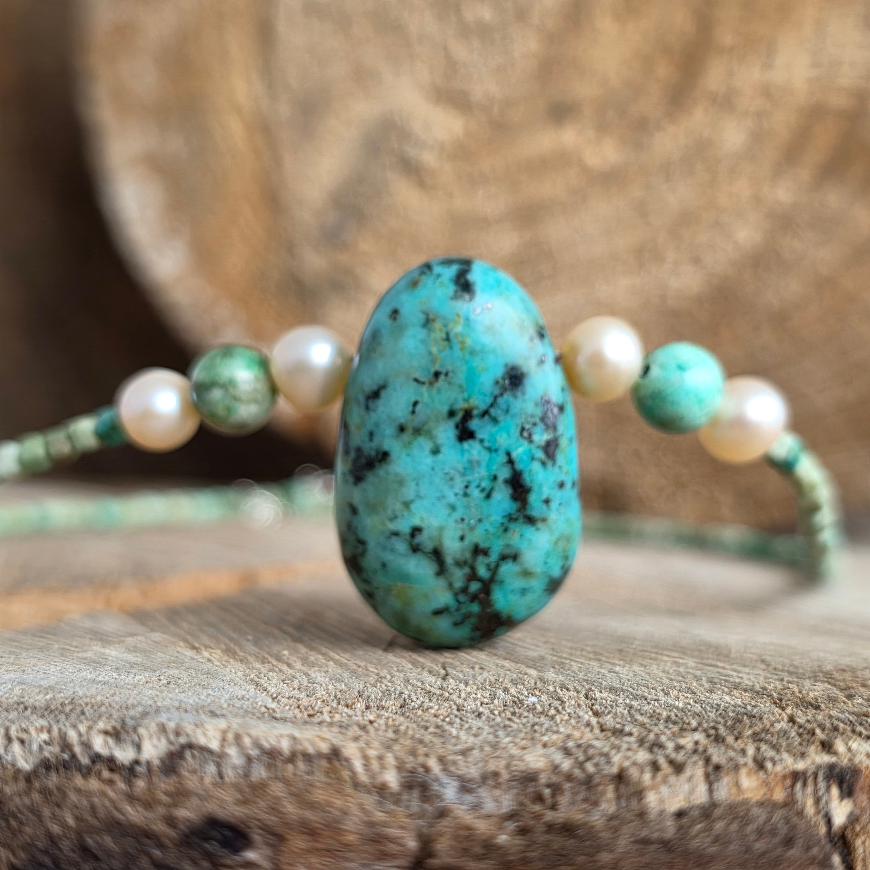 W centrum kompozycji świeci turkus UPUSZCZAĆ 3 cm - Jak święta łza Ziemi, nośniki uzdrawiania i ochrony. Po obu stronach akcenty o naturalnych perłach 8 mm rozkładają perłowe światło, dodając łaskę, wyrafinowanie i równowagę całego stworzenia.