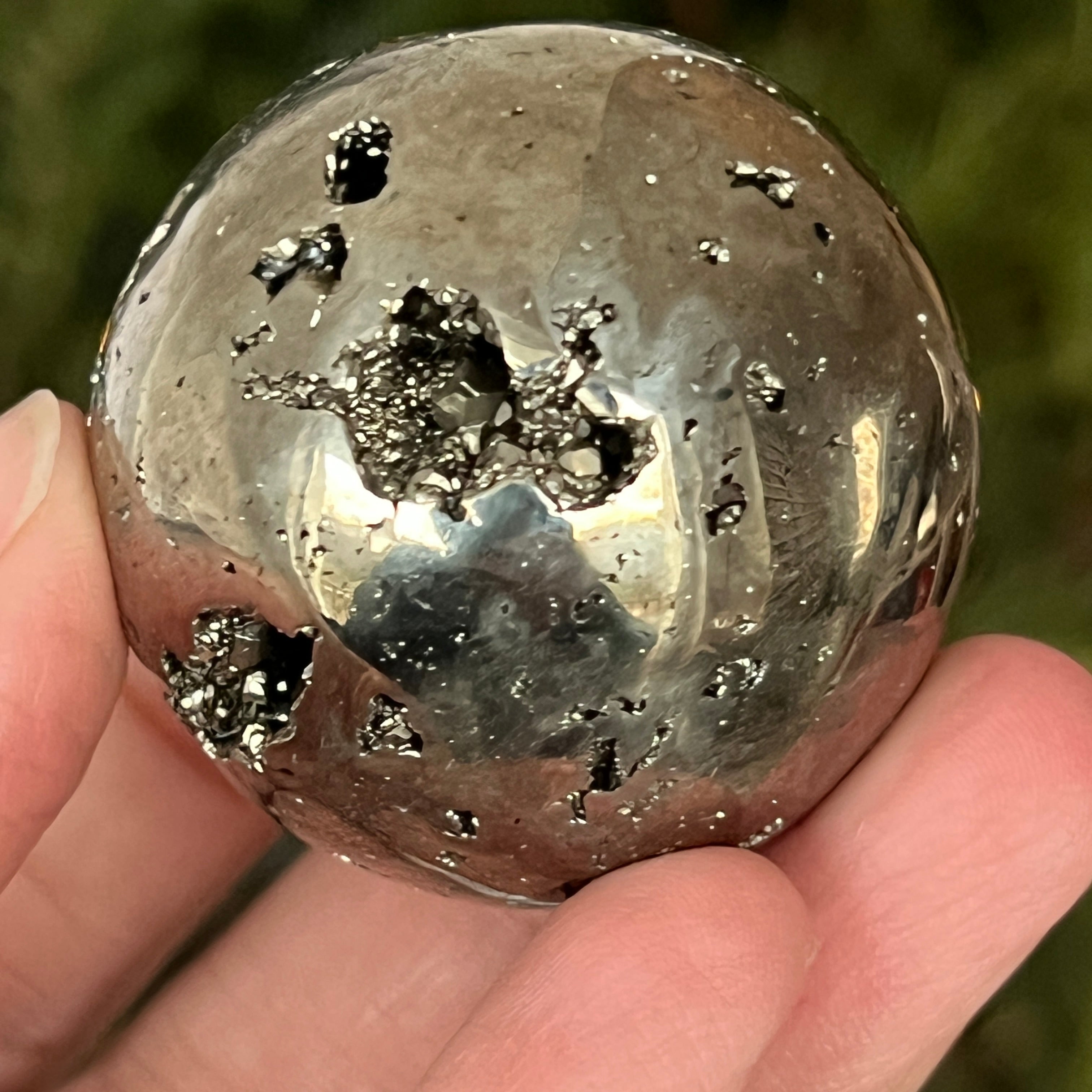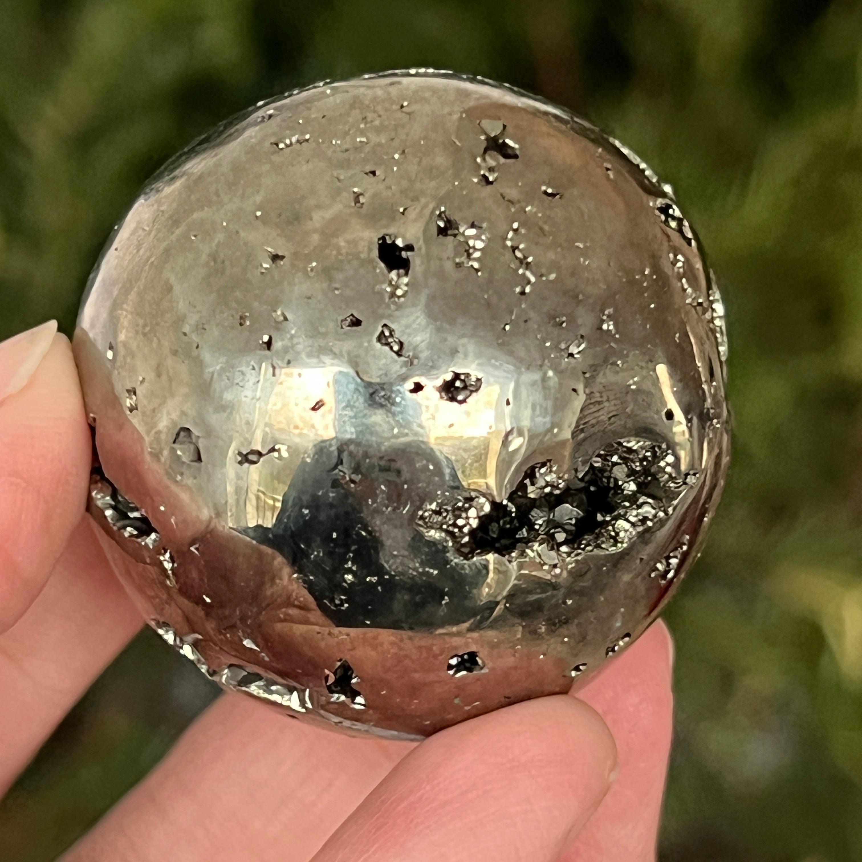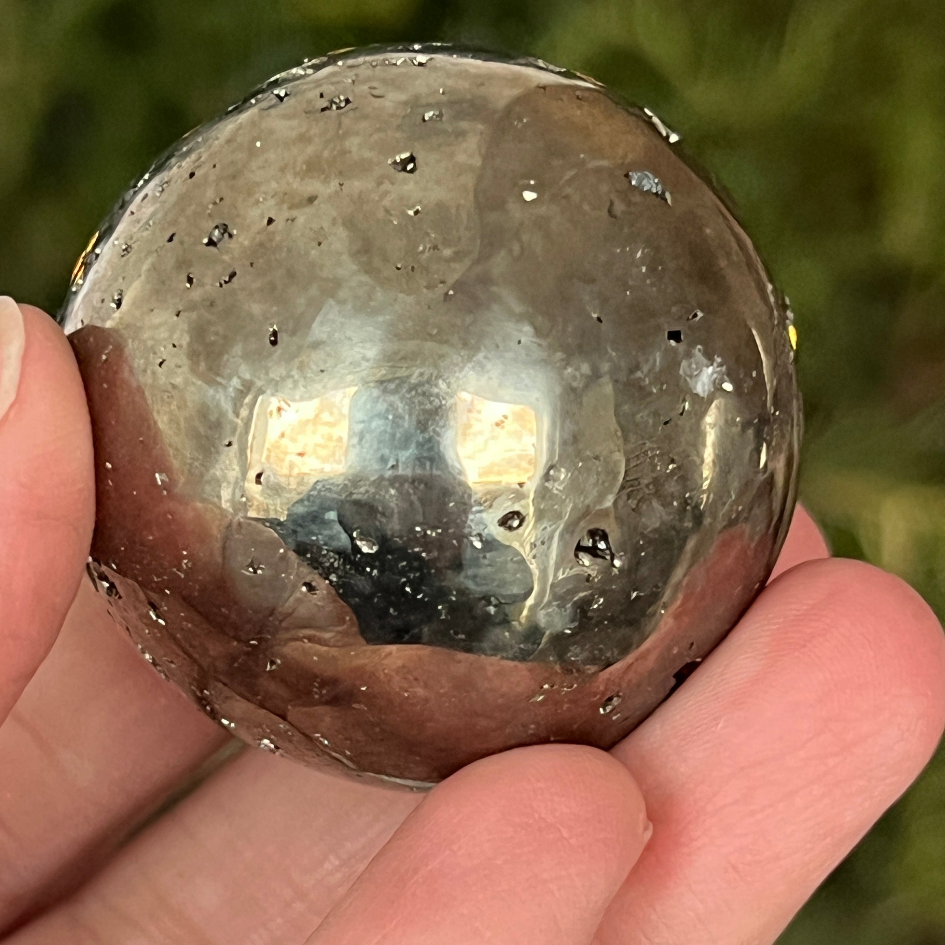 Peruwiańska pirytowa kula emanuje mocą, obfitością i klarownością umysłu. Każdy złoty refleks przypomina o świetle świadomości i wewnętrznej sile, która przekształca intencje w rzeczywistość. Spektakularny egzemplarz, odpowiedni zarówno dla kolekcjonerów, jak i jako dekoracyjny przedmiot z wibrującą energią.