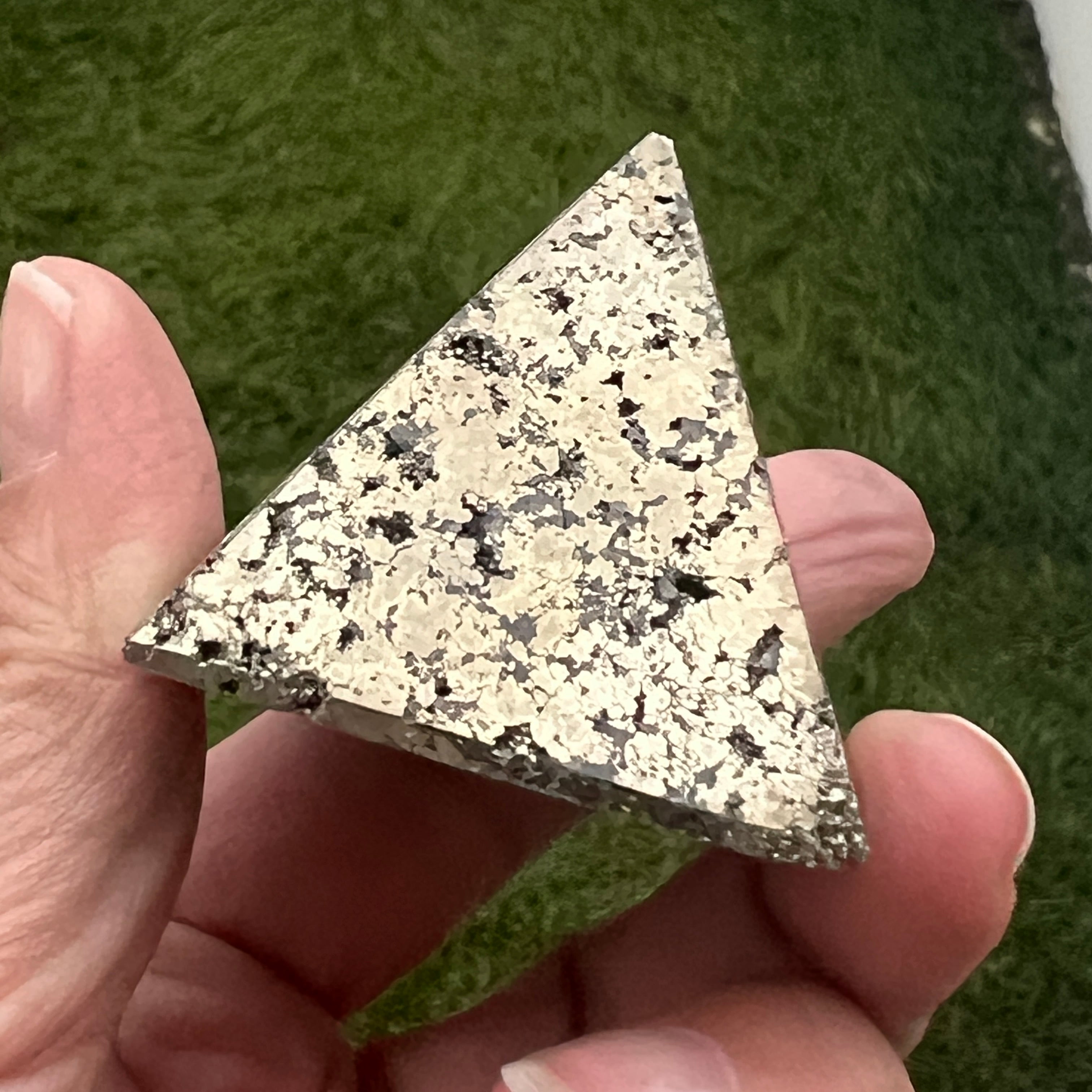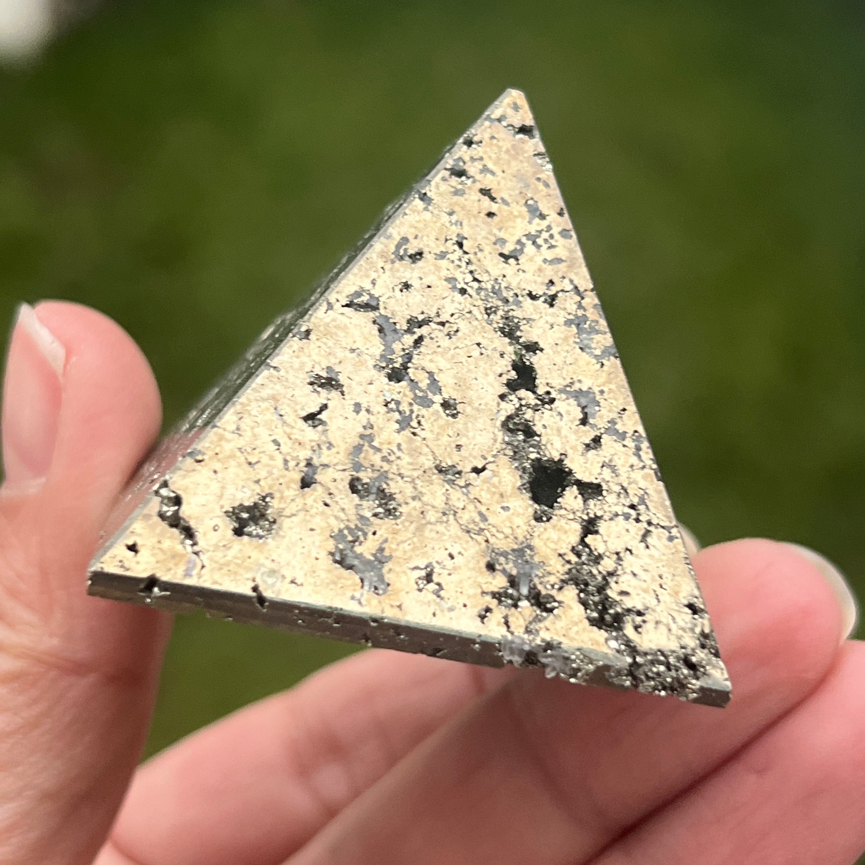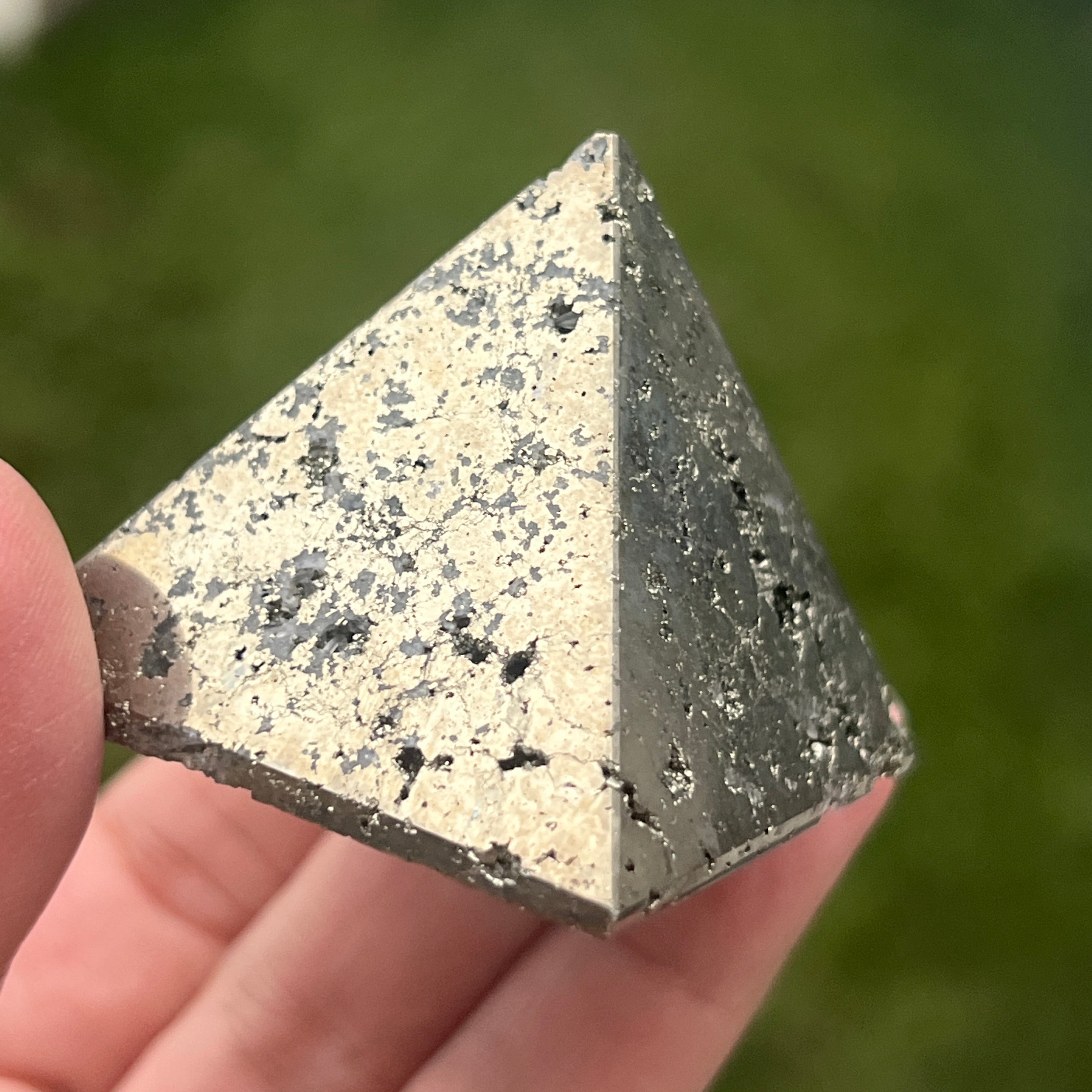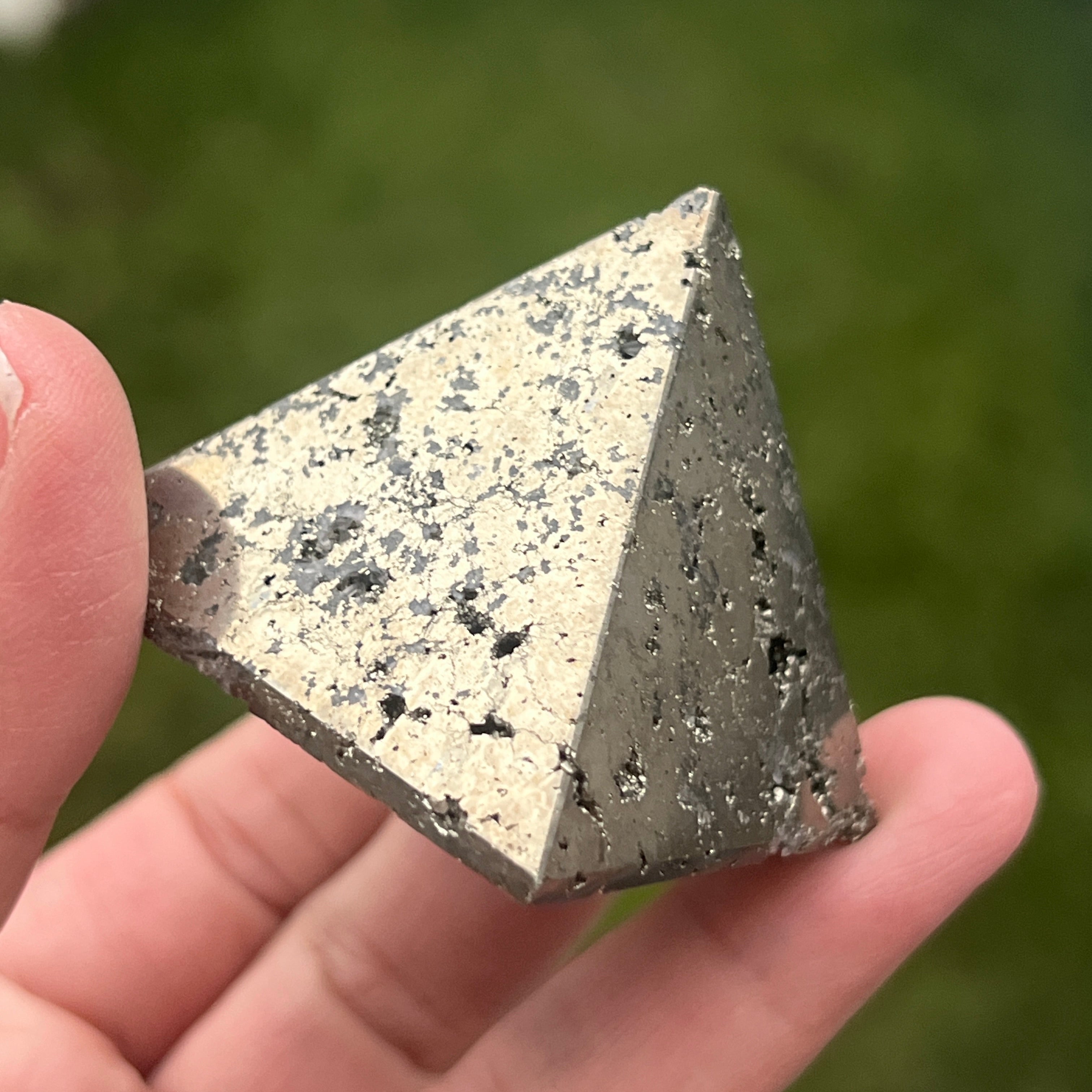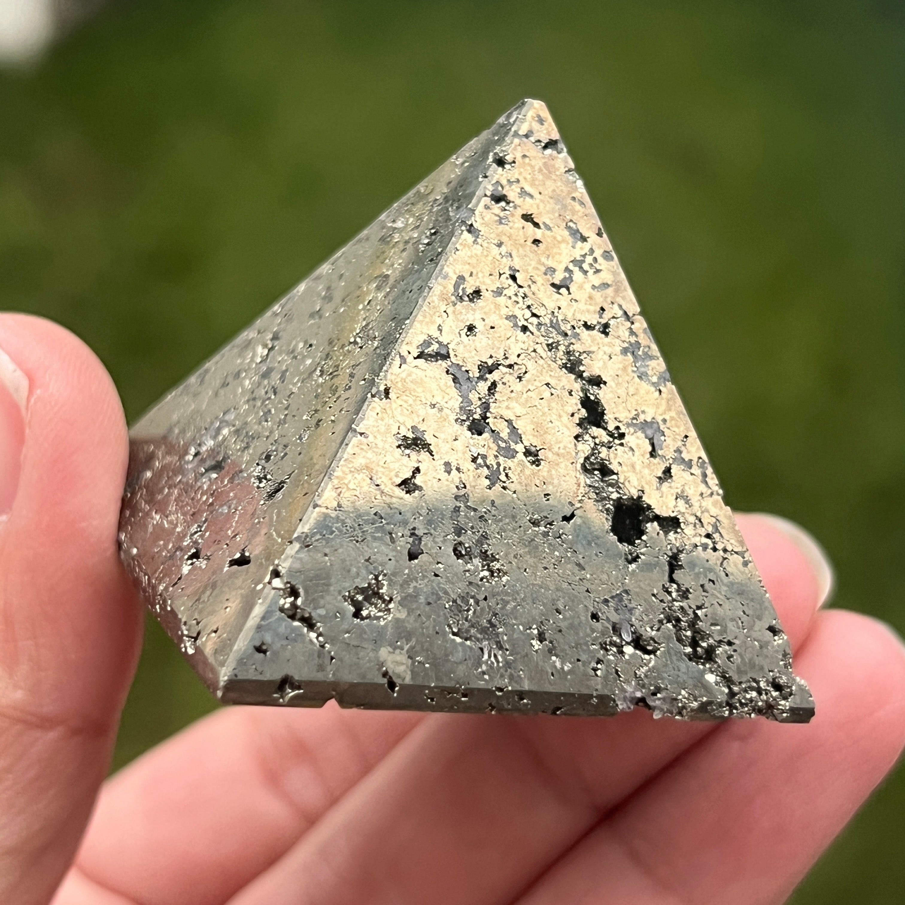 Piramida Peruwiański piryt emanuje siłą, obfitością i jasnością umysłu. Każde złote odbicie przywołuje światło świadomości i wewnętrzną siłę, która przekształca intencje w rzeczywistość. Spektakularny przedmiot, odpowiedni zarówno dla kolekcjonerów, jak i jako przedmiot dekoracyjny o żywej energii.