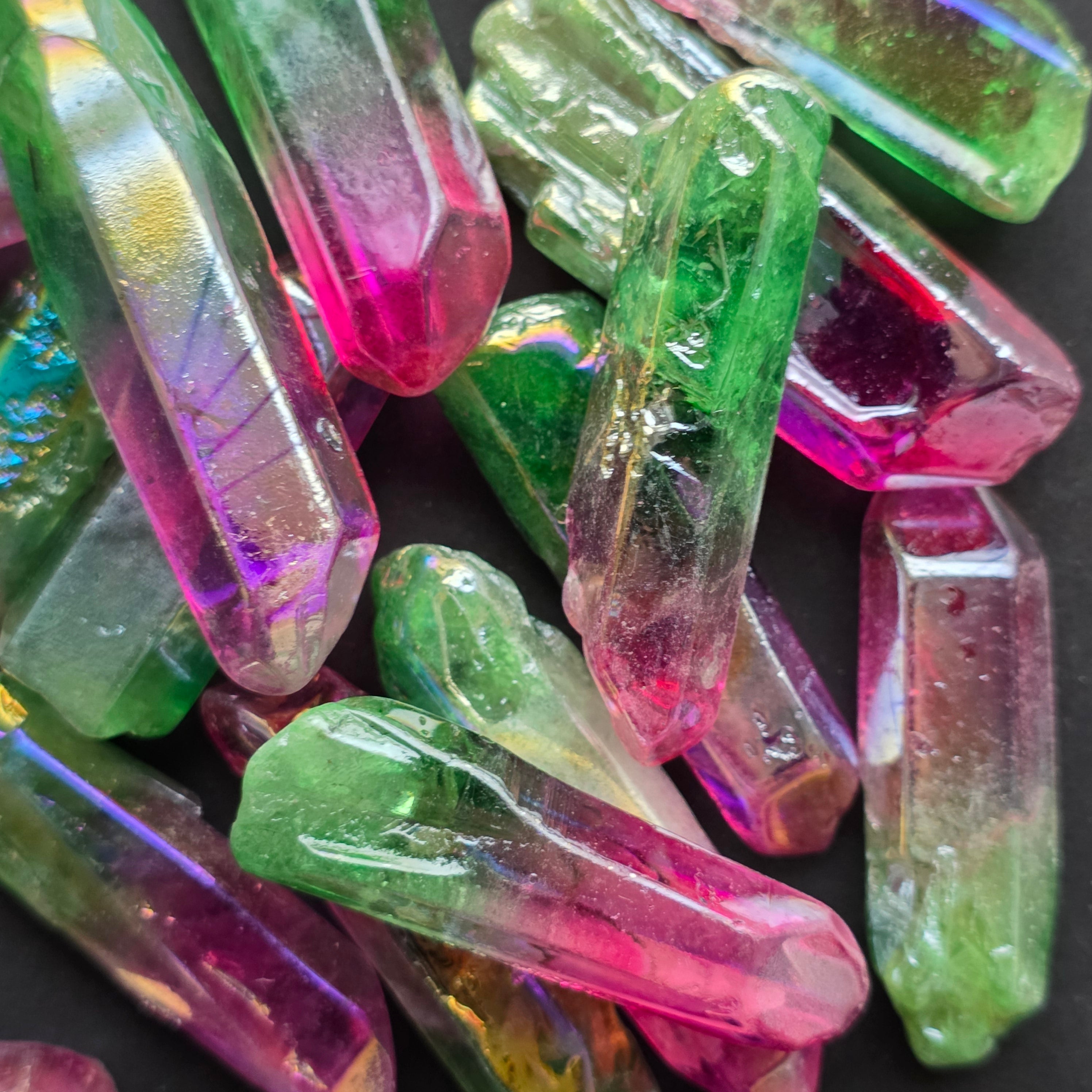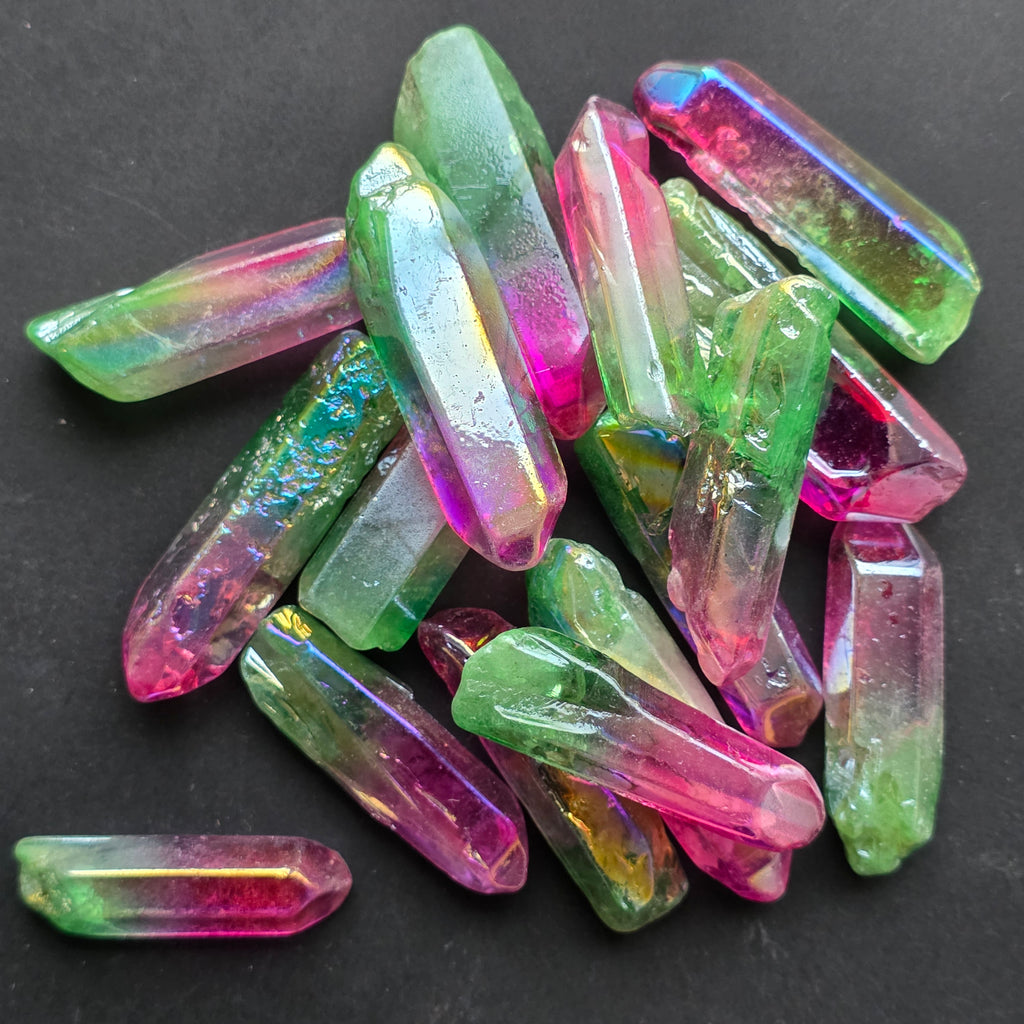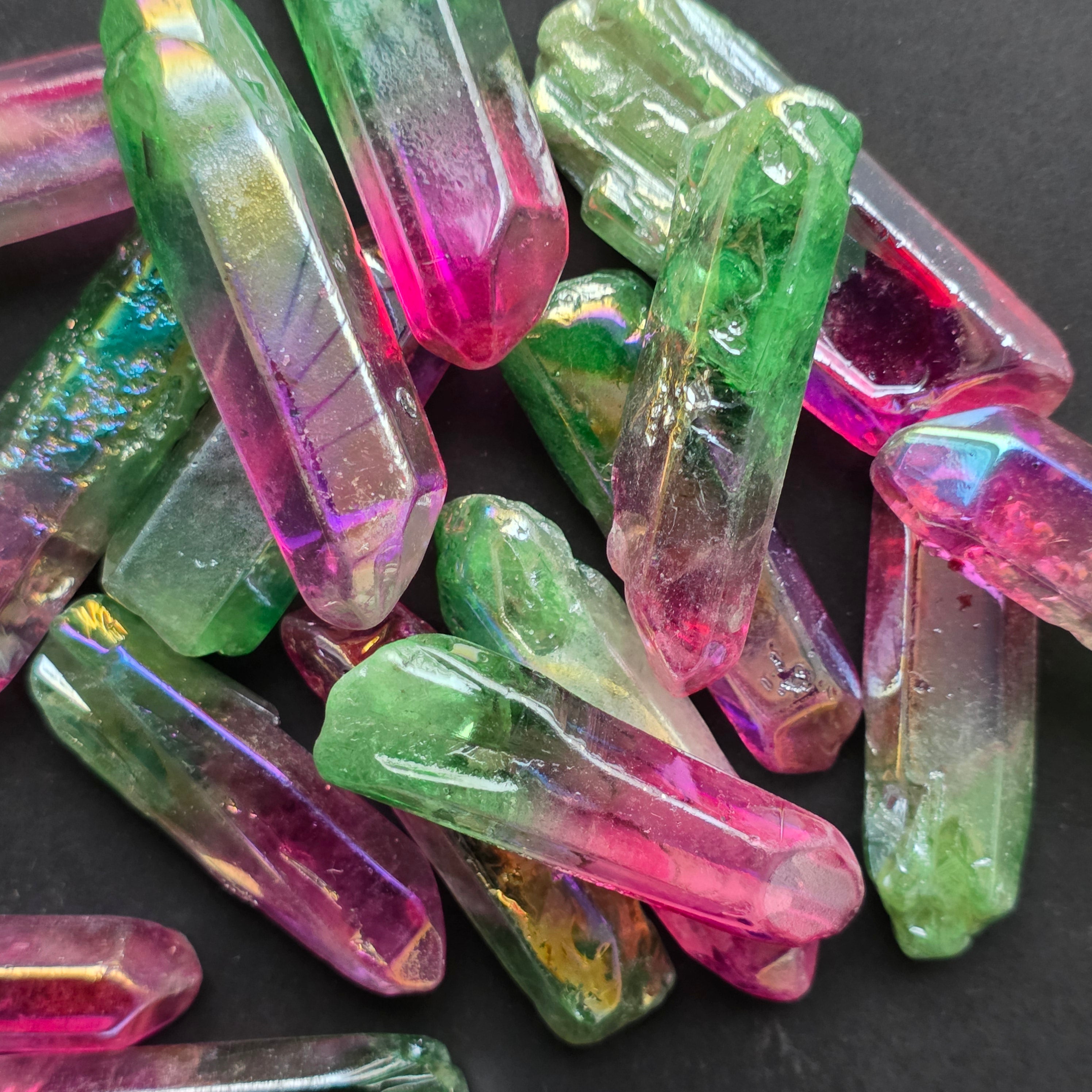 Acest cuarț este colorat, prin procesul cunoscuta ca si aura coating pentru a intensifica reflexele irizate și energia vibrantă a cristalului.