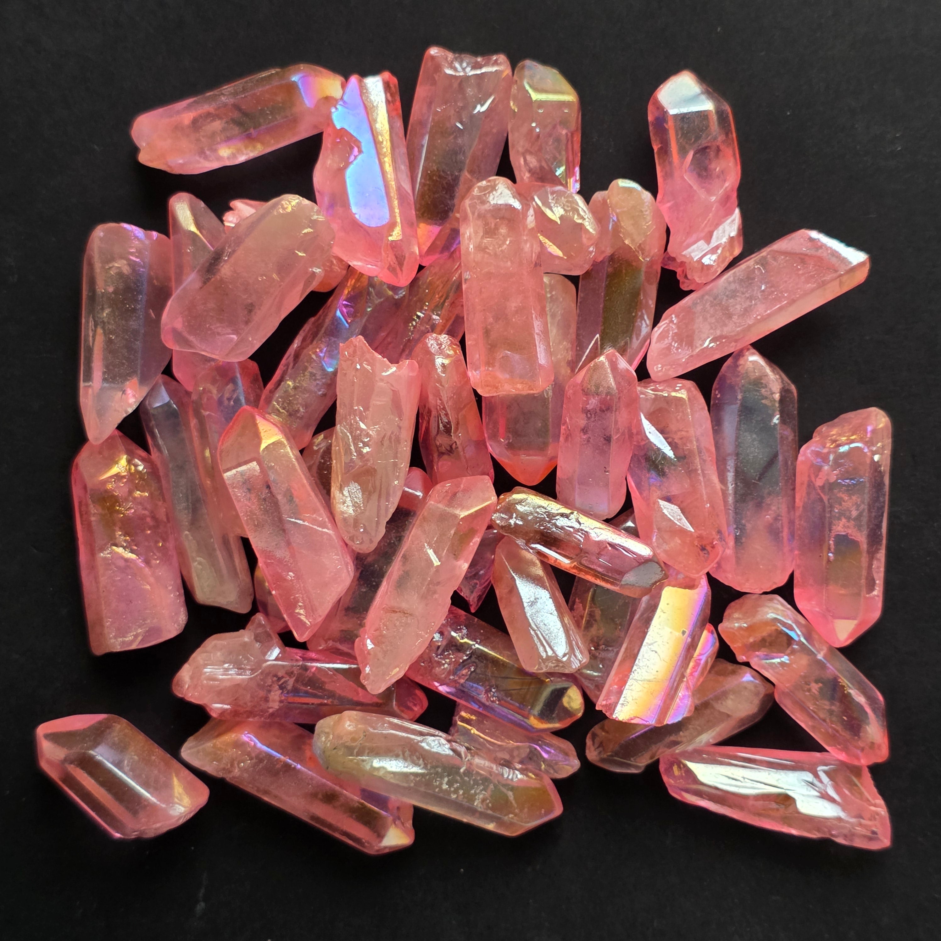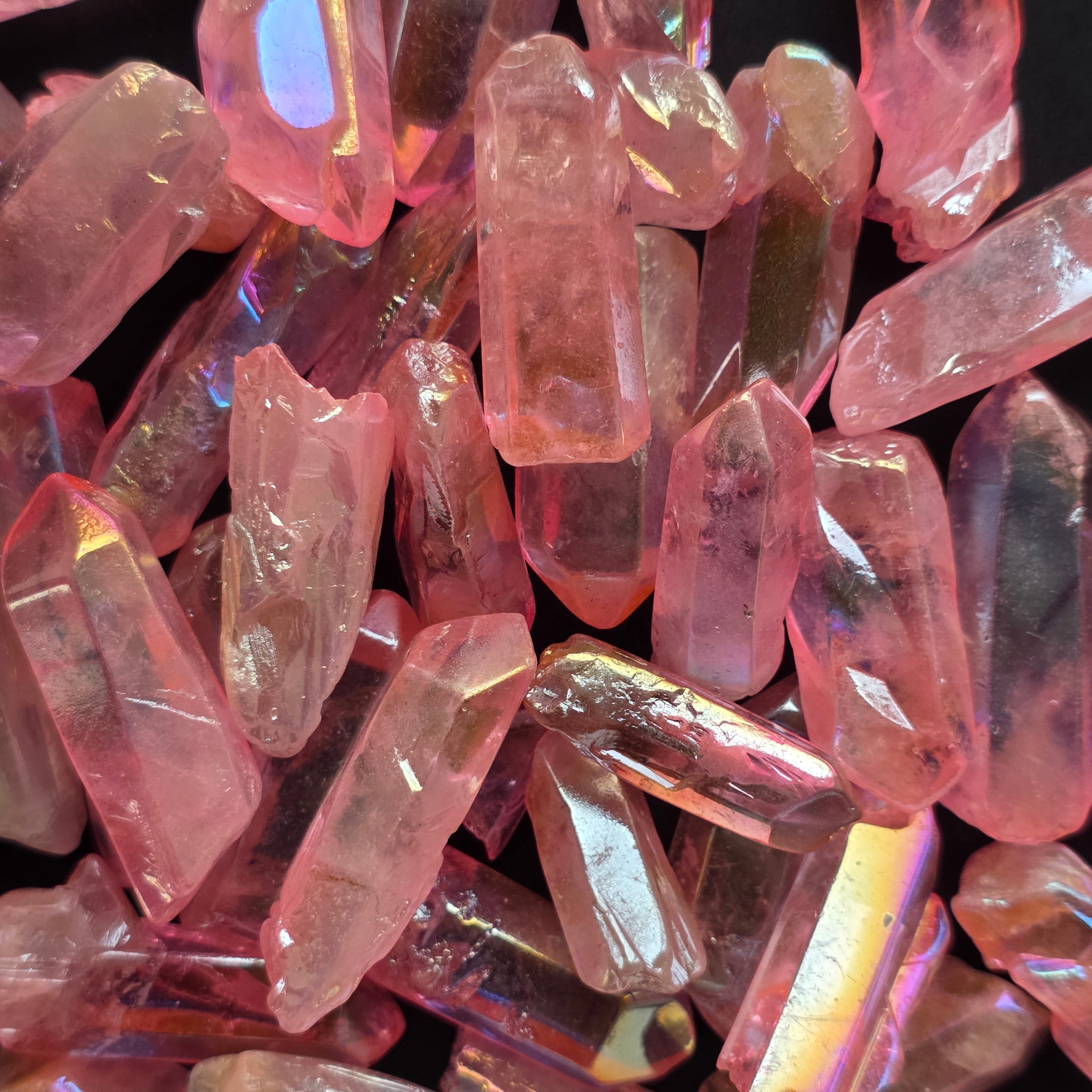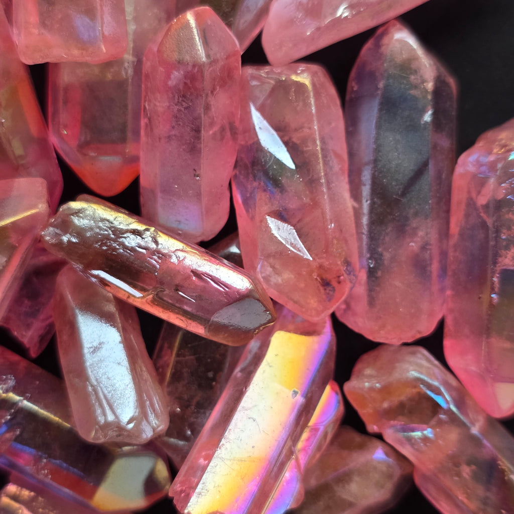 Acest cuarț este colorat, prin procesul cunoscuta ca si aura coating pentru a intensifica reflexele irizate și energia vibrantă a cristalului.