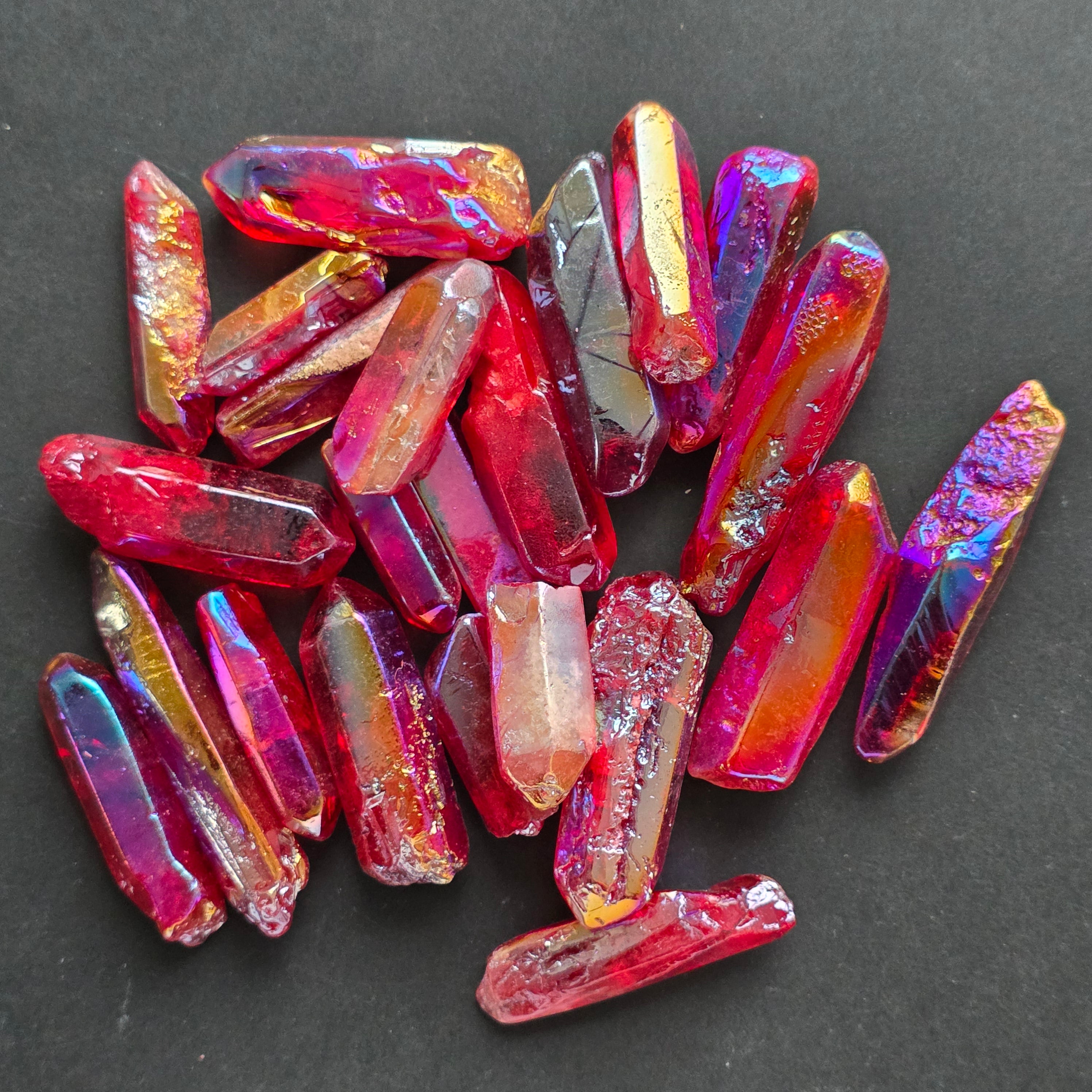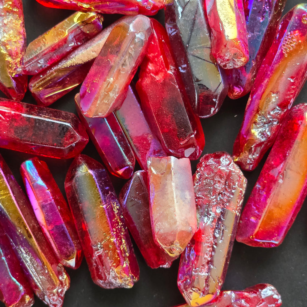 Acest cuarț este colorat, prin procesul cunoscuta ca si aura coating pentru a intensifica reflexele irizate și energia vibrantă a cristalului.