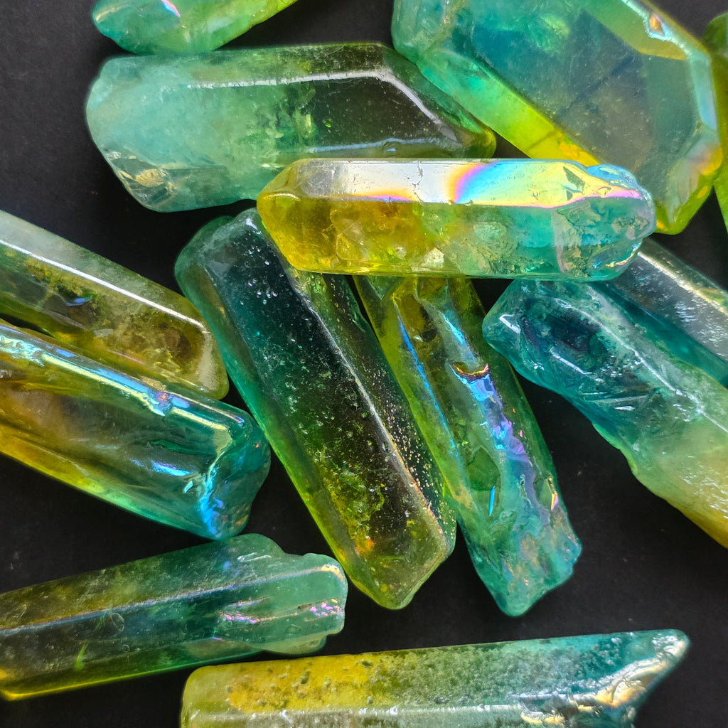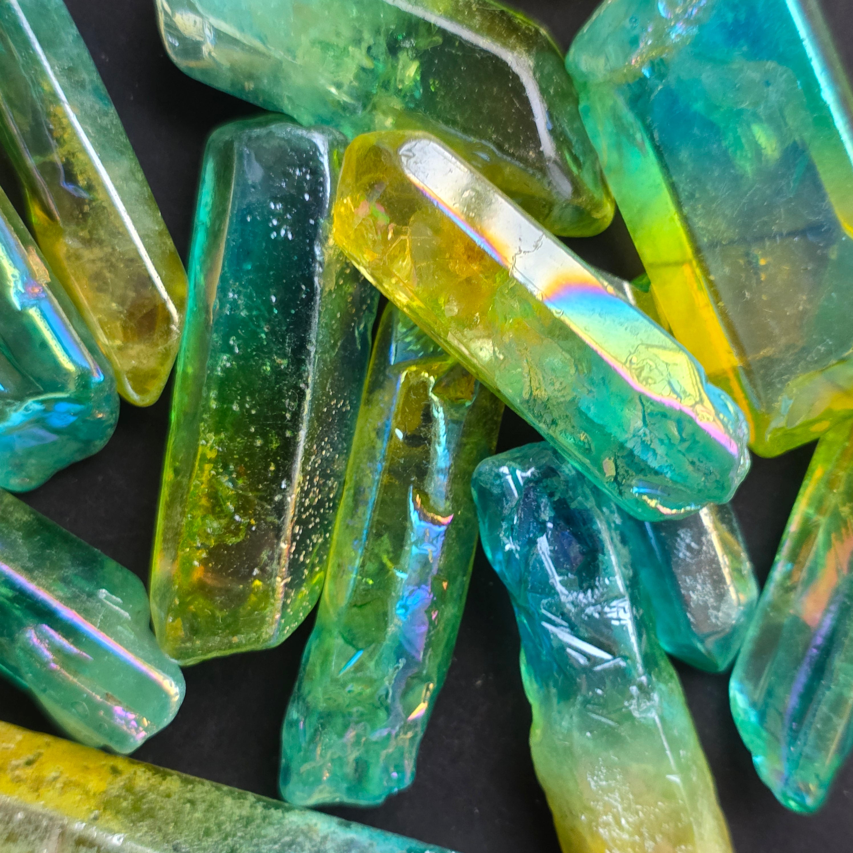 Acest cuarț este colorat, prin procesul cunoscuta ca si aura coating pentru a intensifica reflexele irizate și energia vibrantă a cristalului.