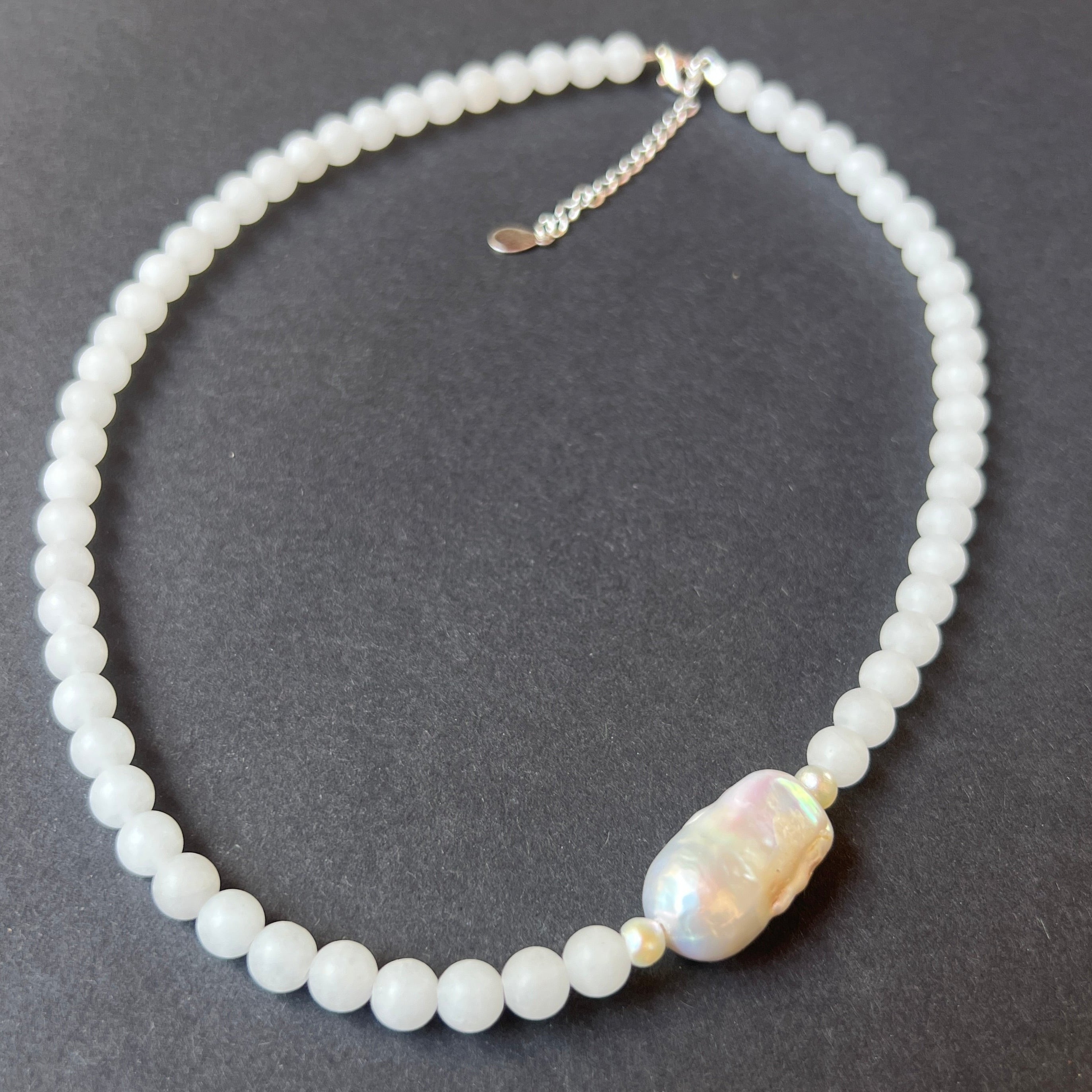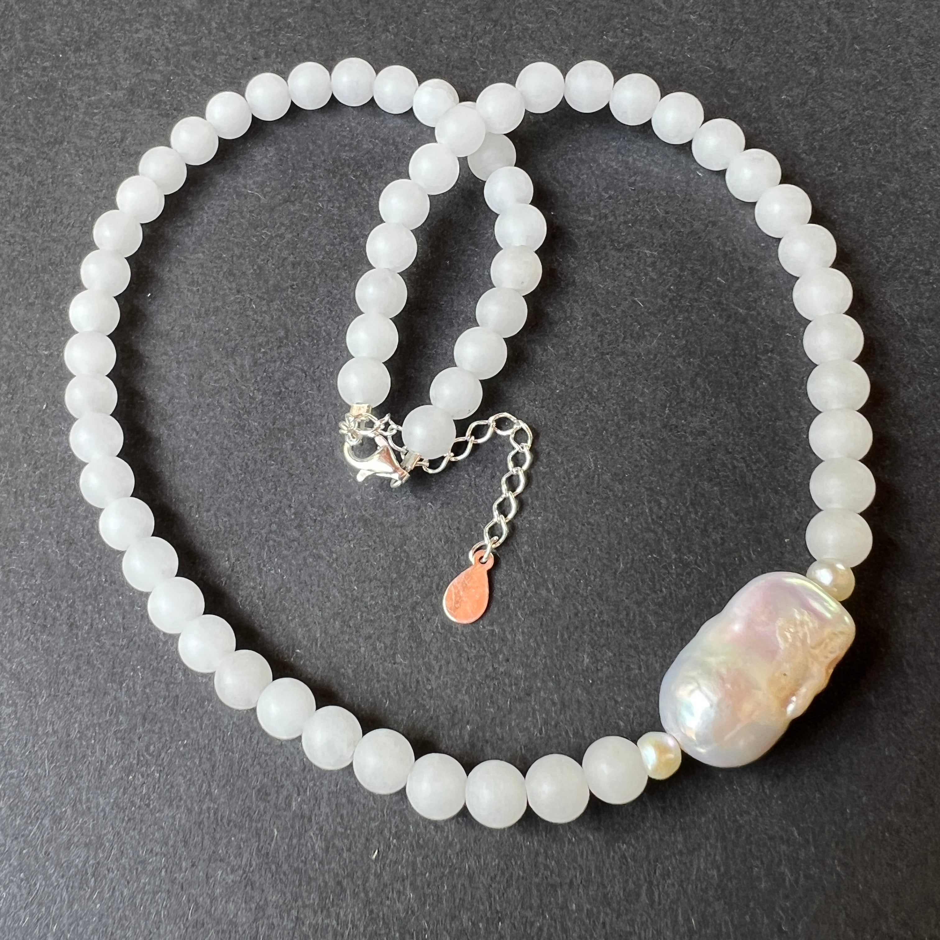 White Jade to kamień pokoju, oczyszczania i wewnętrznej równowagi. Jest znany z spokojnej, ochronnej i łagodnej energii. Perła wzmacnia te cechy poprzez nieregularną łaskę - symbol autentycznej kobiecości i naturalnego przepływu życia.