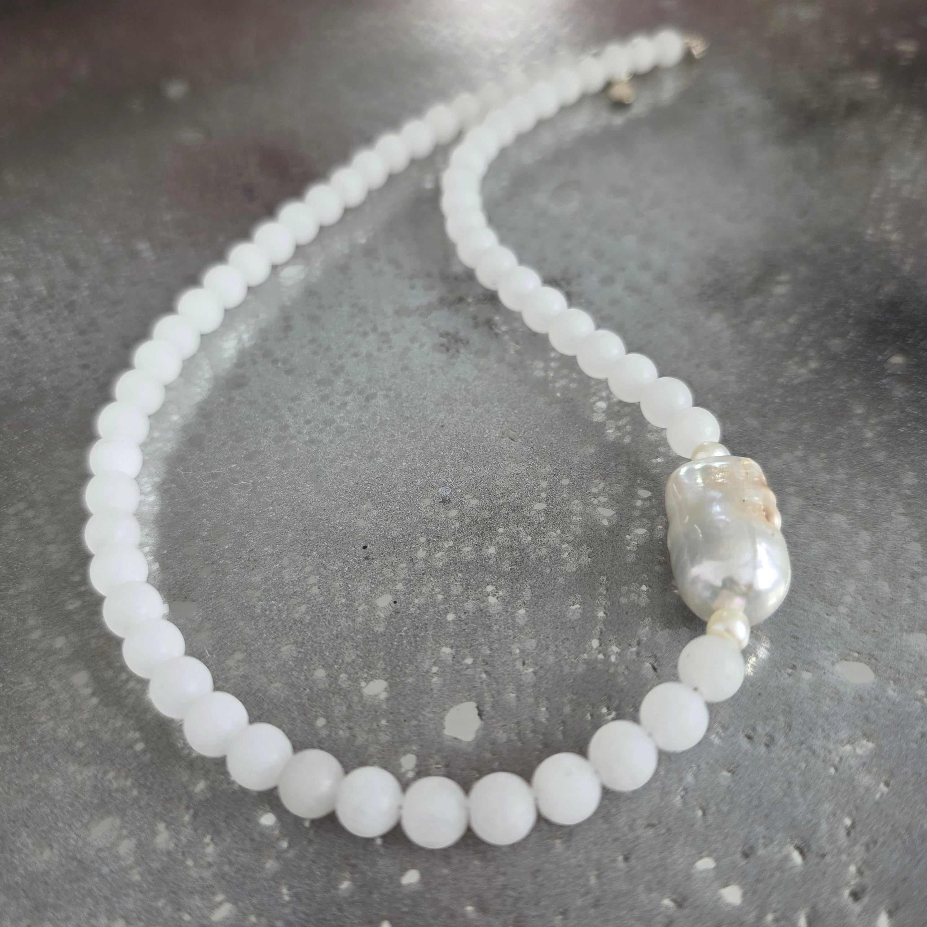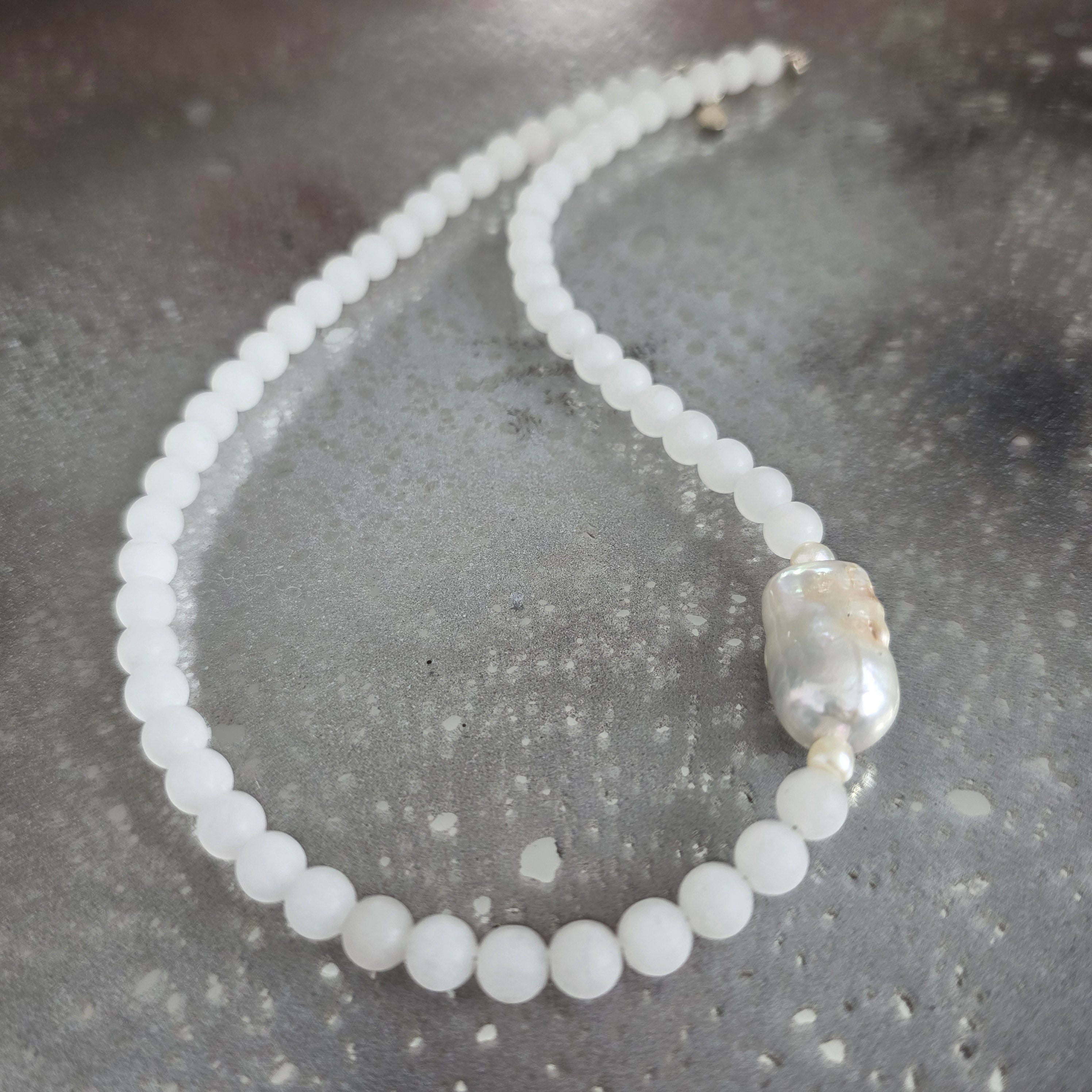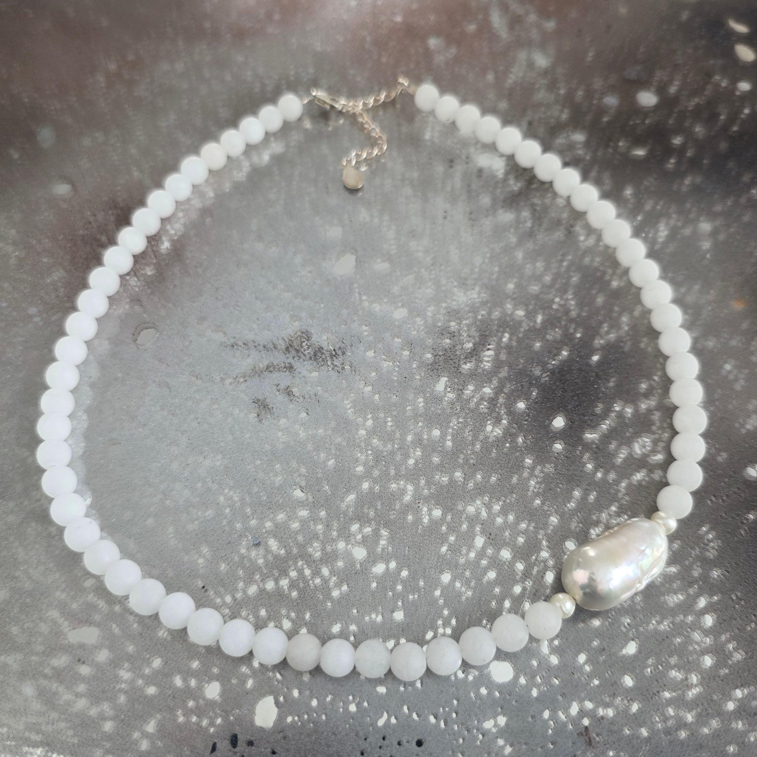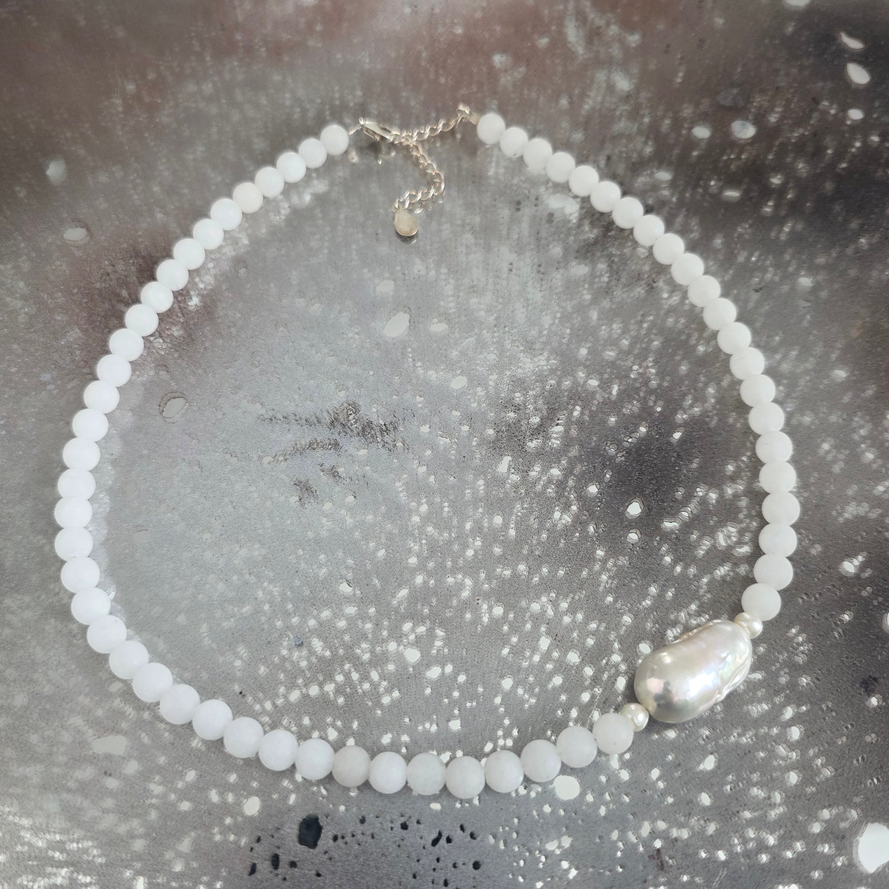 Materiały: 6 mm biały jadeit, 2 cm perła barokowa, srebro 925